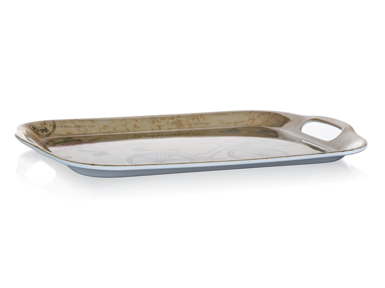 Elegantni servirni pladenj z vintage potiskom cvetlic, metuljev in kolesa je praktičen pomočnik za vsak dom. Melaminska smola zagotavlja visoko trpežnost in hkrati nizko težo, zato je rokovanje s pladnjem preprosto pri vsakodnevni uporabi.