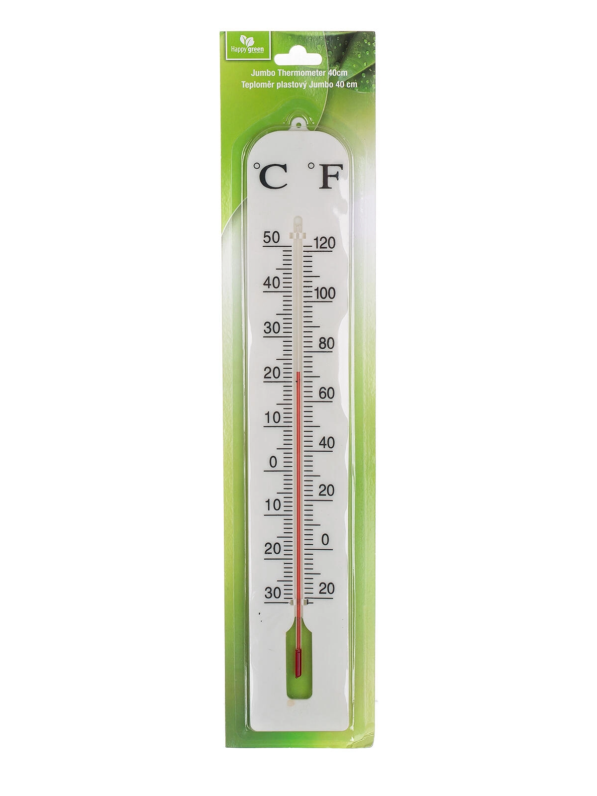 Praktični plastični termometer HAPPY GREEN Jumbo dolžine 40 cm omogoča enostavno in hitro odčitavanje temperature. Ima dve lestvici v razponu -30 do +50 °C in -20 do +120 °F, zahvaljujoč očesu za obešanje pa ga zlahka namestite na steno, balkon ali teraso.