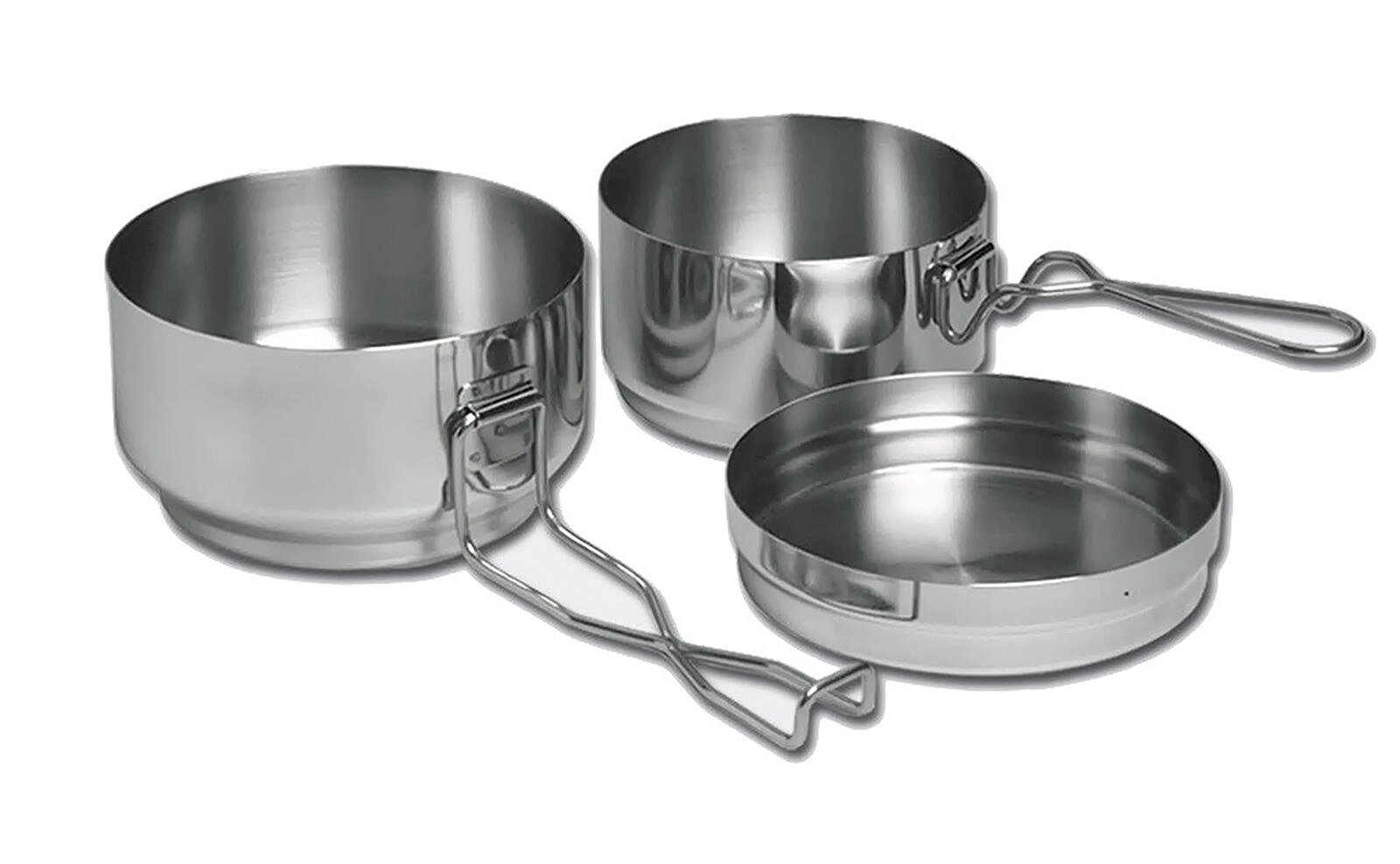Dve nerjavni posodi (1,4 l in 1 l) ter pokrov pokrivajo kuhanje, segrevanje in serviranje. Vse se zlahka zloži ena v drugo in prihrani prostor v nahrbtniku.