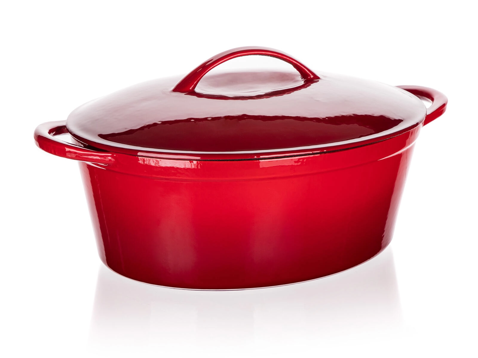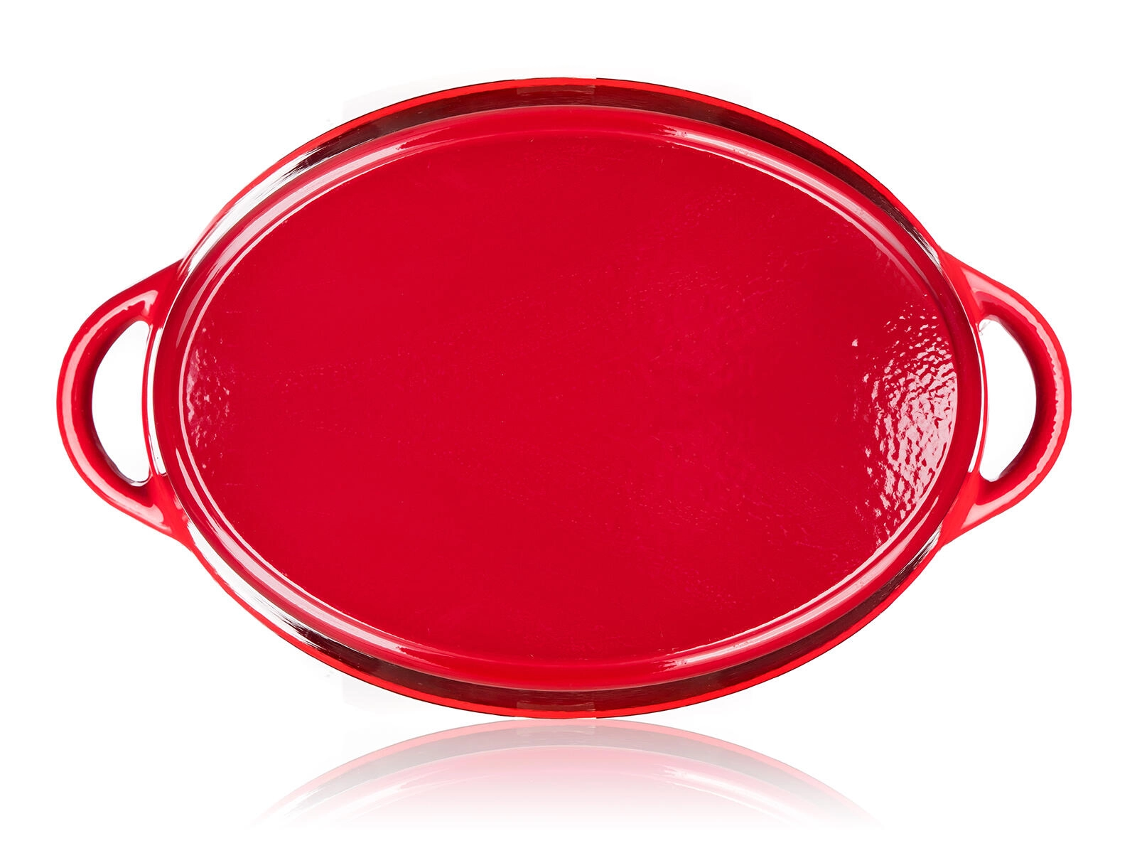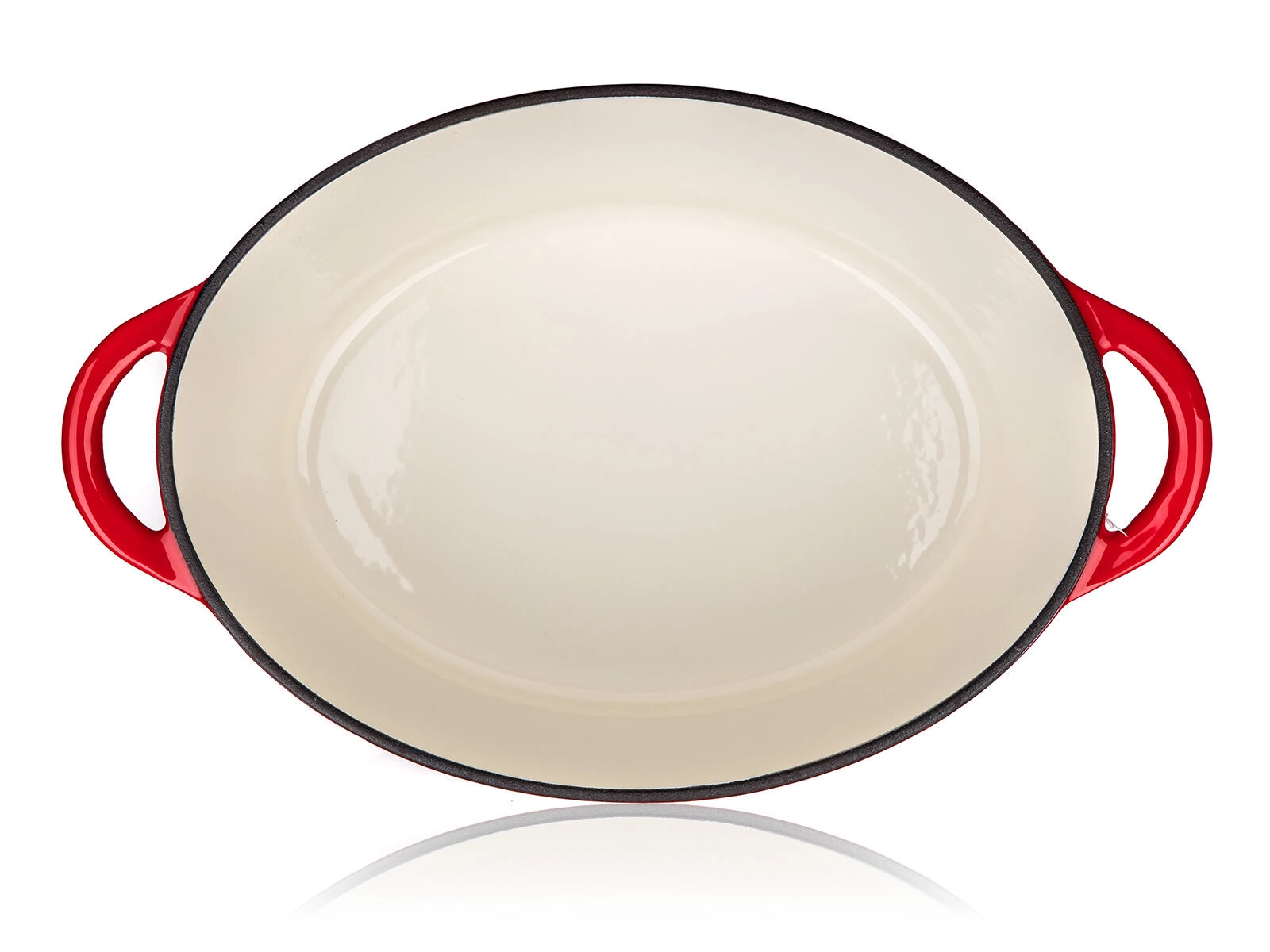 Ovalni litoželezni pekač s pokrovom v elegantni rdeči barvi izstopa po visoki akumulaciji in enakomerni porazdelitvi toplote, zato boste meso, zelenjavo in gratinirane jedi pripravili hitreje in varčneje. Notranja emajlirana nelepljiva površina zmanjšuje prijemanje in olajša čiščenje.