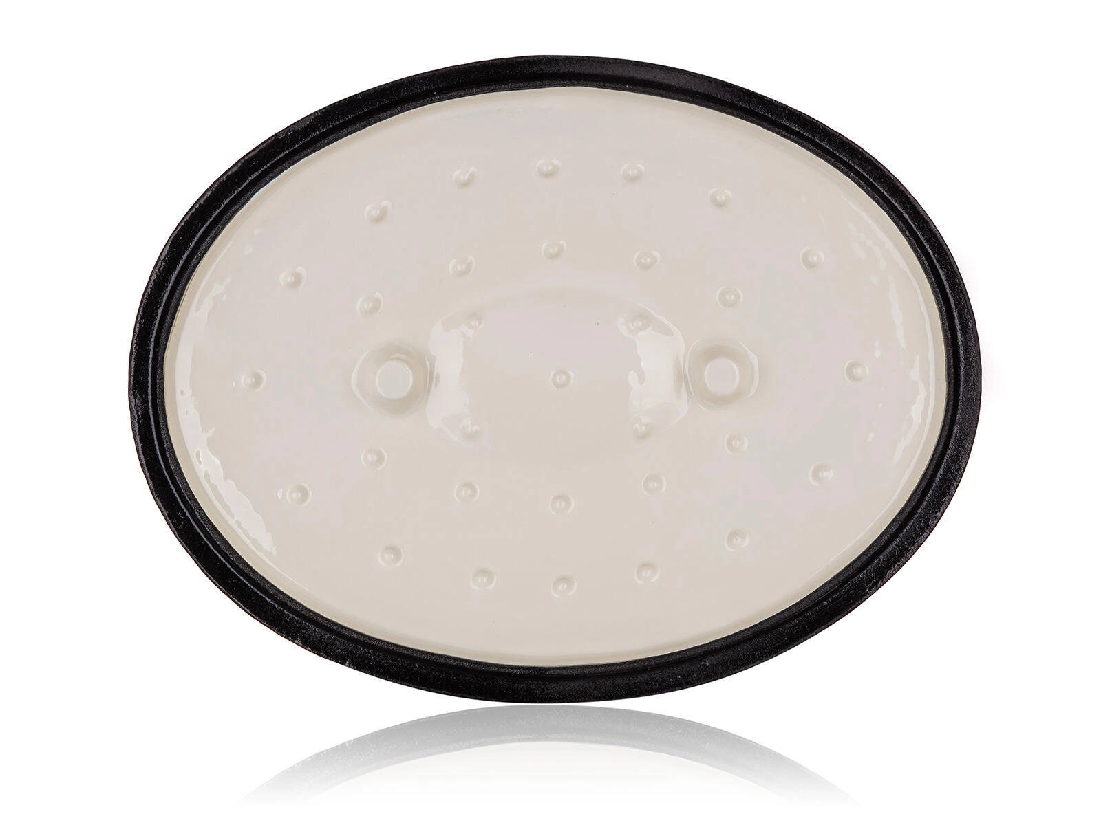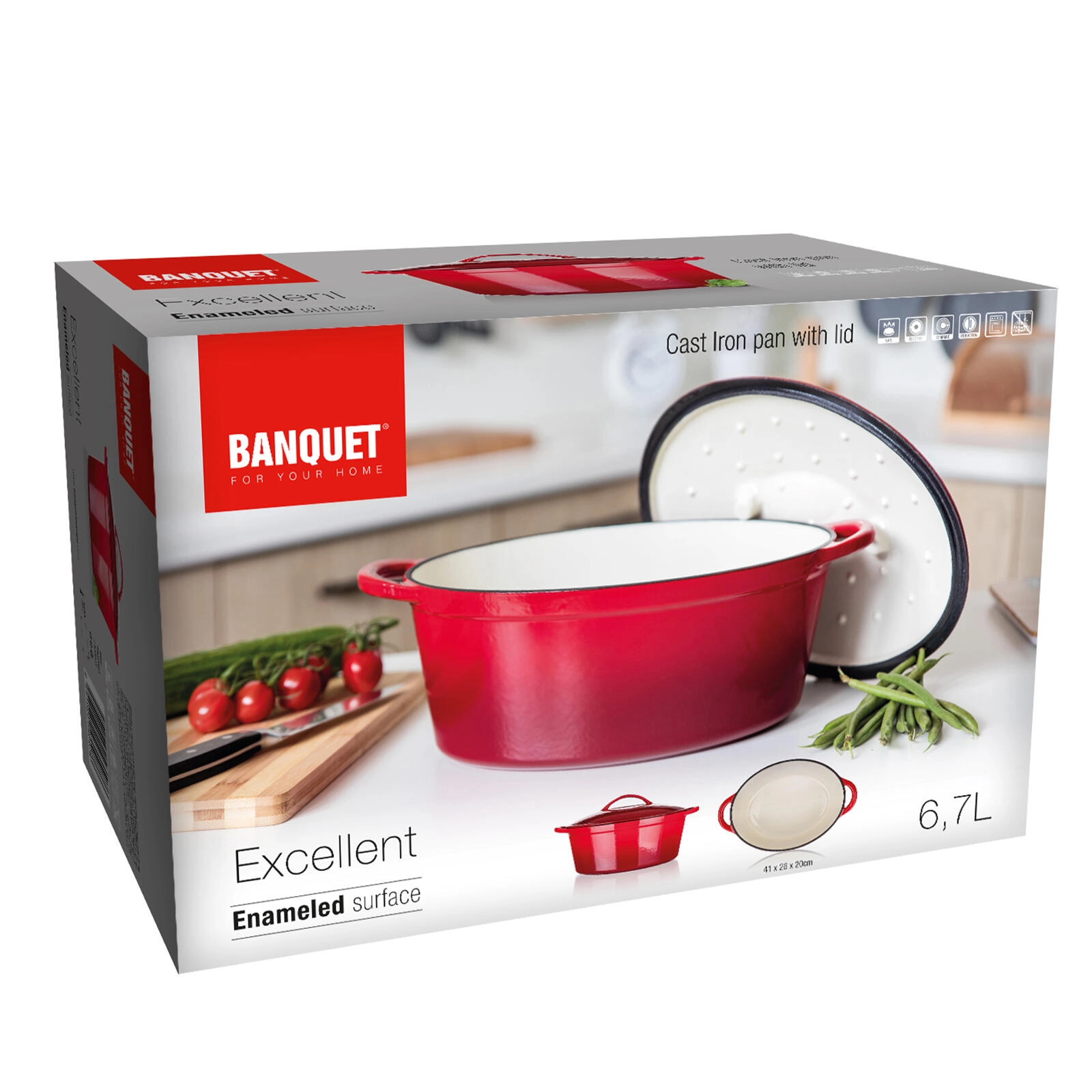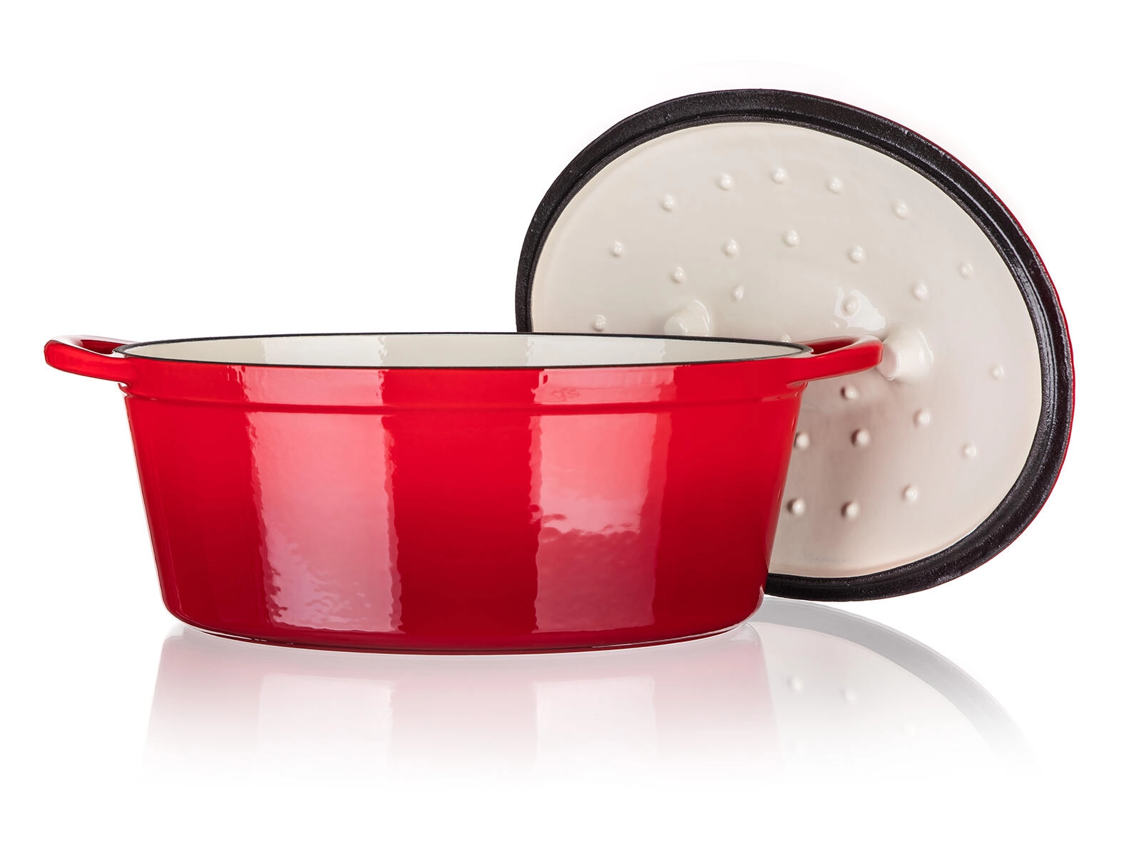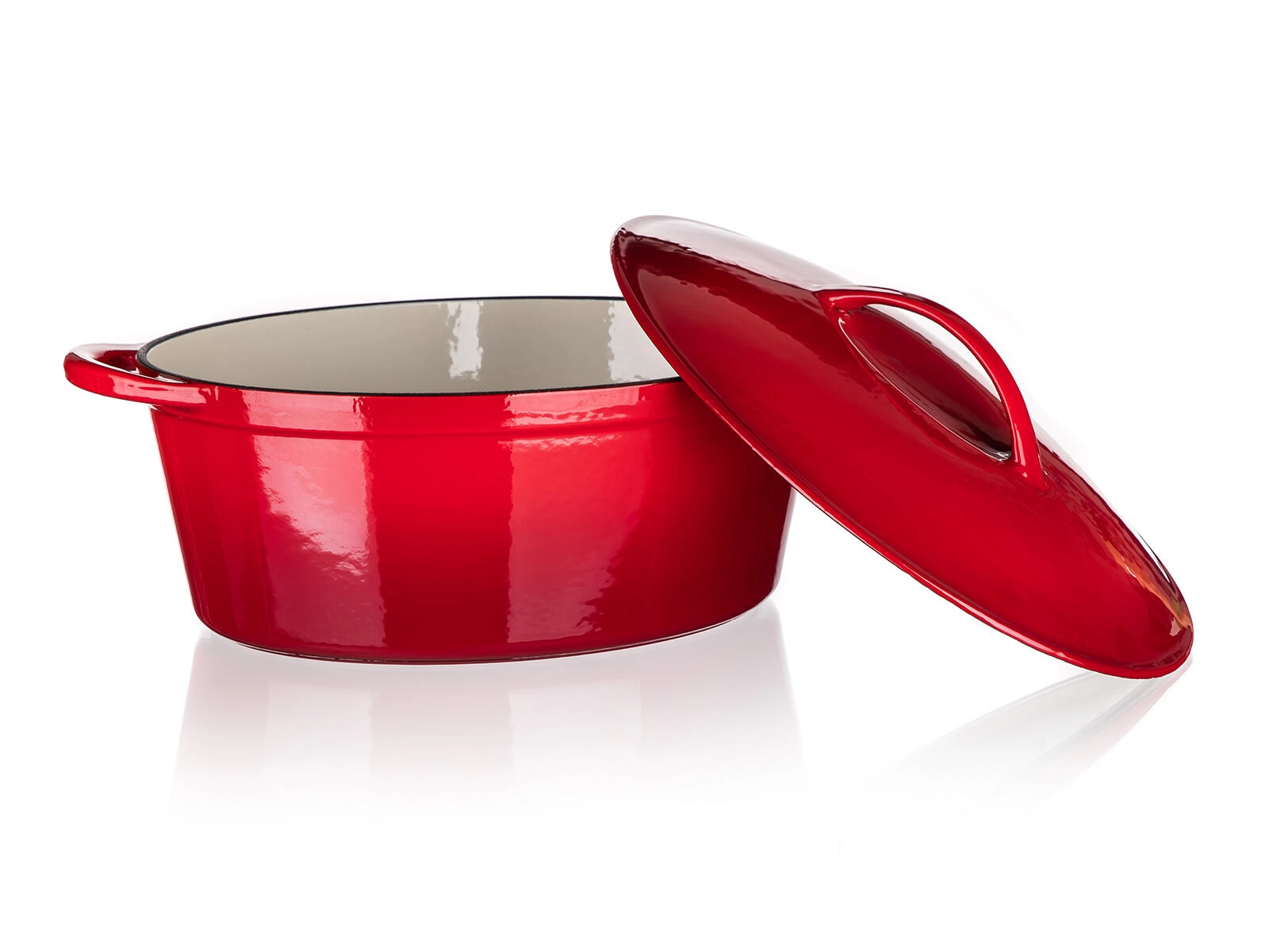 Ovalni litoželezni pekač s pokrovom v elegantni rdeči barvi izstopa po visoki akumulaciji in enakomerni porazdelitvi toplote, zato boste meso, zelenjavo in gratinirane jedi pripravili hitreje in varčneje. Notranja emajlirana nelepljiva površina zmanjšuje prijemanje in olajša čiščenje.