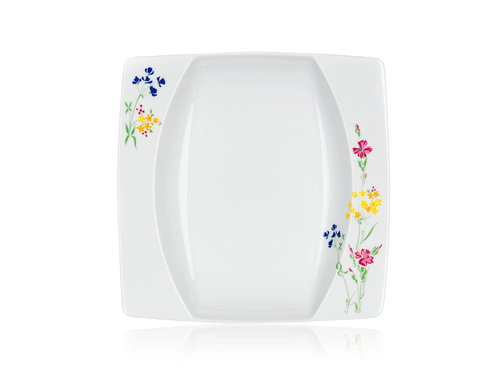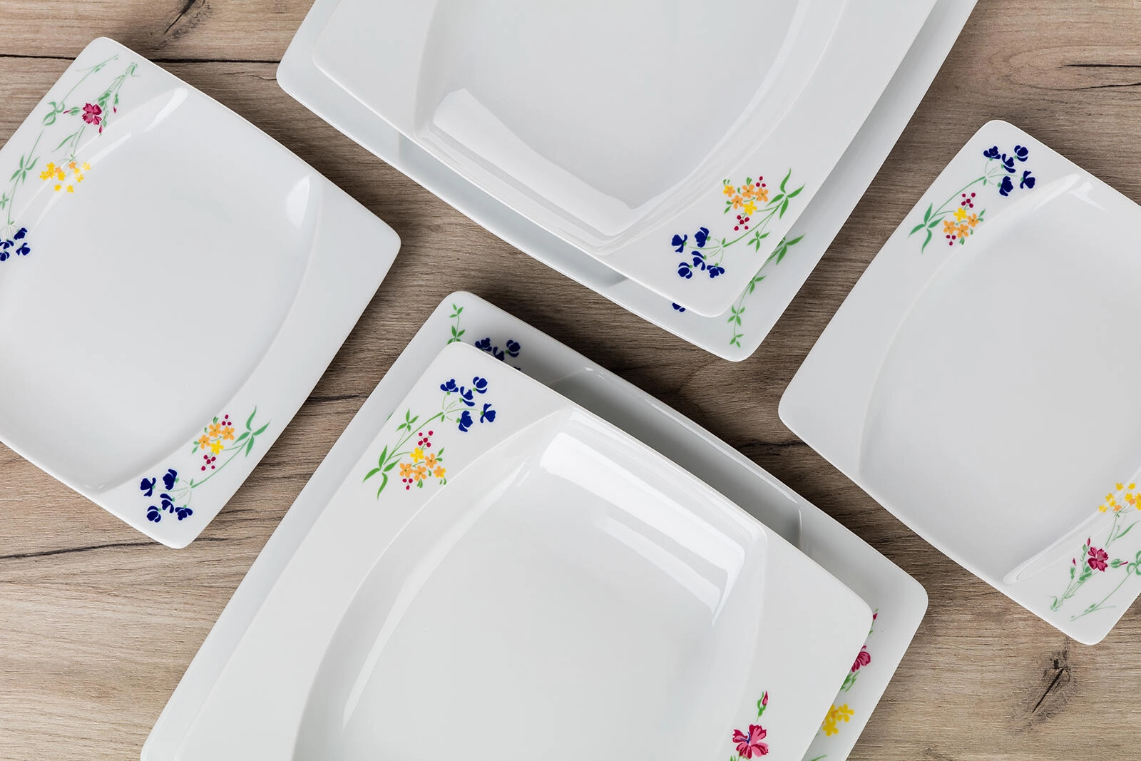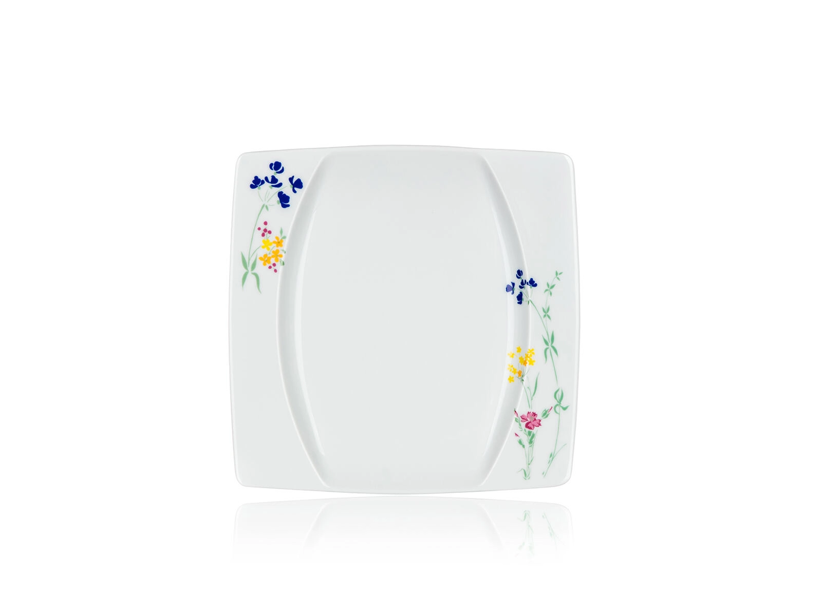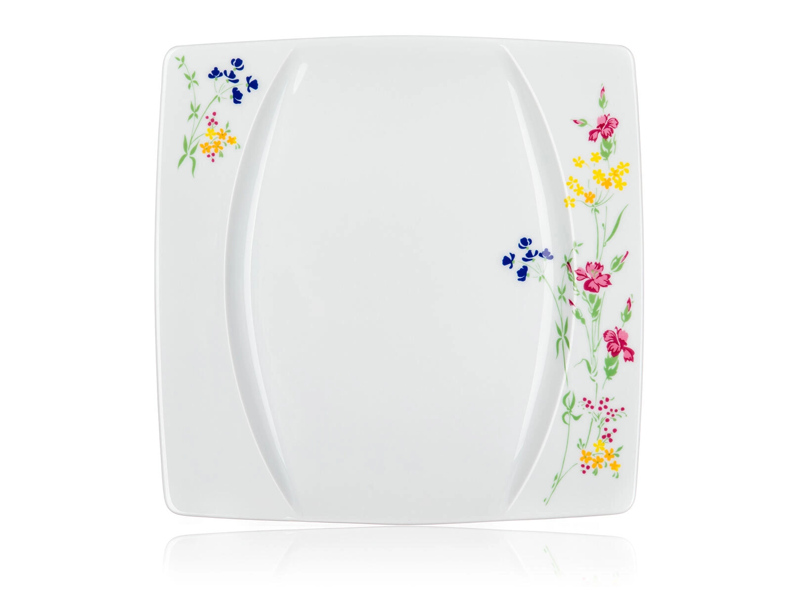 Ta brezčasni kvadratni komplet združuje eleganten dizajn s praktično vsakodnevno uporabo. Nežen cvetlični motiv na robovih in bleščeča glazura poudarjata praznično in vsakdanjo pogostitev. Zahvaljujoč trpežnemu porcelanu THUN se krožniki preprosto vzdržujejo in dolgoročno ohranjajo barve ter sijaj.
