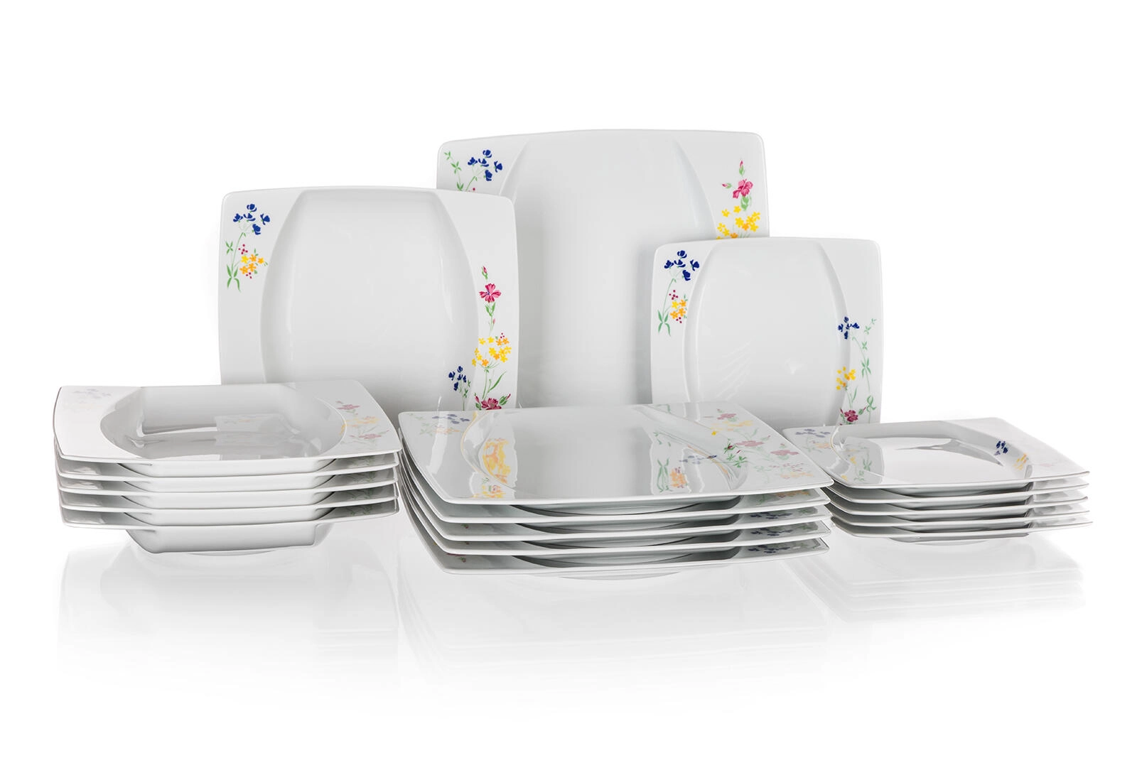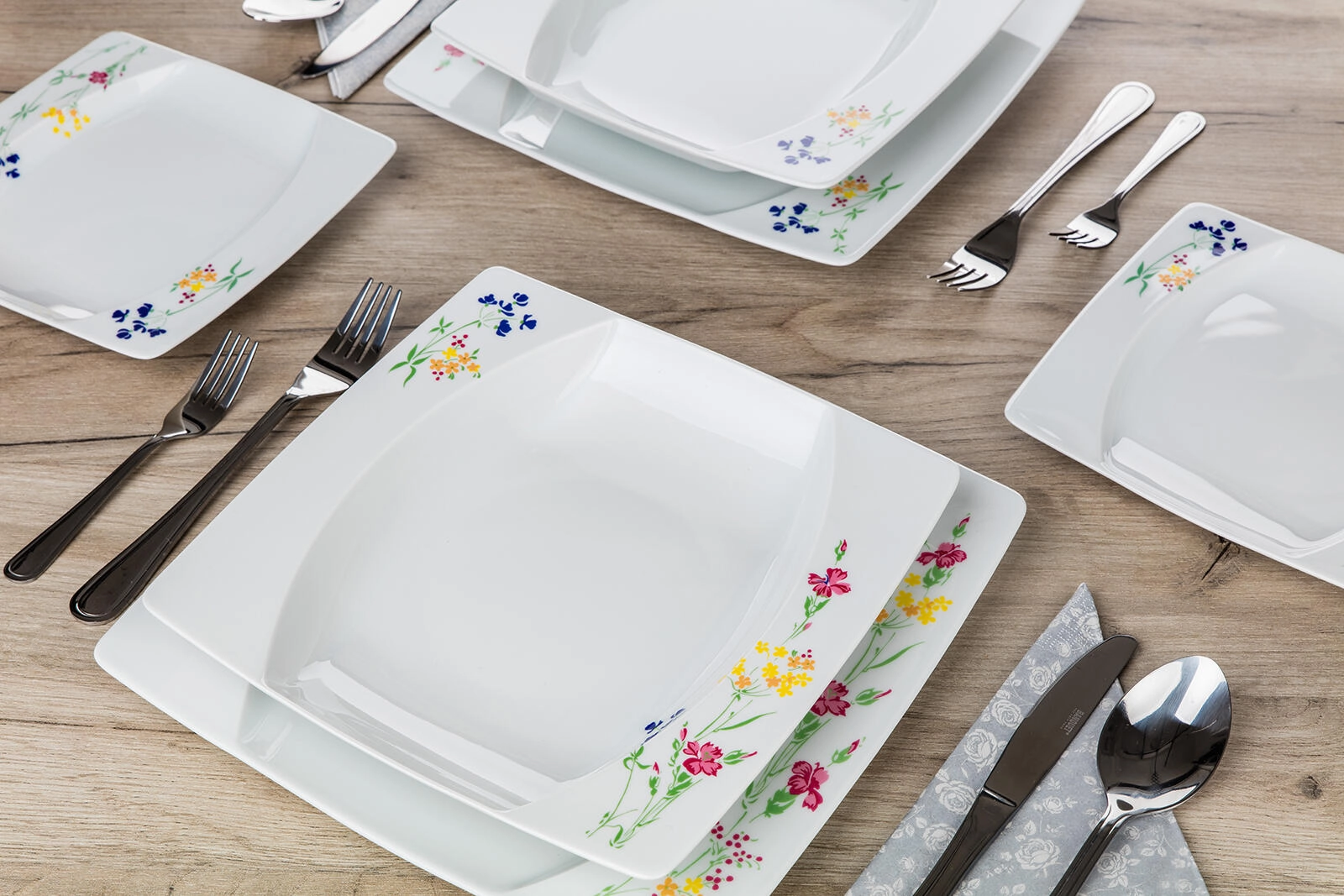 Elegantna 18-delna jedilna garnitura EYE iz kakovostnega porcelana THUN v sodobni kvadratni obliki doda vaši mizi svež slog. Krožniki z nežnim cvetličnim dekorjem imajo bleščečo površino, so zložljivi in primerni za pomivalni stroj ter mikrovalovno pečico.