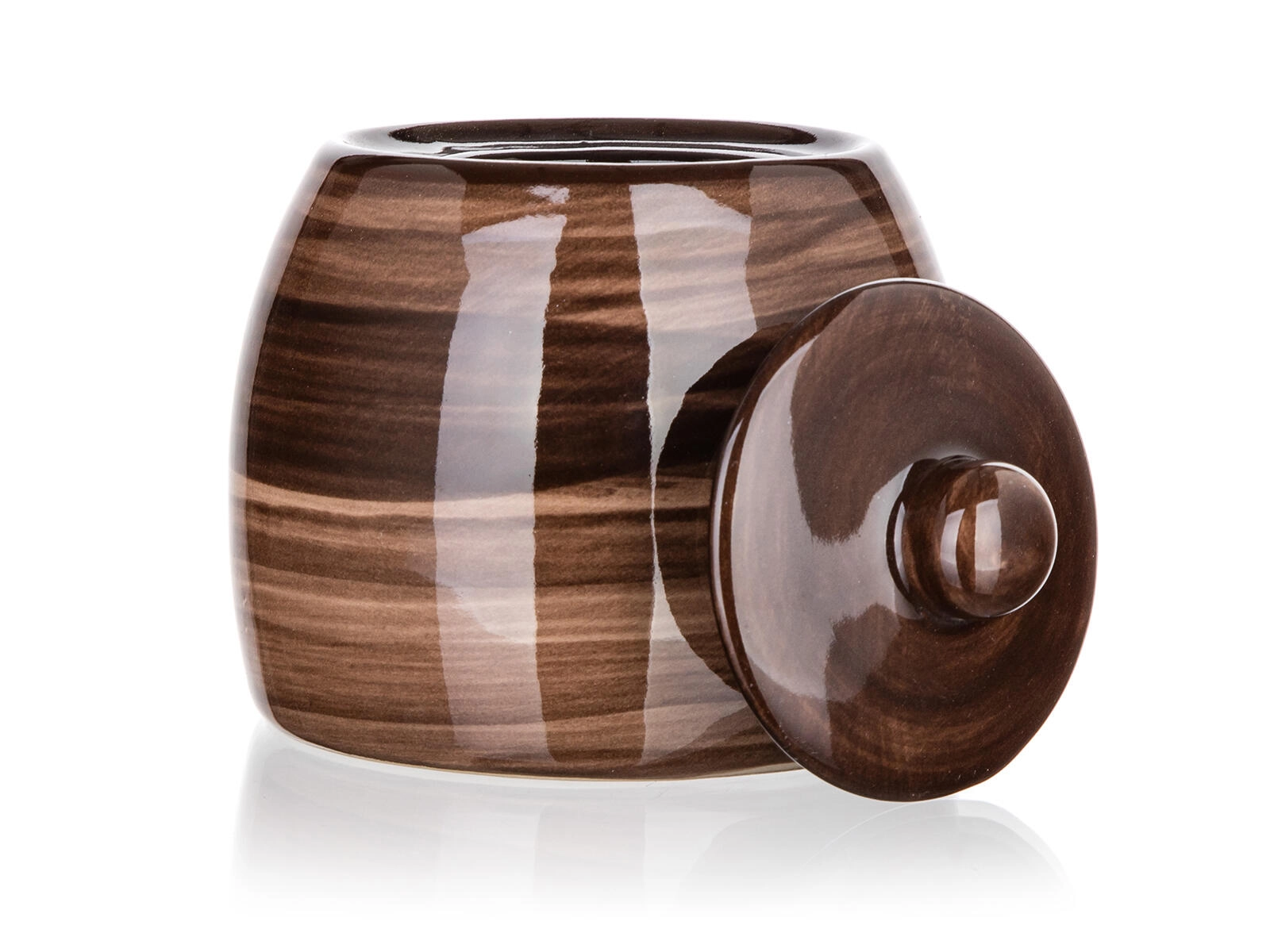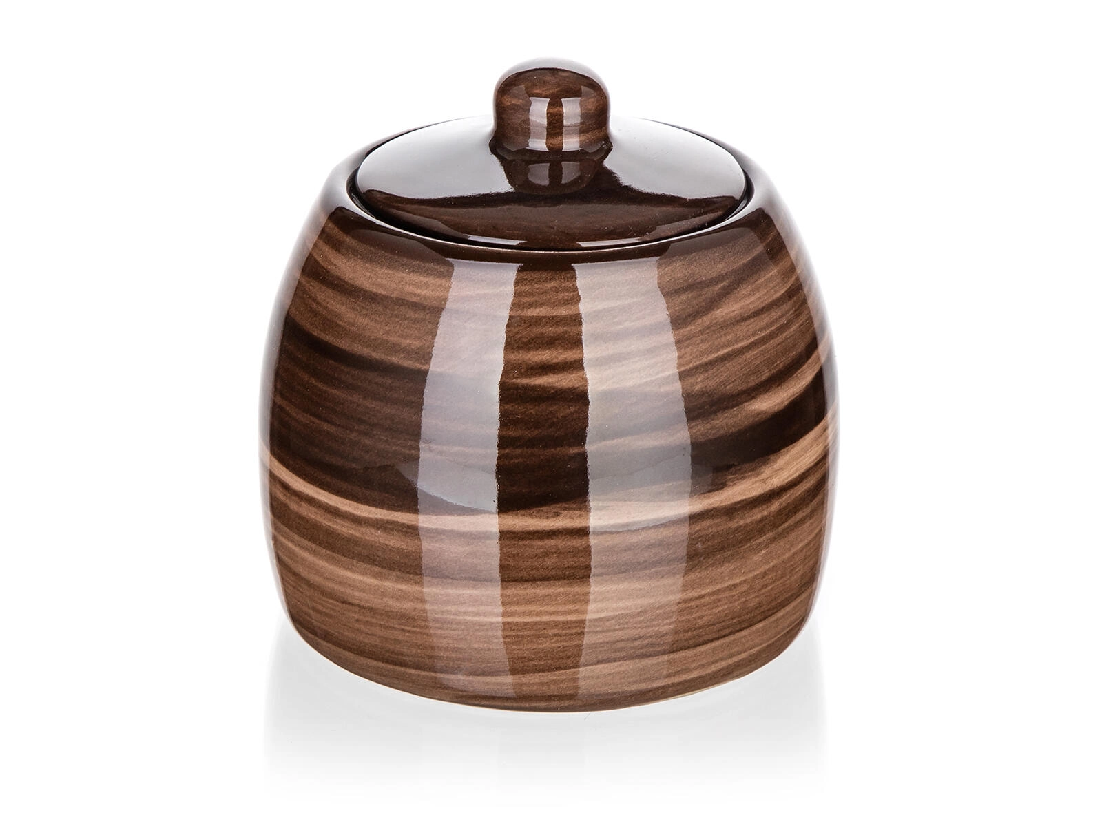 Rjava keramična posodica za sladkor Palas se poda tako v klasične kot moderne kuhinje. Stilska glazura z nežnim lesenim vzorcem doda vašemu pogrinjku topel in naraven značaj, medtem ko pokrovček z udobnim oprijemom ščiti vsebino pred vlago in nečistočami.