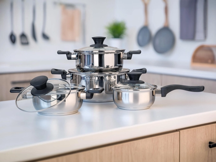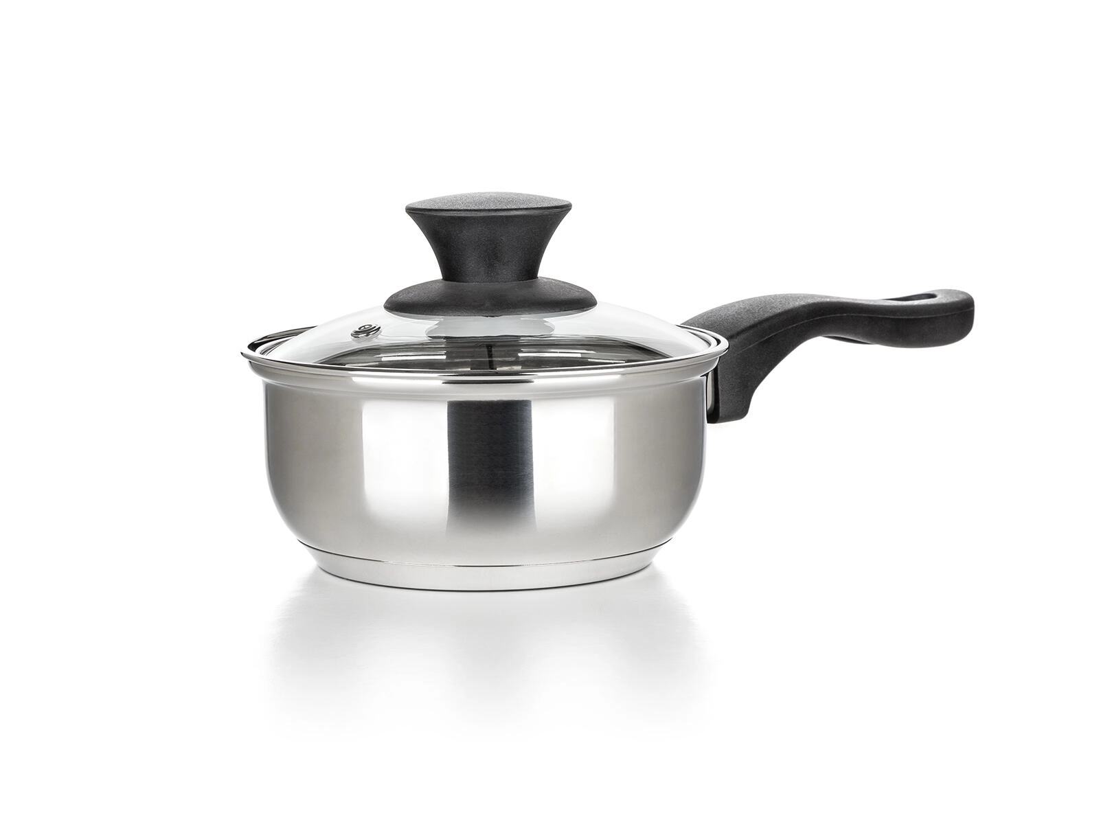 Vsebina kompleta: kozica 14 × 7 cm s steklenim pokrovom, lonci 16 × 8 cm, 18 × 9 cm in 22 × 11 cm – vsi s steklenimi pokrovi. Idealna izbira za prvo kuhinjo ali kot zanesljiva osvežitev obstoječe opreme.
