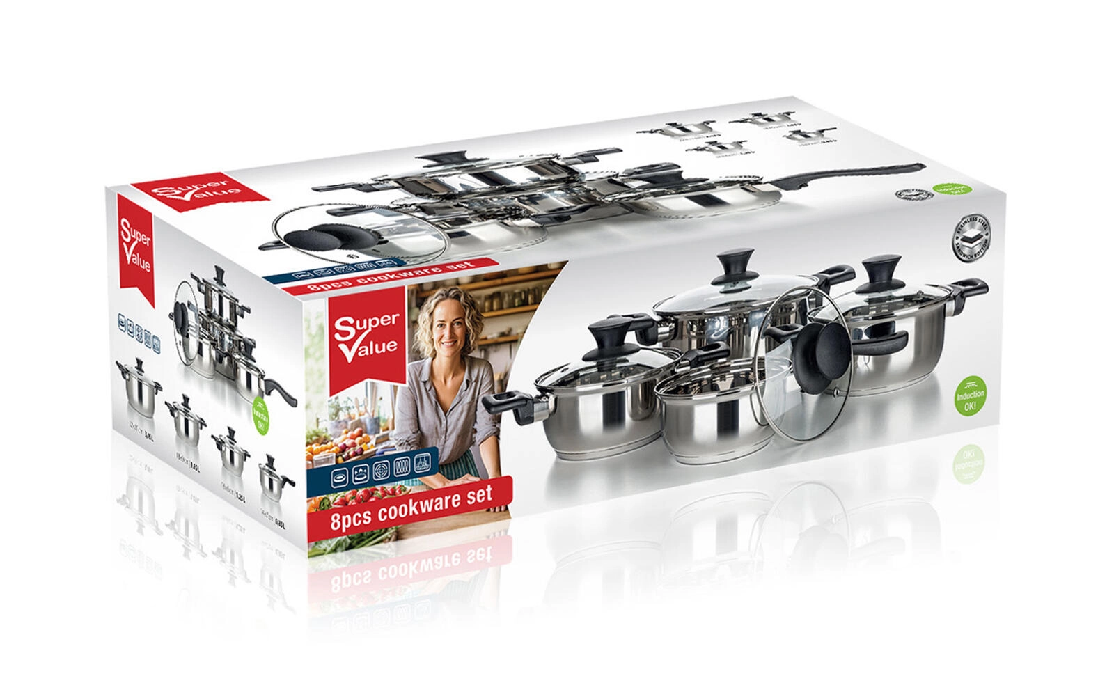 Kompleten 8-delni komplet nerjavečega posodja Super Value za vsakodnevno kuhanje. Trpežno nerjaveče jeklo z bleščečo površino, kaljena steklena pokrova z parnim ventilom ter združljivost z vsemi vrstami štedilnikov, vključno z indukcijo. Enostavno vzdrževanje in možnost pomivanja v pomivalnem stroju.