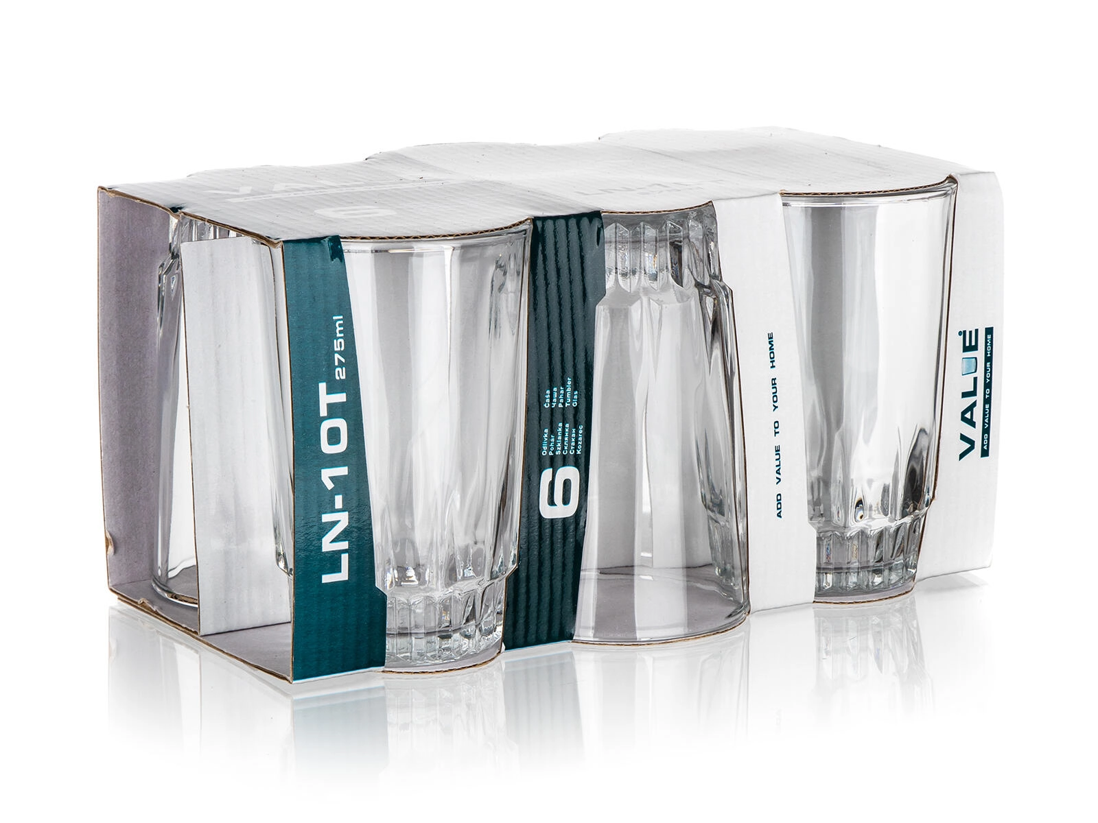 Set šestih univerzalnih kozarcev VALUE s prostornino 275 ml prinaša brezčasen videz za vsako mizo. Trdno, teksturirano dno zagotavlja odlično stabilnost in odpornost proti prevrnitvi, medtem ko gladke stene olajšajo pomivanje in vsakodnevno uporabo.