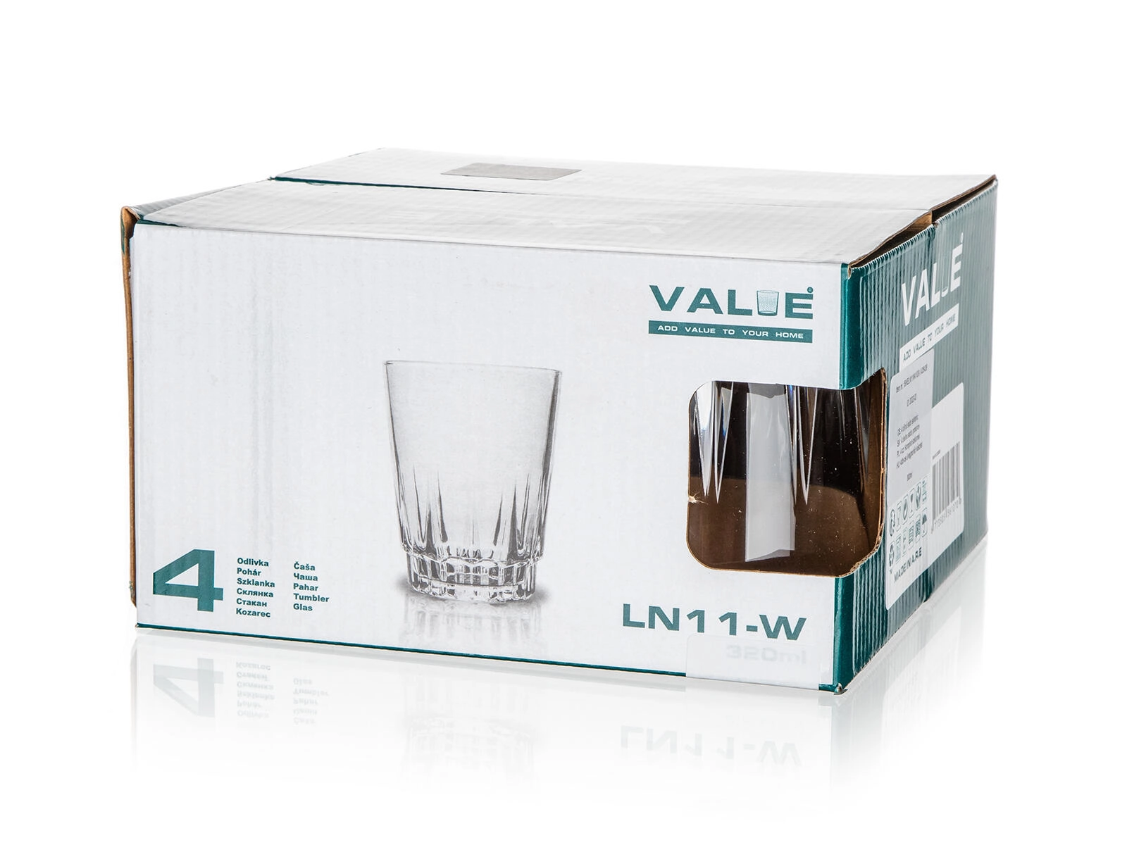 Eleganten komplet štirih kozarcev VALUE s prostornino 300 ml za vsakodnevno uporabo in slavnostne trenutke. Kozarci z odpornim, debelim dnom, fazetnim dizajnom in udobnim oprijemom odlično služijo za vodo, sok ali viski. Dobavljeno v okrasni darilni embalaži.