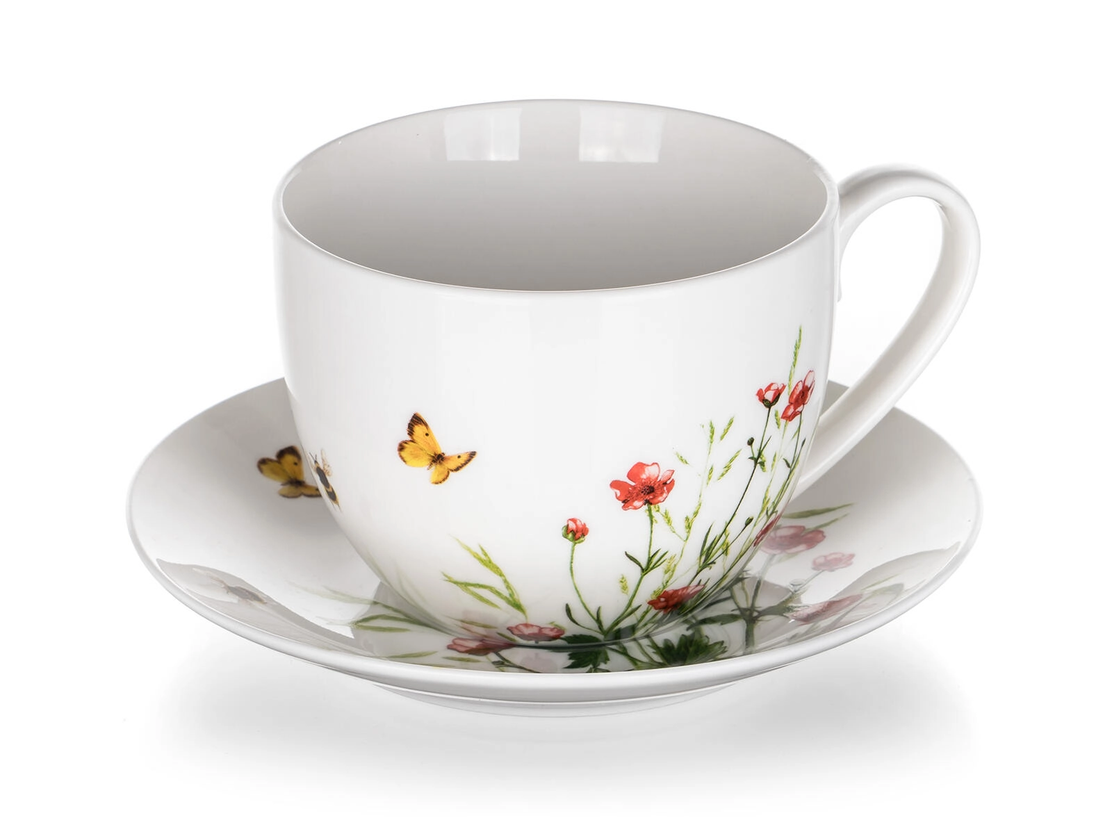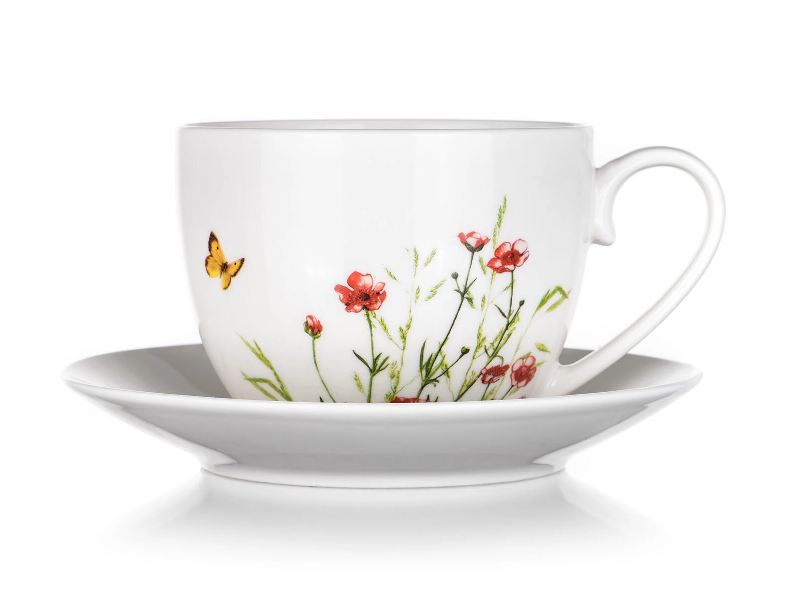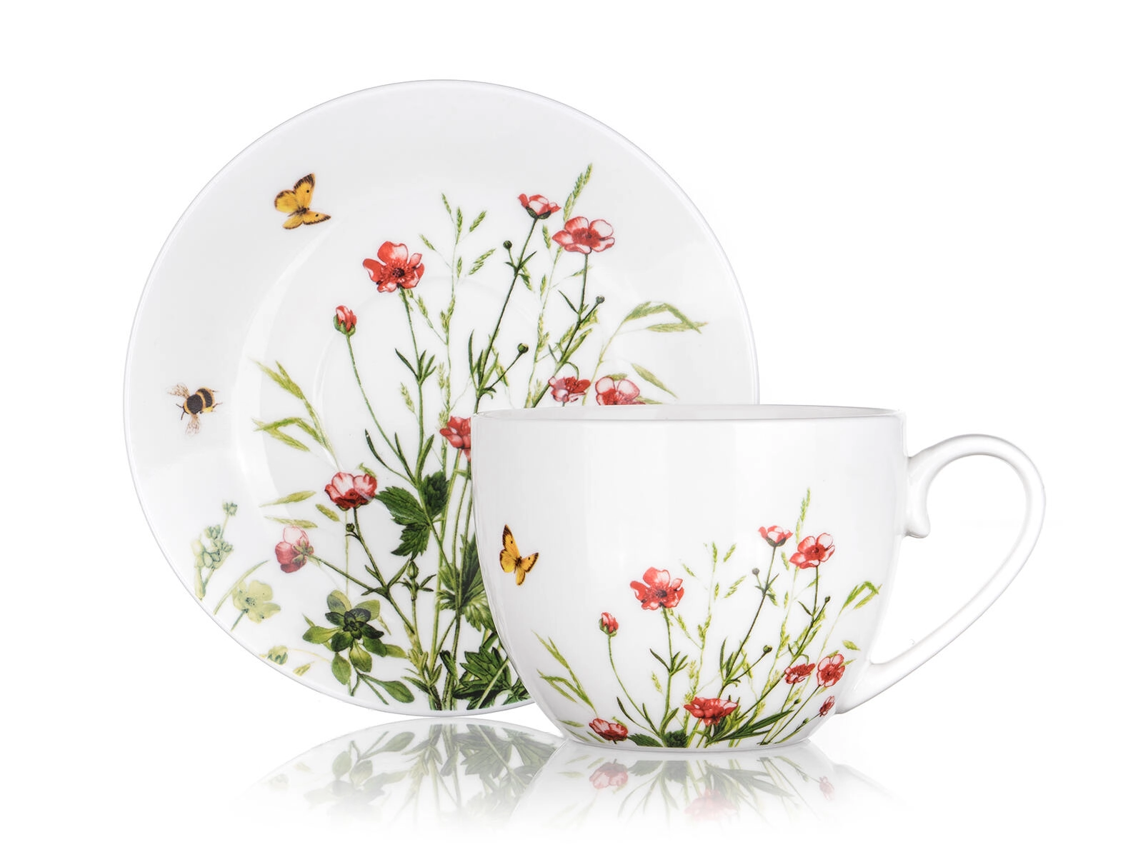 Uživajte v najljubši pijači v skodelici MEADOW z nežnim motivom travniškega cvetja in metuljev. Bela glazura in dekor dodata postrežbi eleganten pridih ter se zlahka vključita v moderno ali tradicionalno kuhinjo. Set vsebuje skodelico z udobnim ročajem in popolnoma prilegajoči se krožniček za stabilno odlaganje brez kapljic.