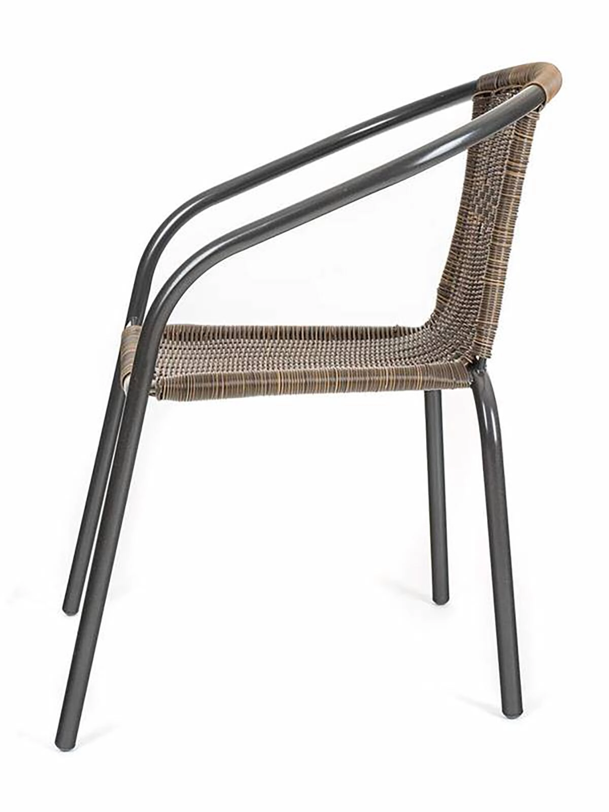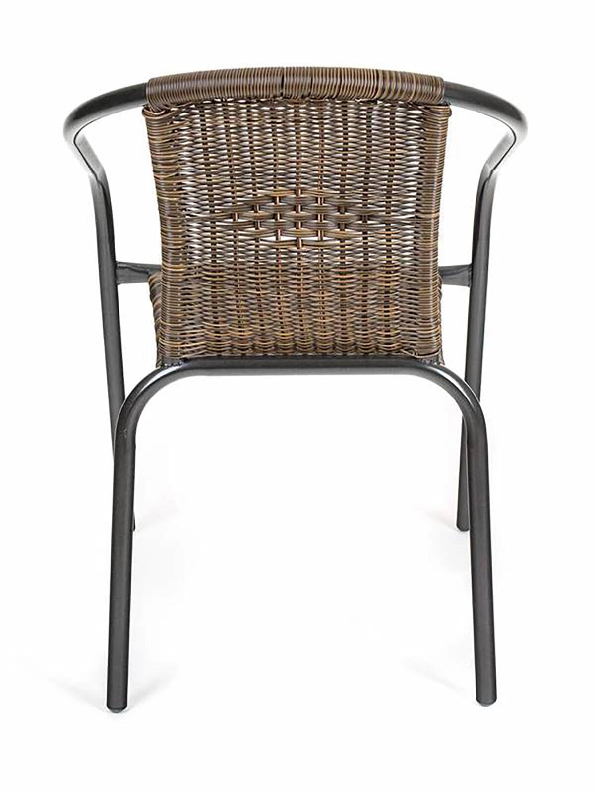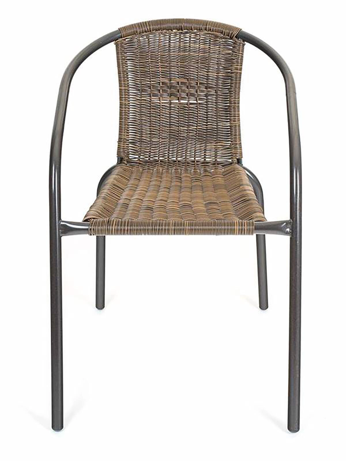 Ta vsestranski zunanji stol združuje zračen videz pletenja s trdnostjo jeklene konstrukcije. Ukrivljeni naslonjali za roke in ergonomsko naslonjalo zagotavljajo udobje, medtem ko sintetični ratan v rjavem tonu deluje naravno in je enostaven za vzdrževanje.