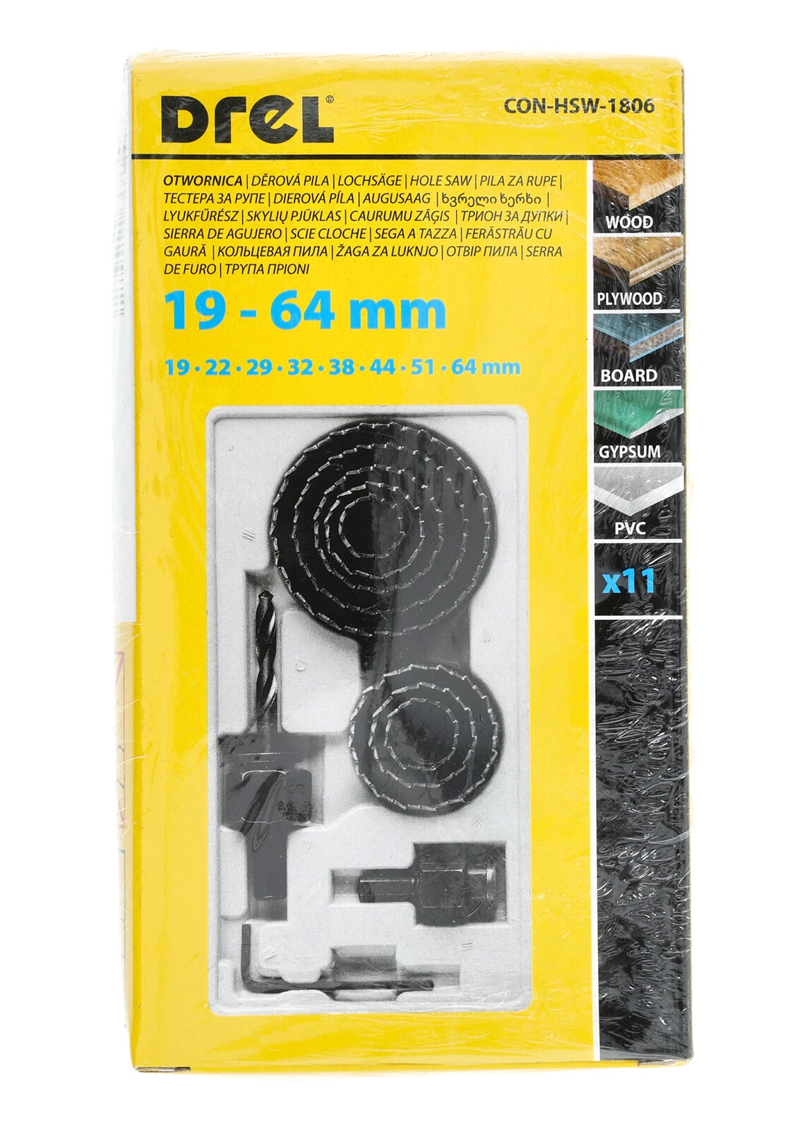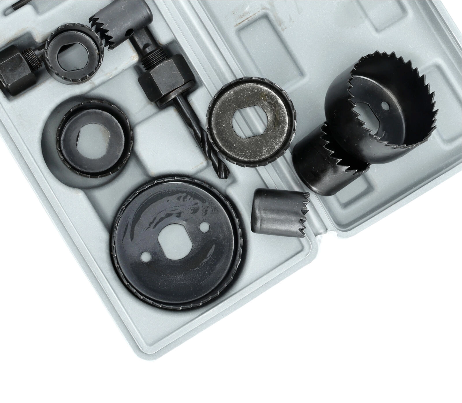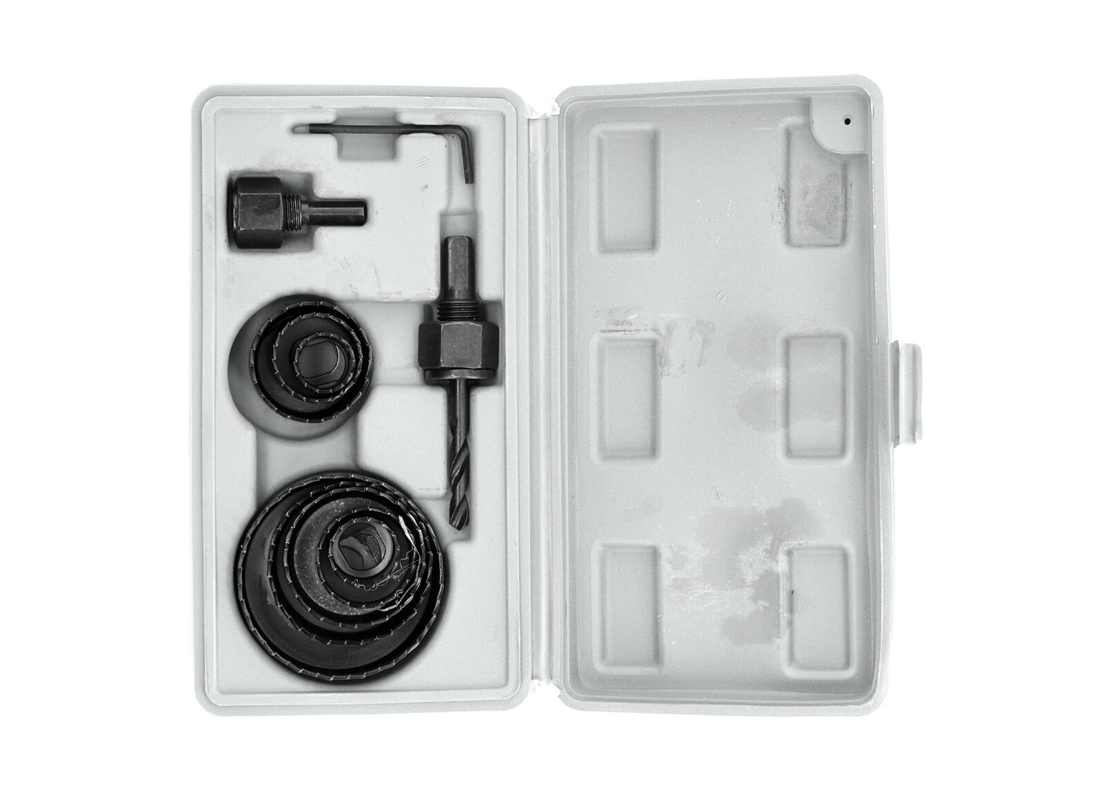 Ta 11-delni set izrezovalnih kron omogoča hitro in čisto izdelavo krožnih odprtin v lesu in mavčnokartonu. Zahvaljujoč širokemu razponu premerov 19–64 mm boste zlahka izvedli montažo vtičnic, uvodnice za kable v mizi ter druga inštalacijska dela.