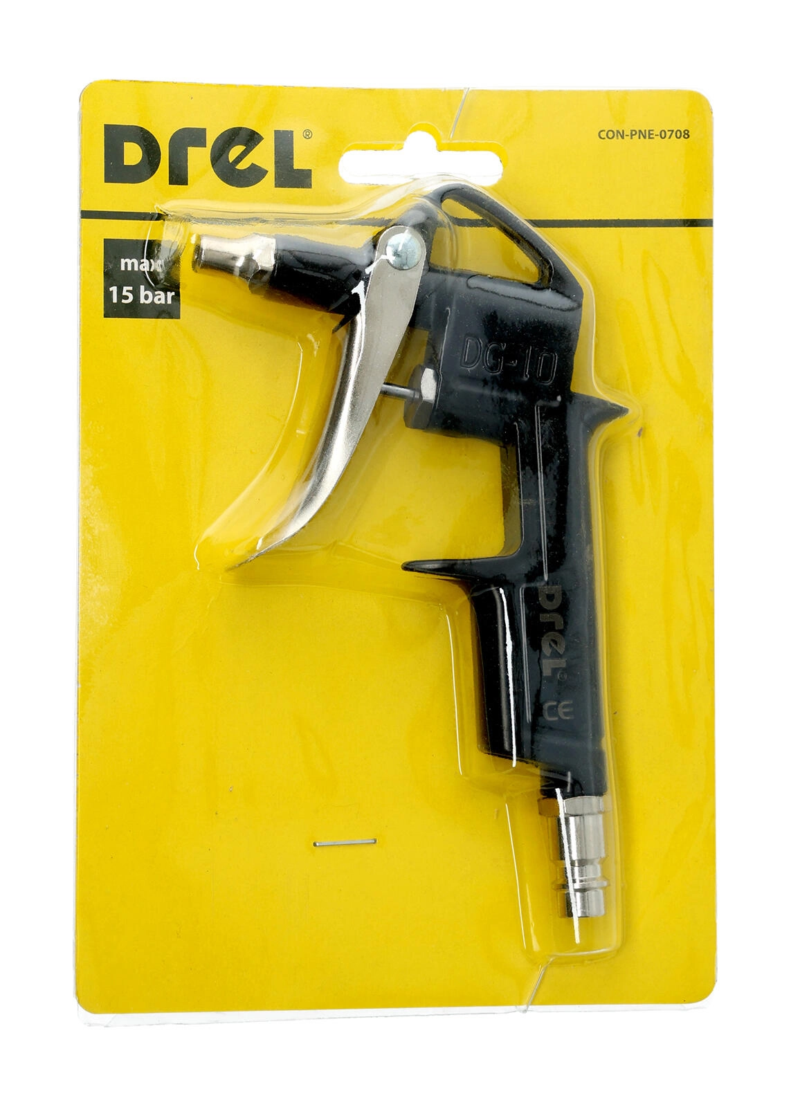 Kompaktna pihalna pištola Drel za hitro čiščenje in sušenje s stisnjenim zrakom. Ponuja največji tlak 15 barov, aluminijasto ohišje za vzdržljivost, kratko šobo 20 mm za natančno delo in hitro spojko 1/4" za enostavno priključitev.