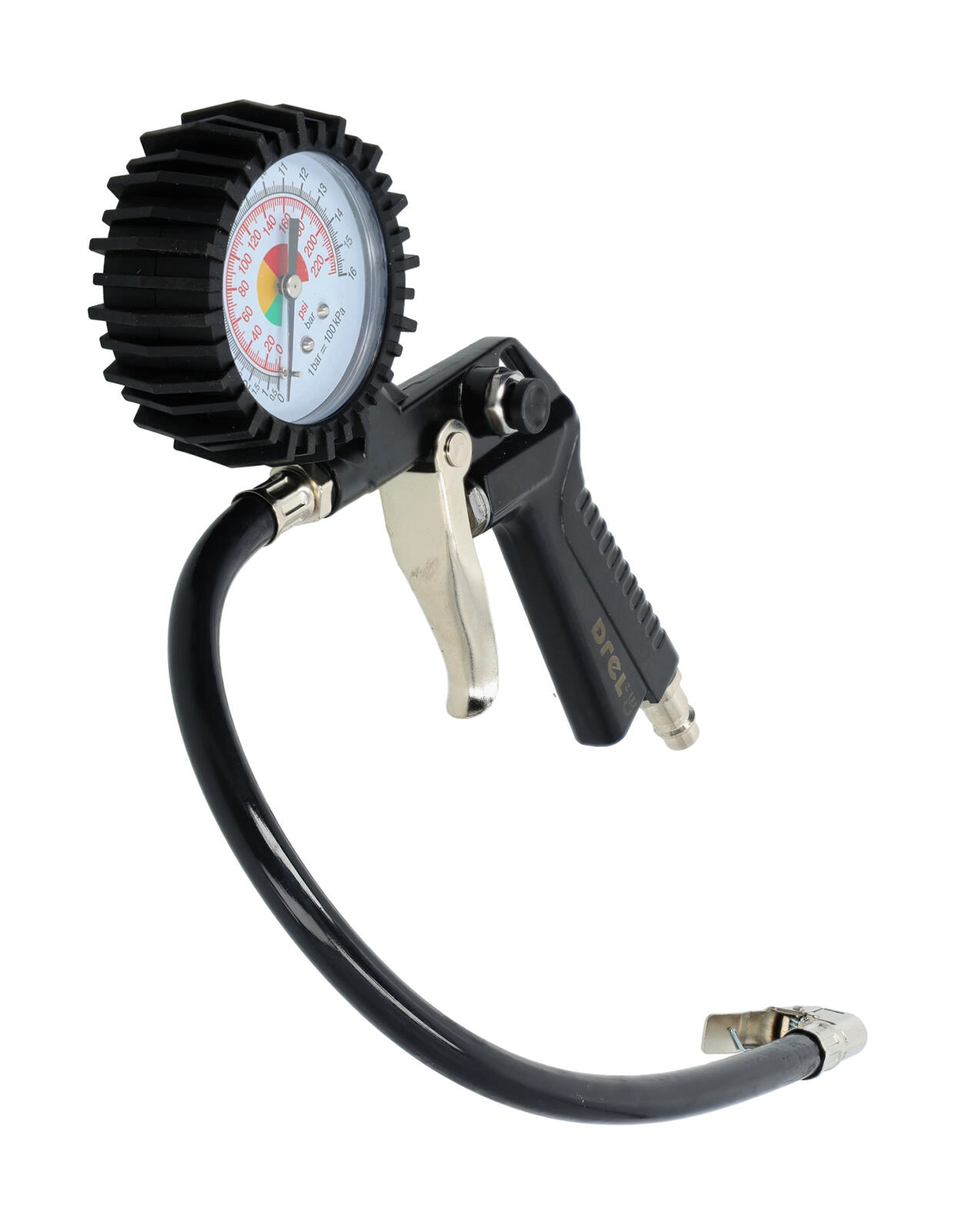 Praktična pihalna pištola Drel z vgrajenim manometrom in cevjo dolžine 37 cm je idealna za hitro in natančno napihovanje pnevmatik in drugih predmetov. Zahvaljujoč analognemu manometru zlahka preverite tlak v PSI in barih, ergonomski sprožilec pa zagotavlja nemoteno uravnavanje pretoka zraka, medtem ko je vzdržljiva zasnova pripravljena za vsakodnevno uporabo v delavnici in garaži.