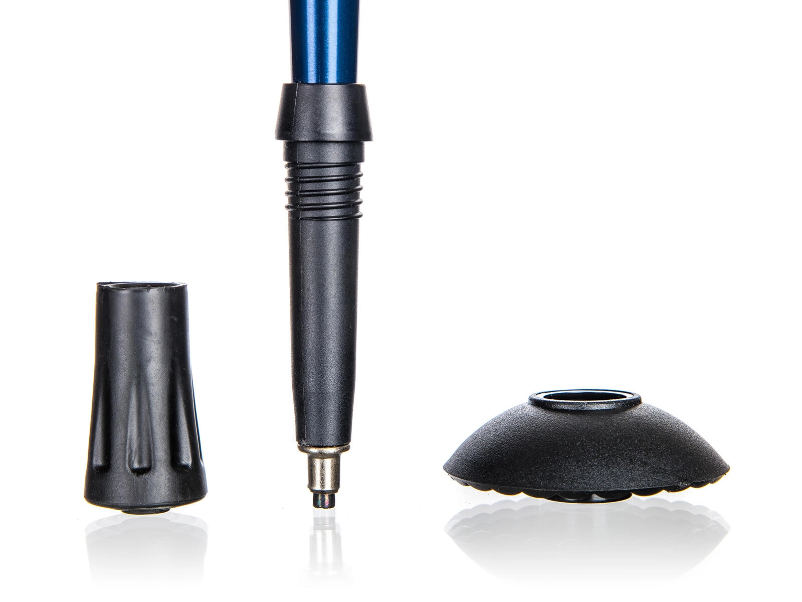 Ergonomski gumirani oblikovani ročaj s trakovi nudi zanesljiv in udoben oprijem. Jeklena konica se dobro oprime mehkega podlage in učinkovito prenaša silo za največjo stabilnost, medtem ko je gumijasta nastavka idealna za trde in ravne površine. Zamenljivi krožniki omogočajo celoletno uporabo – širše krožnike boste cenili na snegu.
