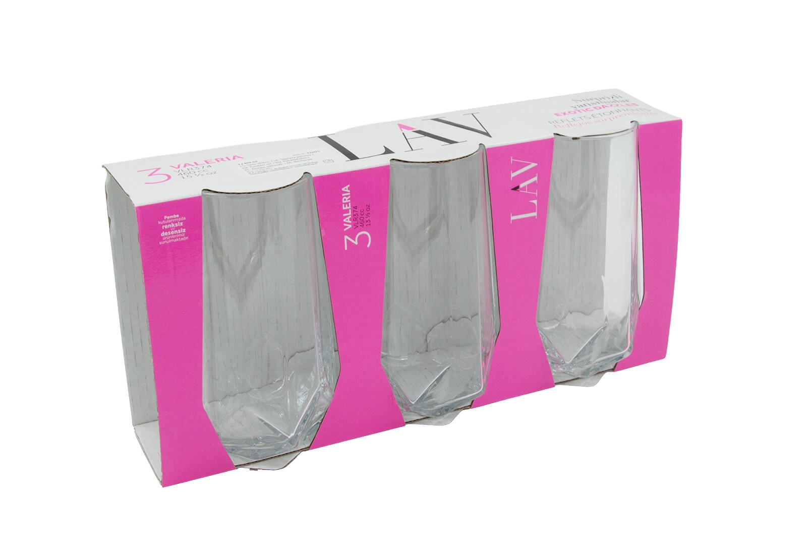 Kozarci VALERIA s prostornino 460 ml so odlični za vodo, limonade, brezalkoholne koktajle in mešane pijače. Čisto steklo poudari barvo pijače, visoka izvedba pa na vsaki mizi deluje elegantno. Celoten komplet po 3 kose je primeren za gospodinjstvo ali kot praktično darilo.