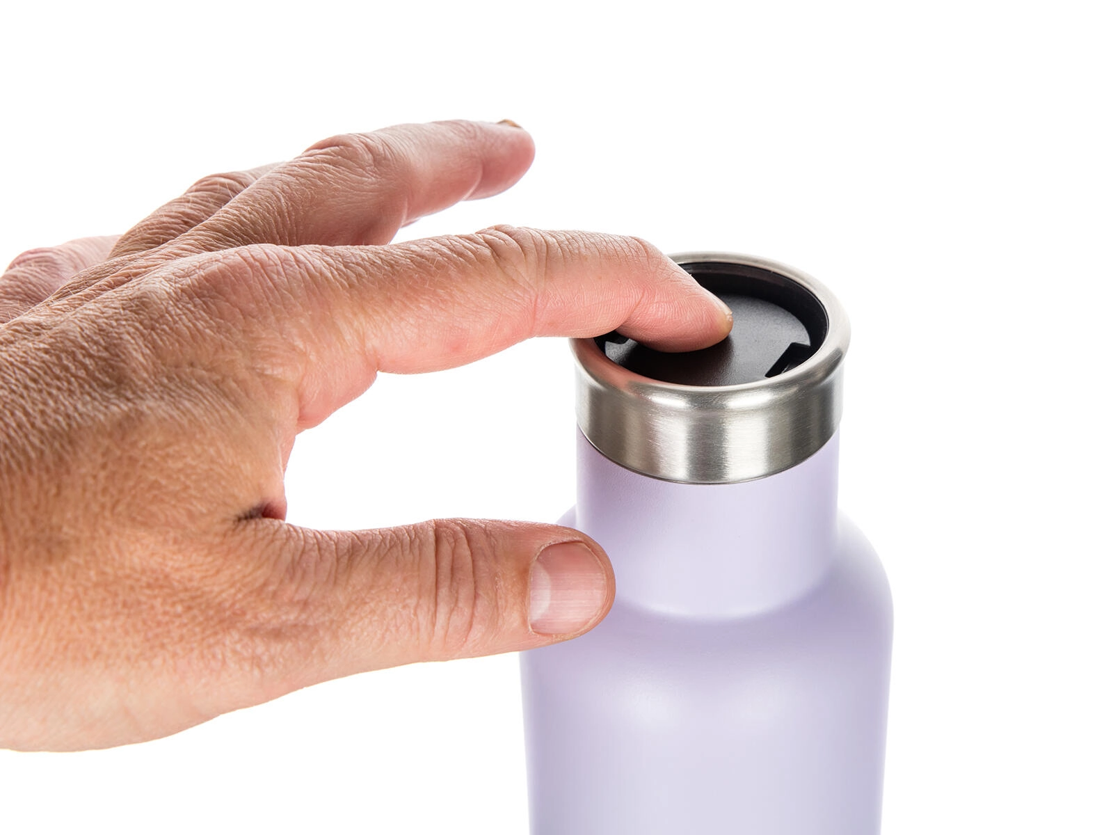 Pameten pokrov z okroglo varovalko tipa termo-varnostno zapiralo omogoča nalivanje z enim pritiskom brez popolne odstranitve pokrova – hitro, čisto in varno. Priporočamo shranjevanje v pokončnem položaju za največjo tesnost in udobje pri uporabi doma in na poti.