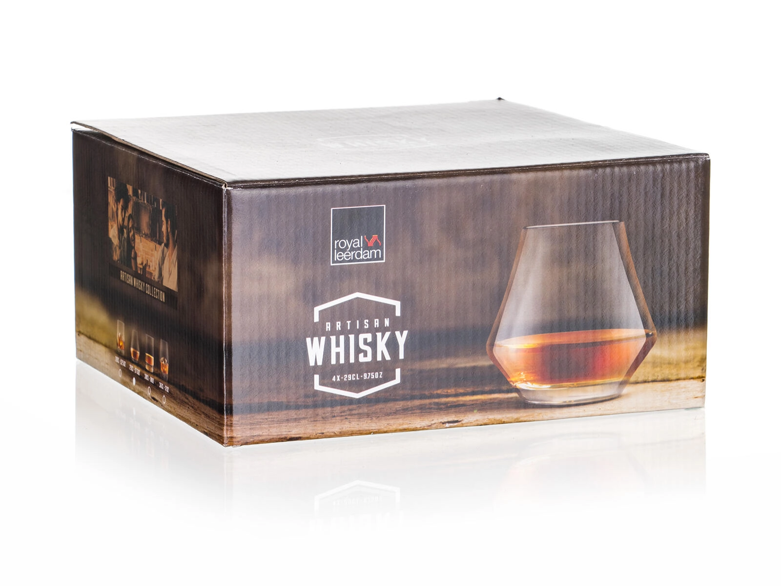 Eleganten set štirih nizkih kozarcev za viski s prostornino 290 ml blagovne znamke ROYAL LEERDAM. Izdelani iz kakovostnega stekla s kaljenim robom za večjo odpornost in dolgo življenjsko dobo. Idealni za serviranje viskija, bourbona in brezalkoholnih pijač zahvaljujoč stabilni obliki in udobnemu oprijemu.