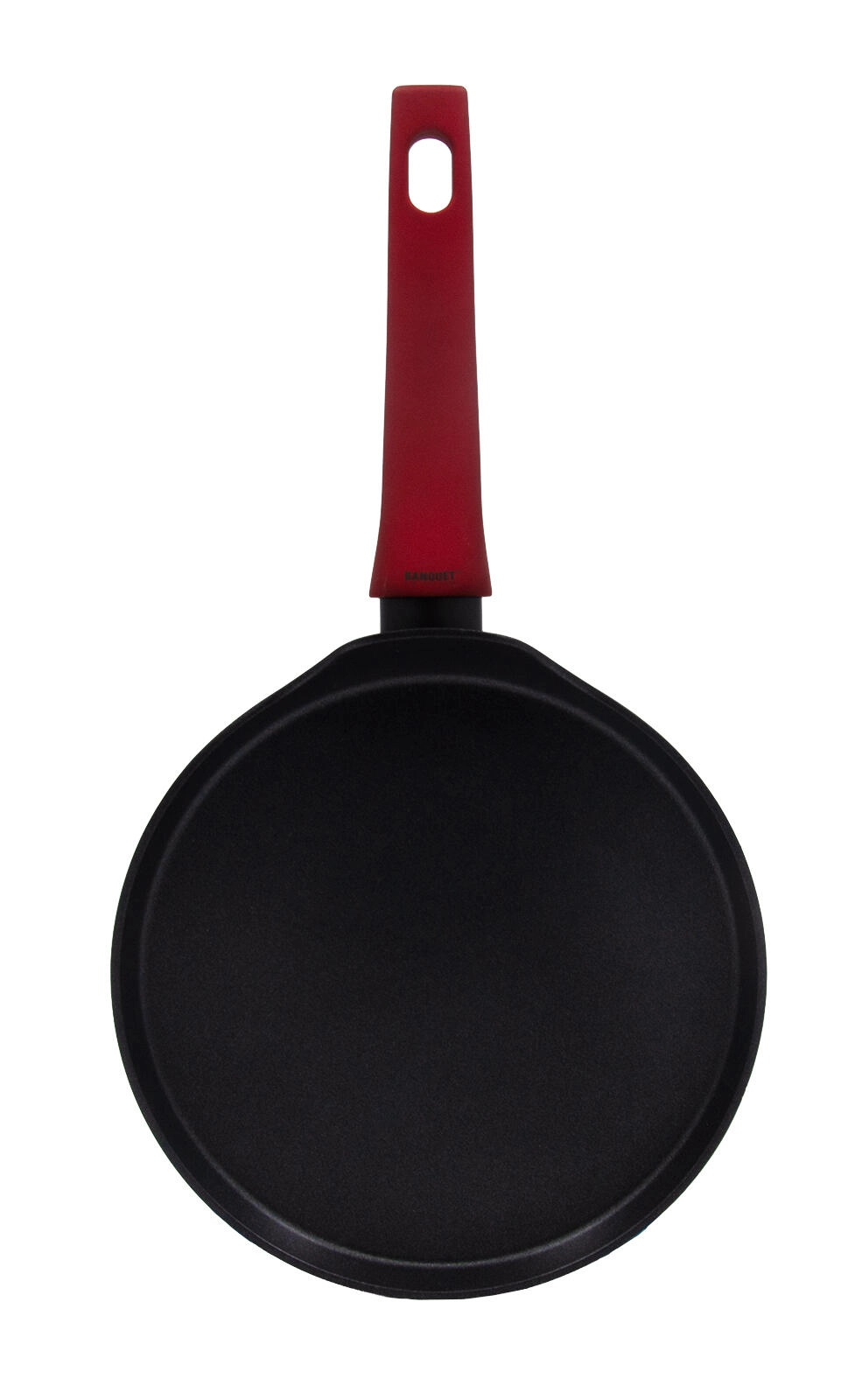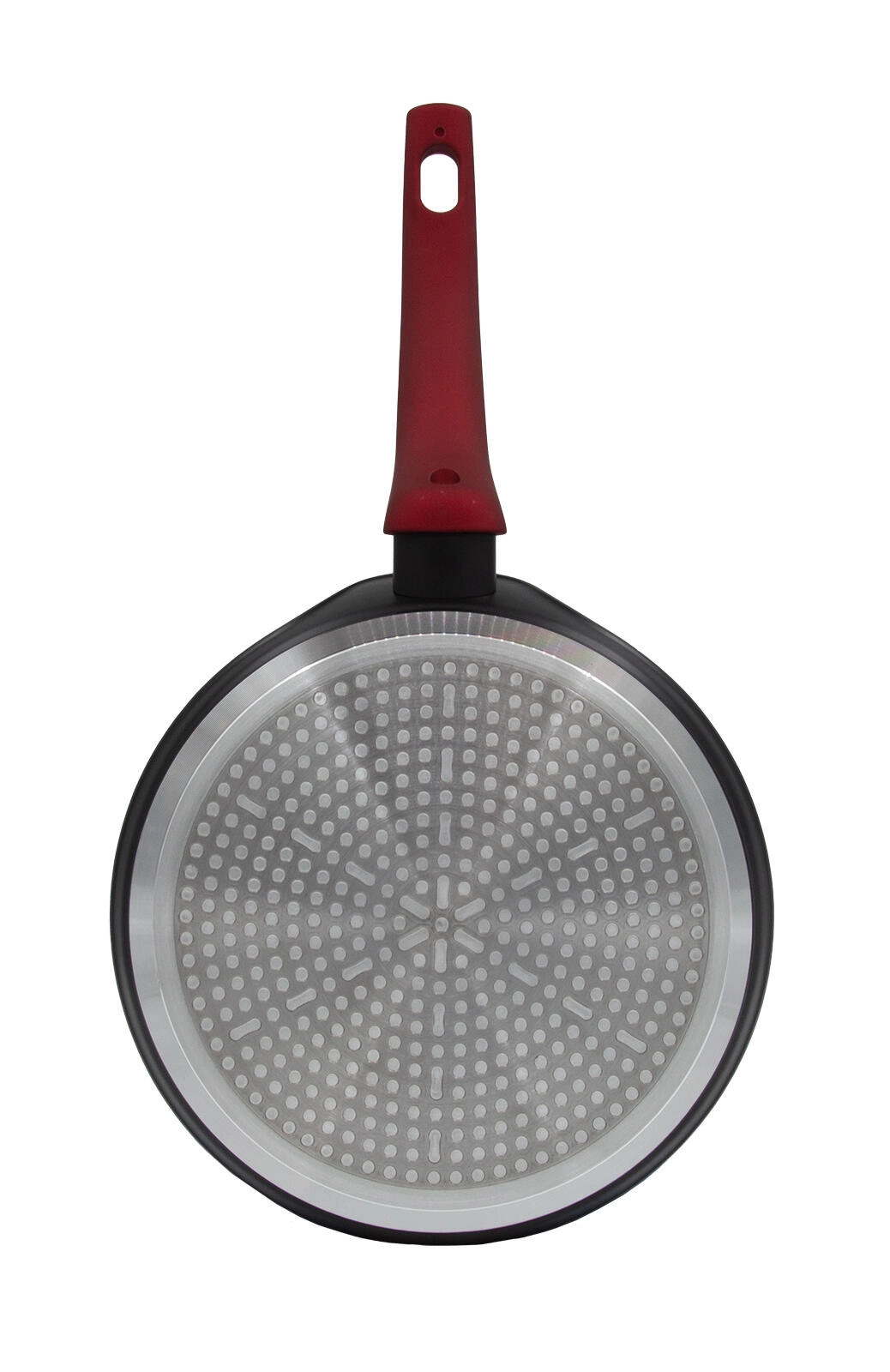 Odkrijte idealno ponev za popolno tanke in enakomerno zapečene palačinke. Aluminijasta litina zagotavlja odlično toplotno prevodnost in dolgo zadrževanje toplote, zato bo vsaka porcija uspela brez čakanja. Trda neprijemljiva površina zmanjšuje potrebo po olju in olajša čiščenje.