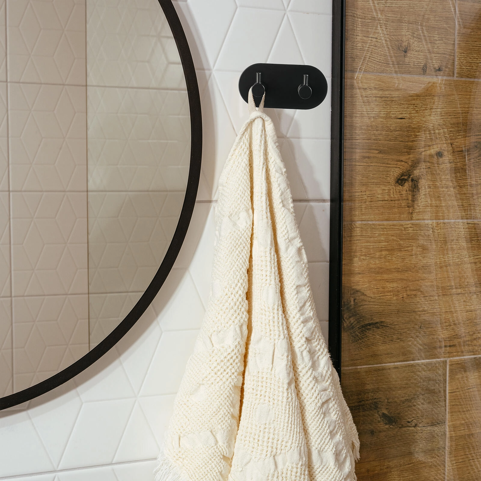 Dvojna izvedba drži brisače, kopalne plašče in torbe ter pomaga ohranjati red v kopalnici in predsobi.