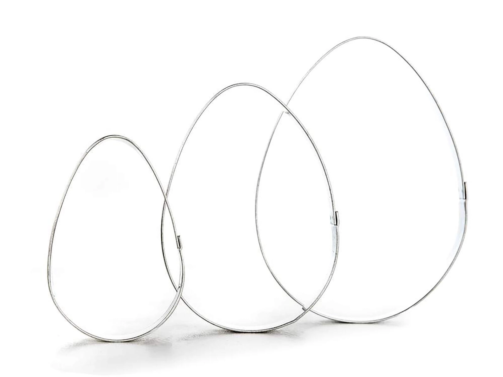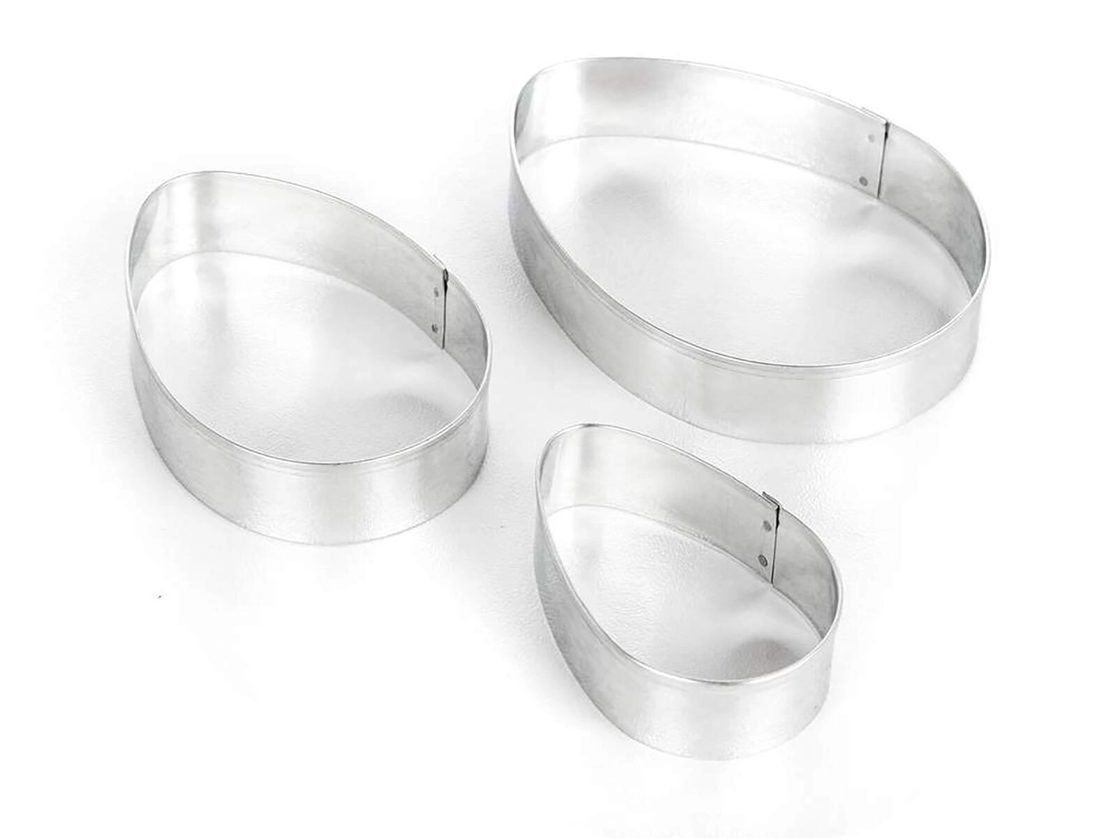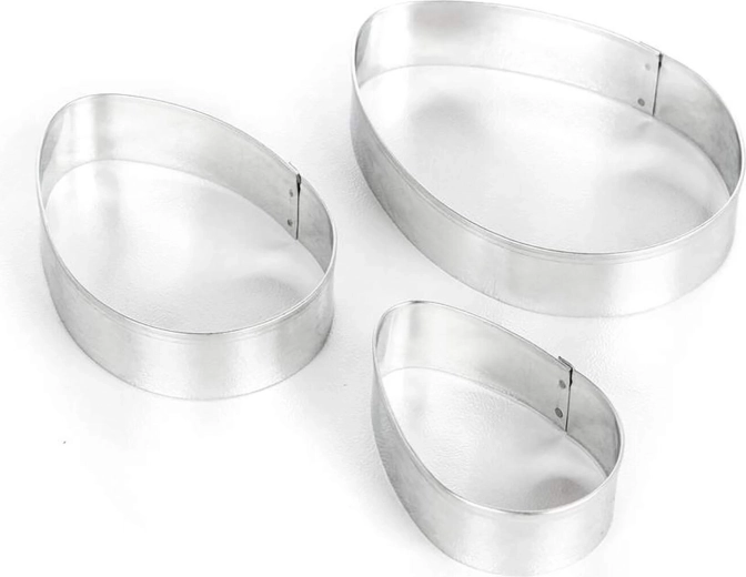Praktičen set 3 izrezovalnikov v obliki jajca za preprosto peko velikonočnih in celoletnih piškotov. Trpežen pocinkan pločevinasti material zagotavlja čist rez in dolgo življenjsko dobo, tri velikosti pa omogočajo ustvarjalno okraševanje in plastenje oblik.
