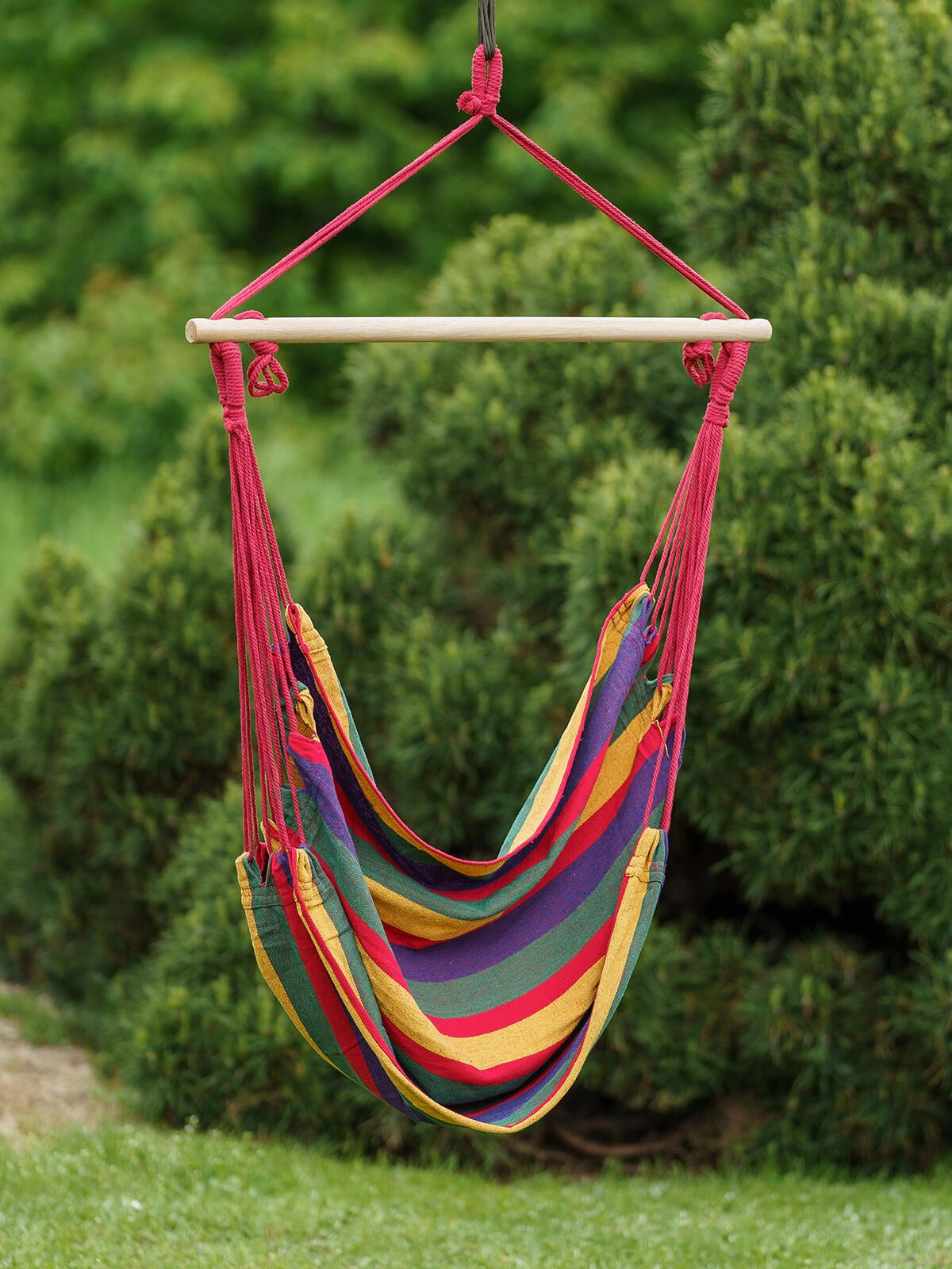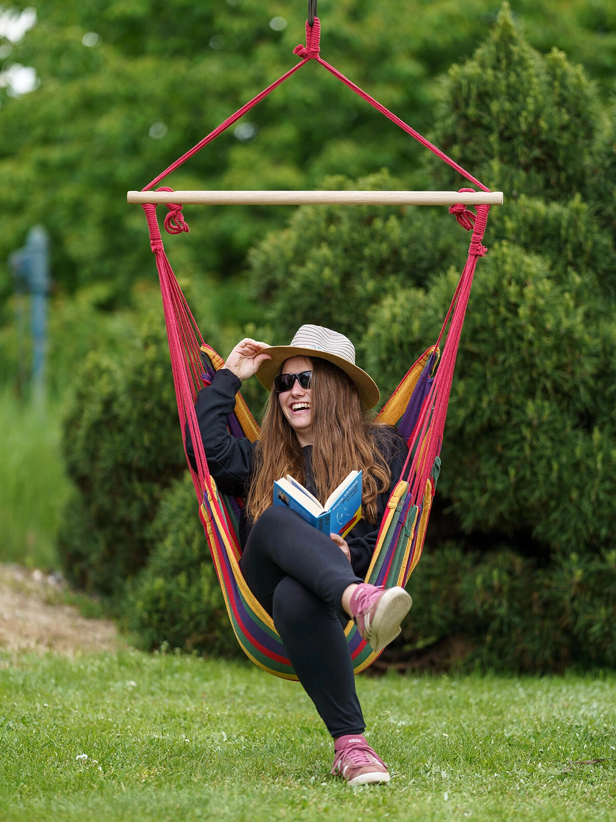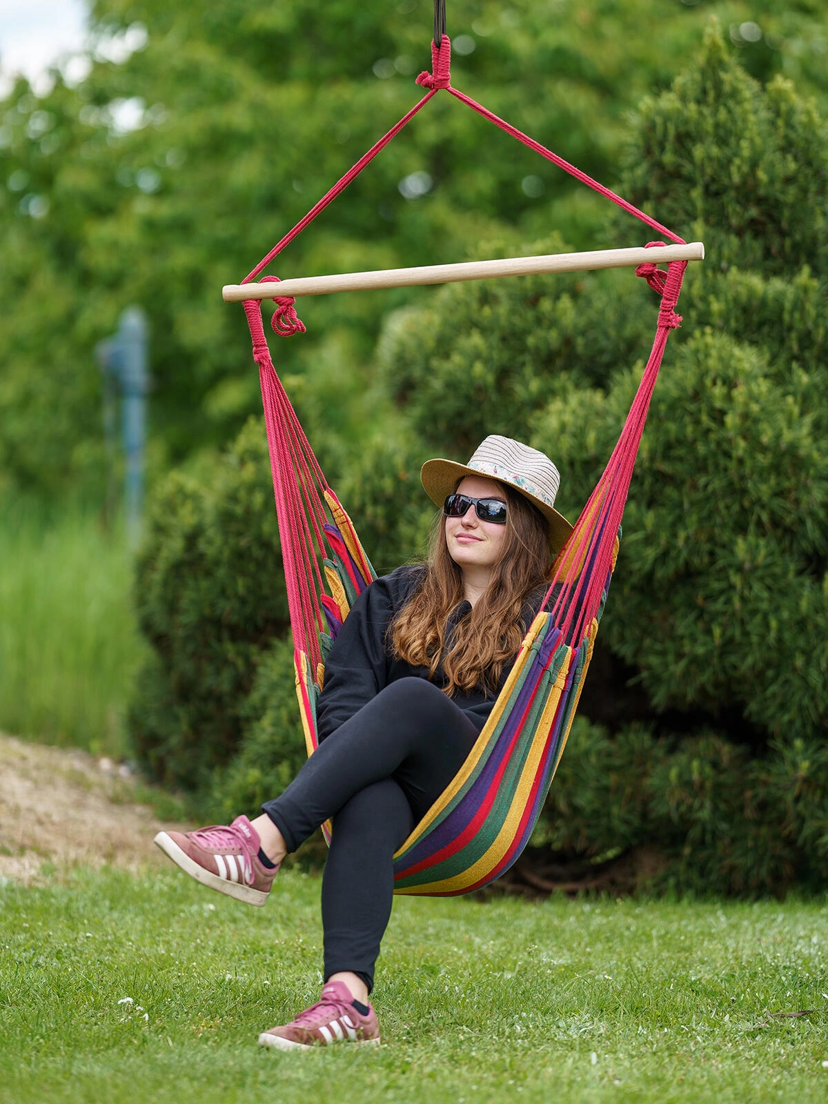 Enostavna namestitev na stropni kavelj ali stojalo. Močna viseča vrv in varni vozli zagotavljajo zanesljivost pri guganju.