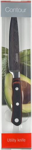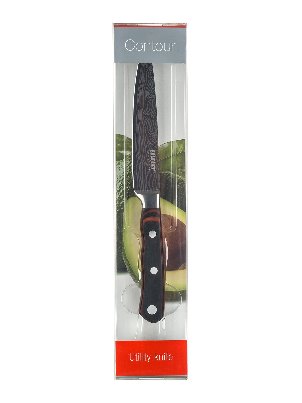 Univerzalni nož CONTOUR je zasnovan tako, da obvlada večino kuhinjskih opravil, od rezanja zelenjave in sadja do porcioniranja manjših kosov mesa. Nerjaveče rezilo dolžine 12,5 cm zagotavlja optimalno ravnovesje med vodljivostjo in natančnostjo, medtem ko skupna dolžina 23,5 cm udobno sede v roko.
