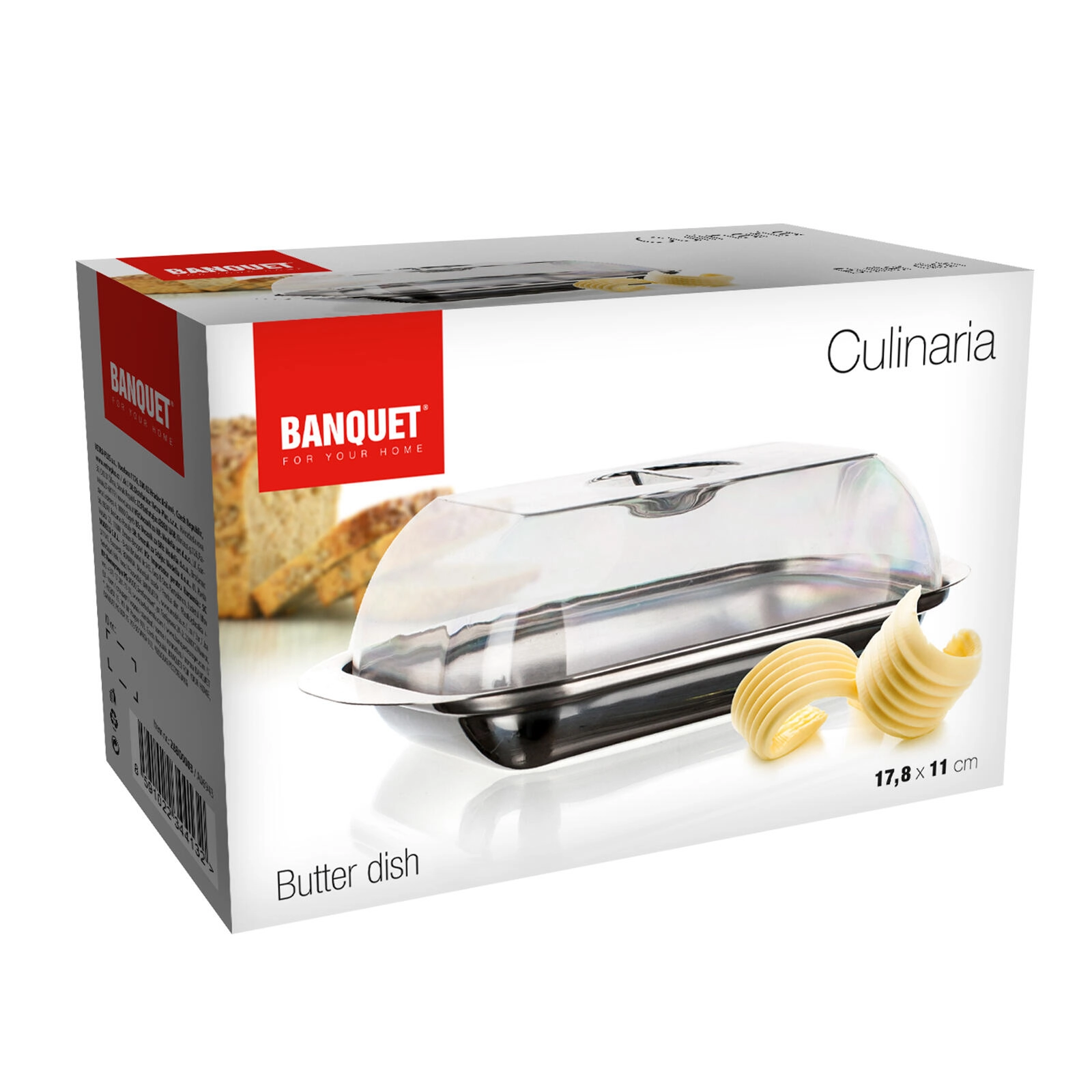 Elegantna maslenica CULINARIA iz nerjavečega jekla s prozornim pokrovom ohranja maslo dlje časa sveže in čisto. Zaradi kompaktnih mer se prilega večini hladilnikov in je enostavna za čiščenje. Odporno nerjaveče jeklo 430, praktičen prozoren pokrov in stilska zasnova za vsakodnevno uporabo.