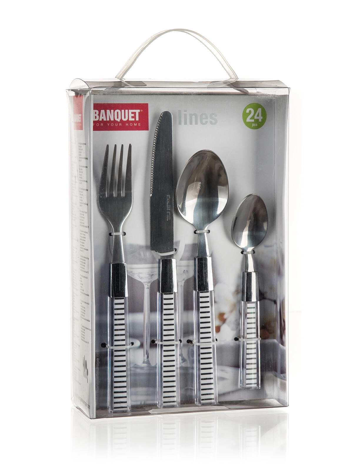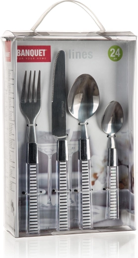 Set jedilnega pribora Lines, 24-delni, je idealen za popolno postrežbo šestih oseb. Združuje odporno nerjavno jeklo 18/0 z dekorativnimi plastičnimi ročaji, ki prijetno ležijo v roki in vaši mizi dodajo sodoben videz. Bleščeča površina pribora deluje elegantno in je enostavna za vzdrževanje.