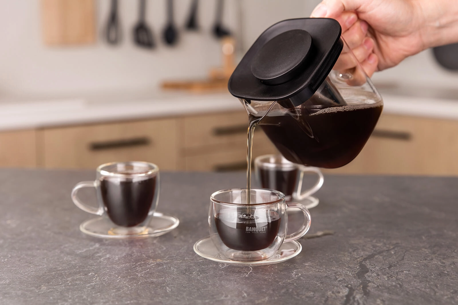 Ergonomski stekleni ročaj in oblikovan izliv omogočata gladko in natančno postrežbo vročih in hladnih napitkov.
