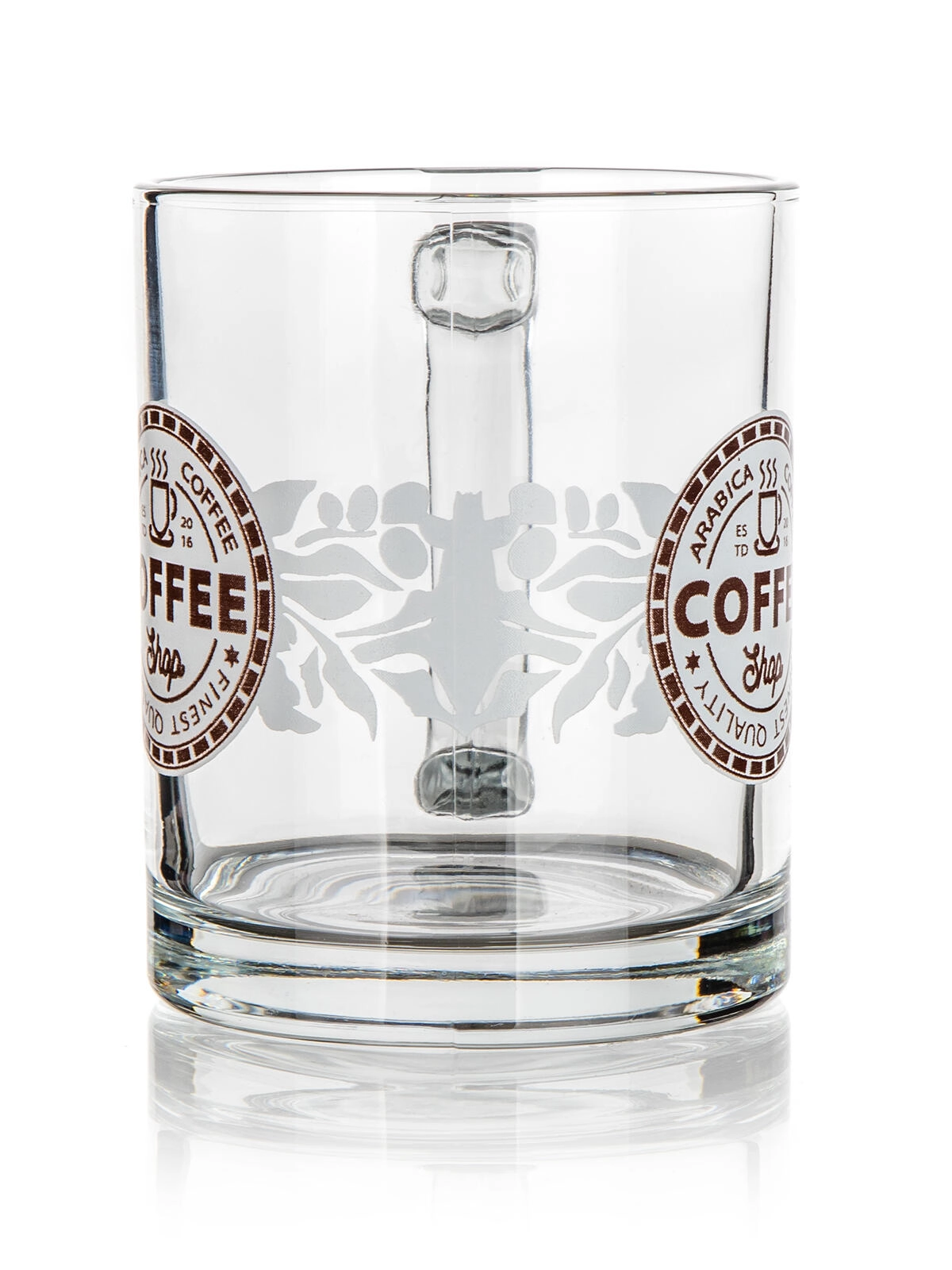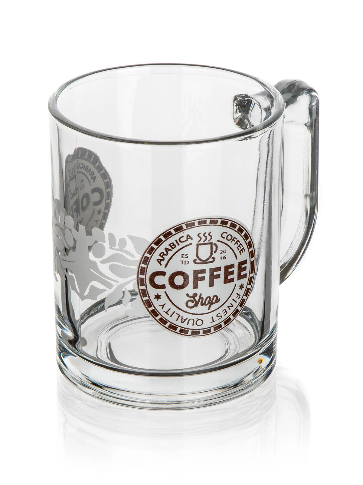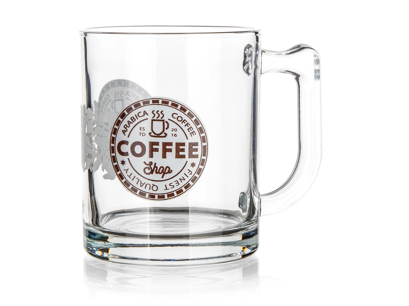 Eleganten stekleni vrč s prostornino 345 ml z dekorjem »Coffee Shop/Arabica« je idealen za vsakodnevno uporabo. Zahvaljujoč prozornemu steklu, robustnemu ročaju in debelemu dnu udobno postrežete tople in hladne napitke – od kave in čaja do latteja ali domačih limonad.