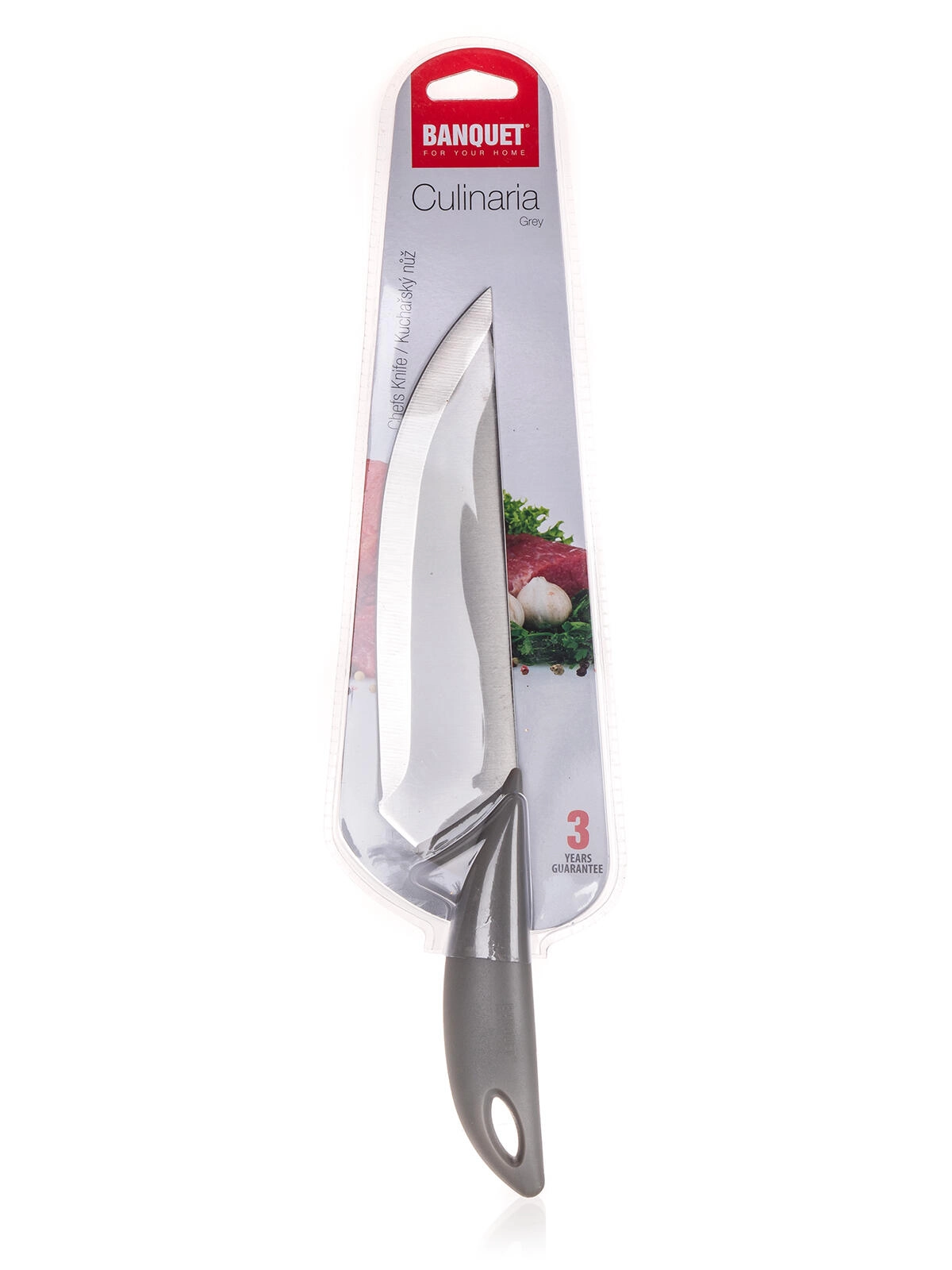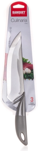 Kuhinjski nož CULINARIA Grey je zanesljiv pomočnik za vsakodnevno pripravo jedi. Zahvaljujoč jeklenemu rezilu in uravnoteženi zasnovi zlahka obvlada rezanje zelenjave, mesa in zelišč. Ergonomski plastični ročaj zagotavlja zanesljiv oprijem in udobje tudi pri daljši uporabi.