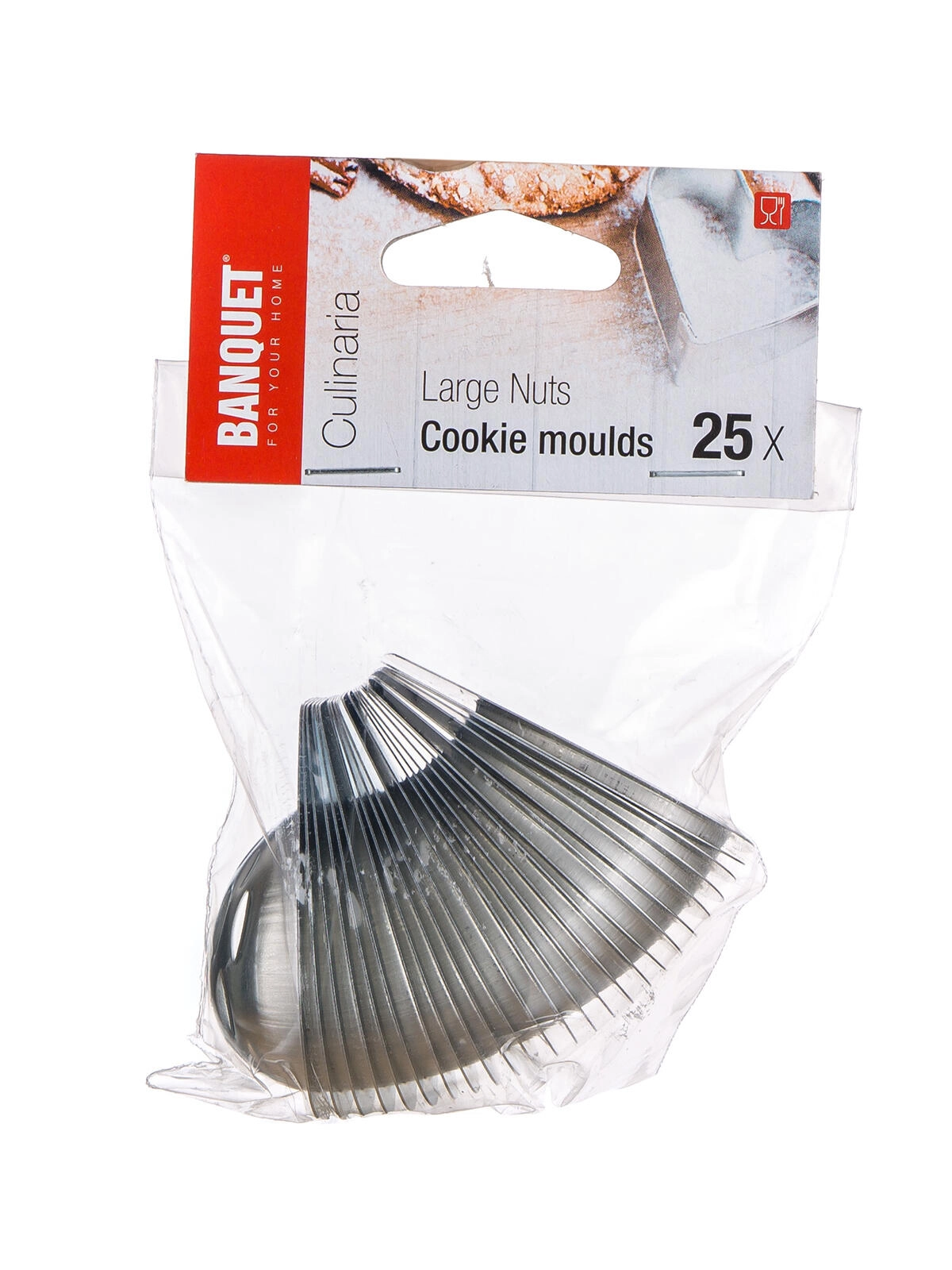 Odkrijte praktičen set modelčkov Culinaria v obliki velikega oreha za enostavno peko domačih piškotov. Zaradi trpežne pocinjene pločevine so modelčki odporni, zlahka se stresejo iz kalupa in zagotavljajo enakomerno zapečenost. Pakiranje vsebuje 25 kosov, idealno za pripravo priljubljenih »orehov« in drugih sladic.