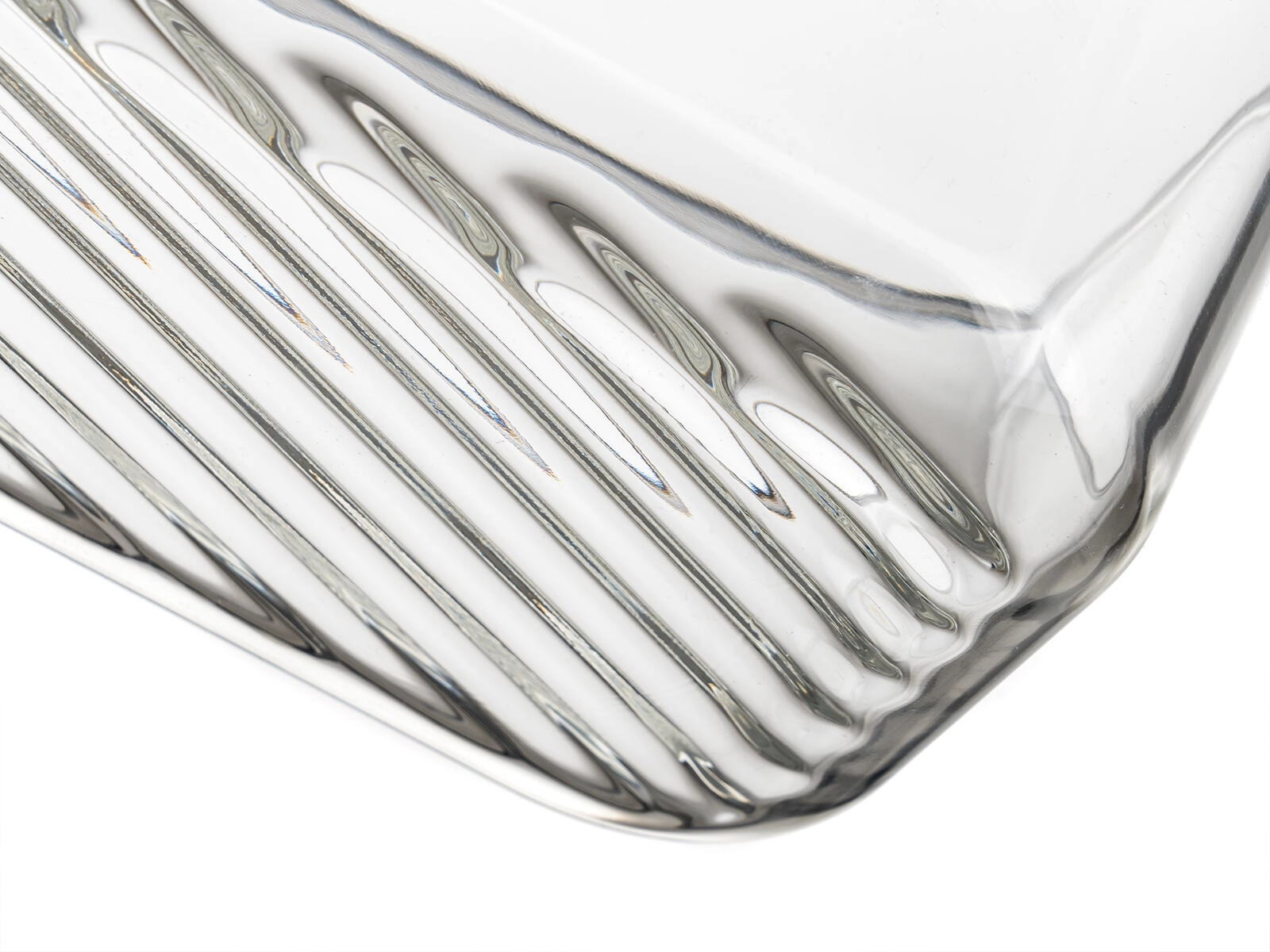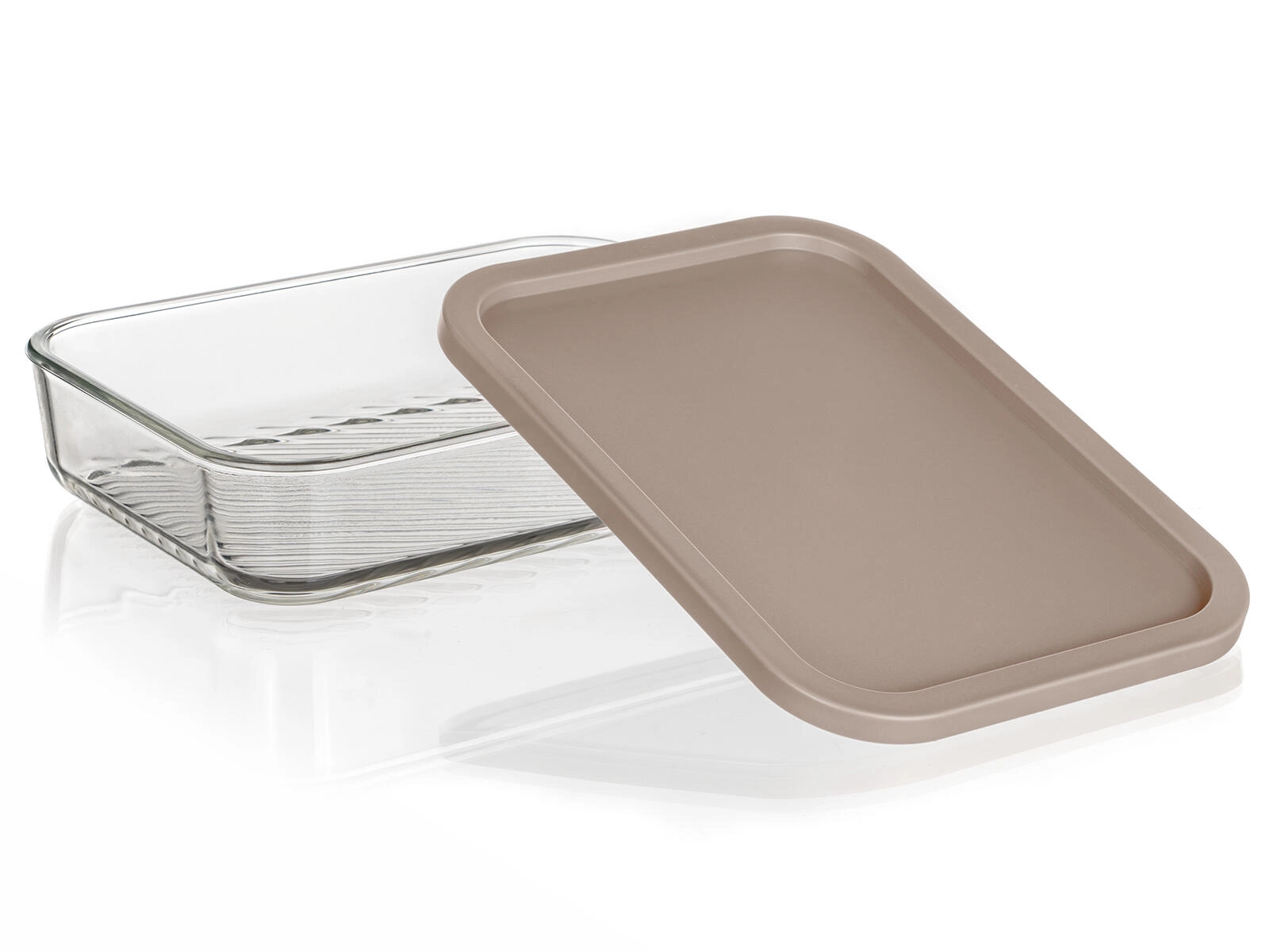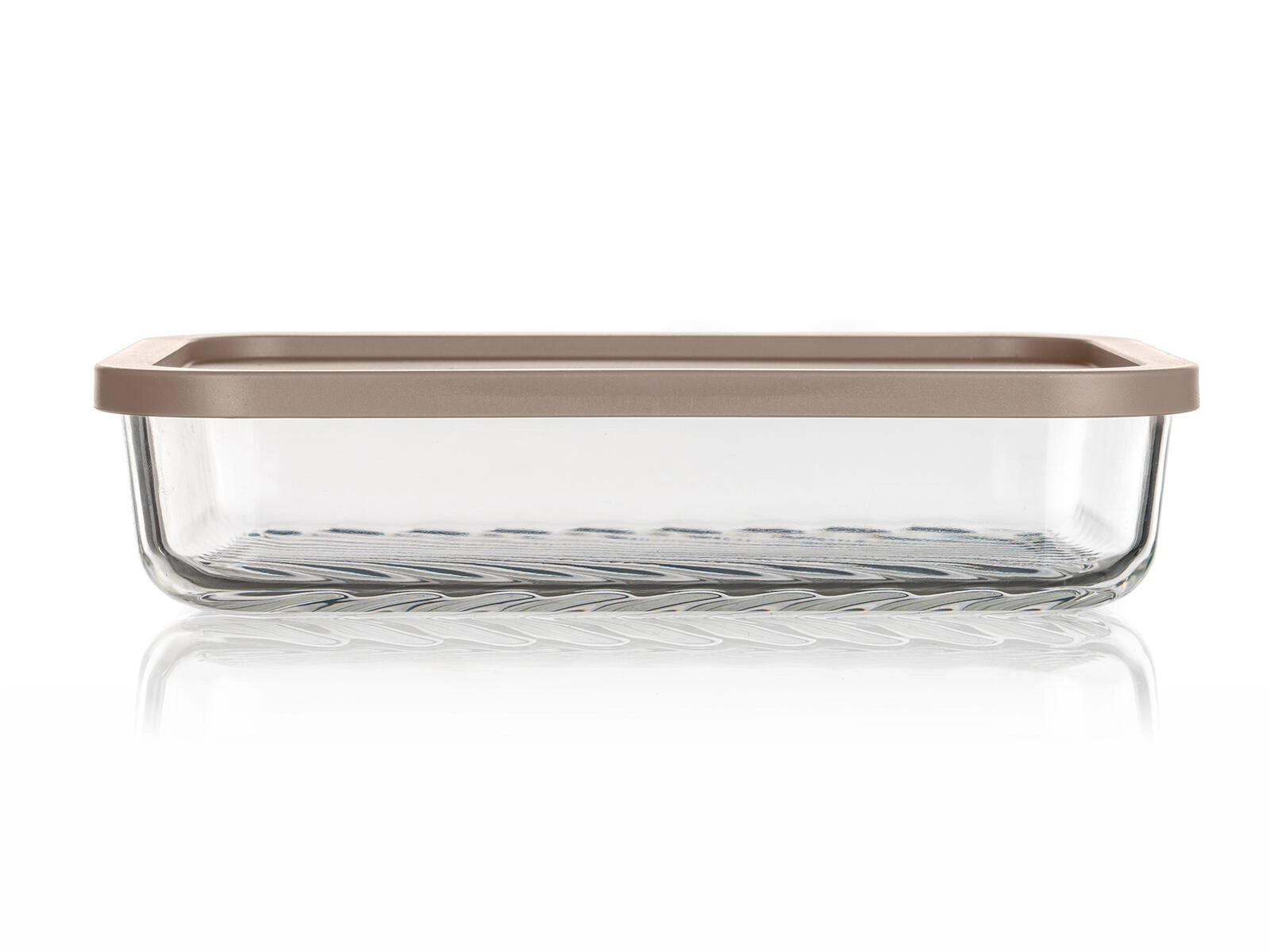 Pravokotni format 22,5 × 16 × 5 cm prihrani prostor v hladilniku in zamrzovalniku. Prosojno steklo z rebrastim dnom poveča stabilnost in olajša pregled nad vsebino.