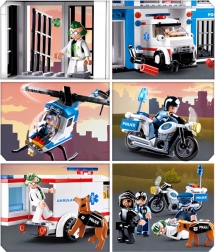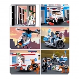V kompletu so helikopter, policijski motor in reševalno vozilo. Otroci lahko načrtujejo drzne posredovalne akcije in hitra zasledovanja ter ustvarjajo napete scenarije pobega iz zapora.