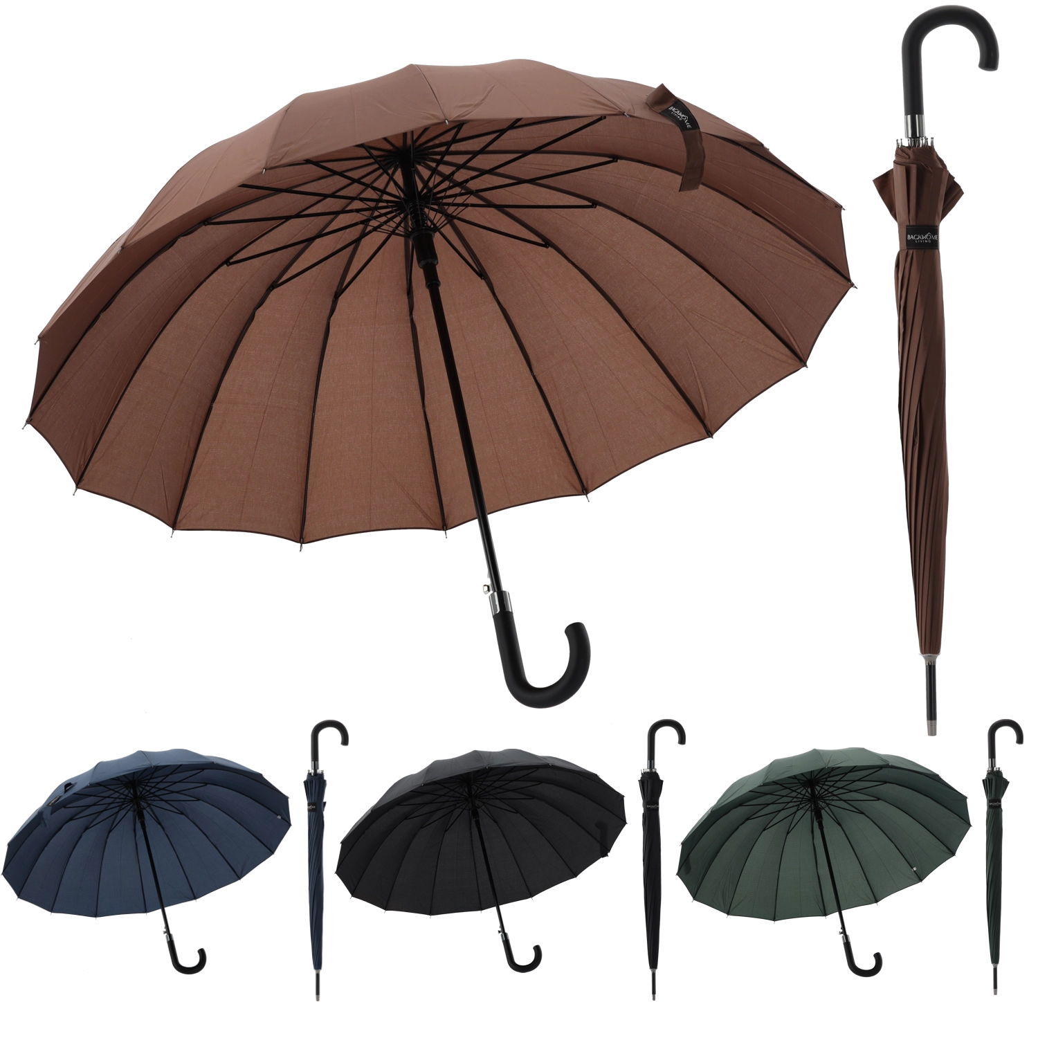 Slogoven in vzdržljiv dežnik za vsakodnevno uporabo s polavtomatskim odpiranjem, 16 rebrami in kovinskim ogrodjem. Ponuja premer 110 cm za zanesljivo zaščito pred dežjem in vetrom, ima dolg ročaj s črnim gumiranim zaključkom za udoben oprijem in je na voljo v enobarvni izvedbi – temno zelena, črna, mornarsko modra in rjava.