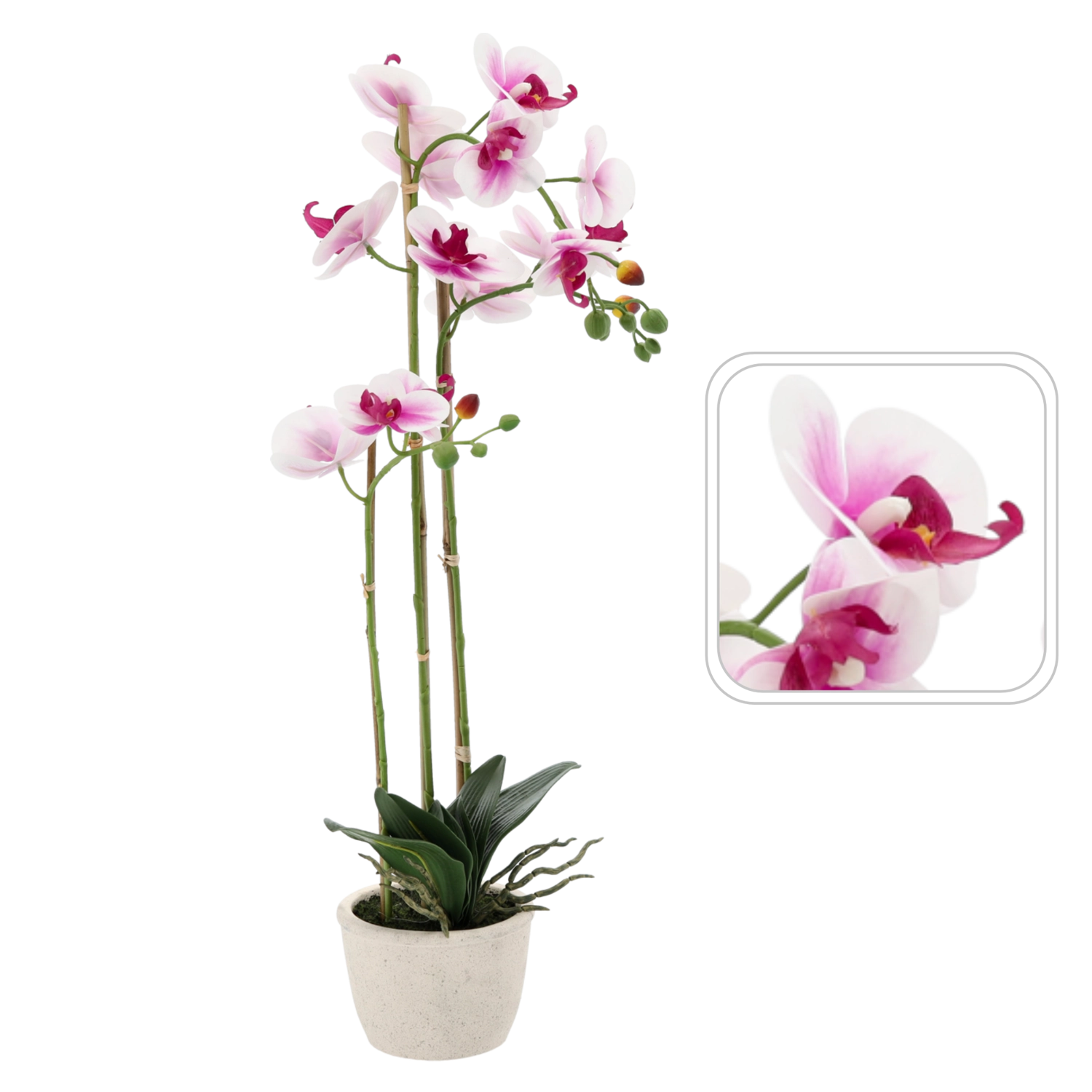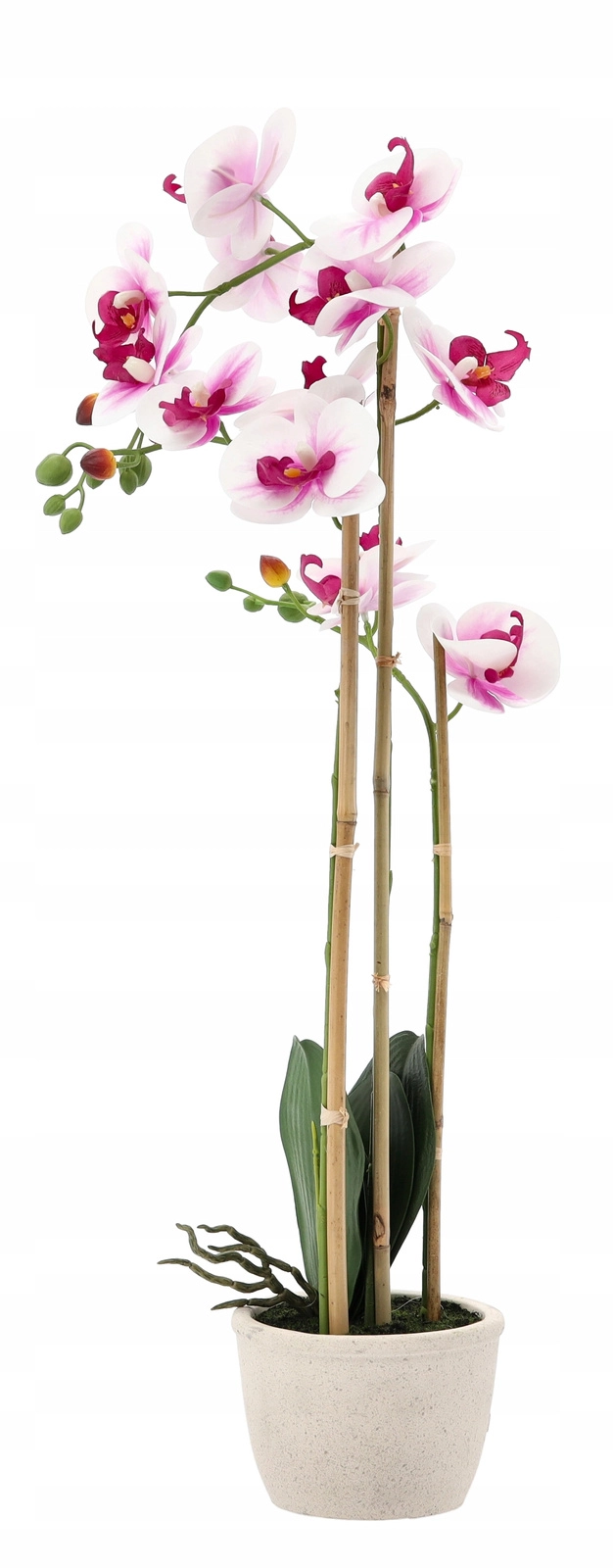 Ta elegantna umetna orhideja v nežni belo‑rožnati barvni kombinaciji deluje zelo naravno zaradi podrobno izdelanih cvetov, popkov in listov. Višina 70 cm je idealna za okenske police, komode ali kopalnice, kjer doda svežino in slog brez potrebe po svetlobi ali redni negi.