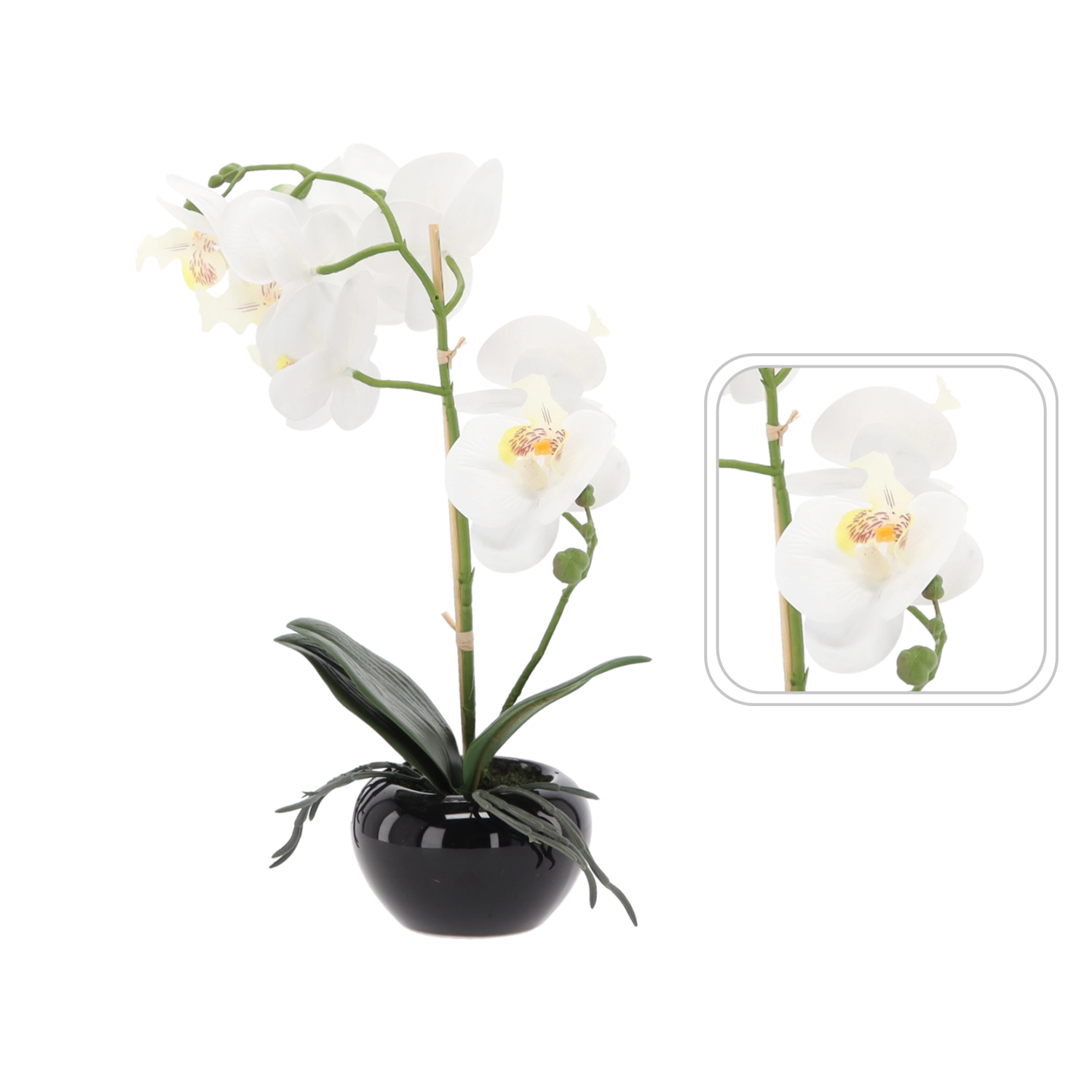 Ta umetna bela orhideja izstopa z realističnimi detajli in kompaktno višino 30 cm, zaradi česar jo je enostavno postaviti tudi na manjše površine. Je odlična izbira za vse, ki želijo svojemu prostoru dodati svež videz brez rednega zalivanja ali posebnih pogojev.