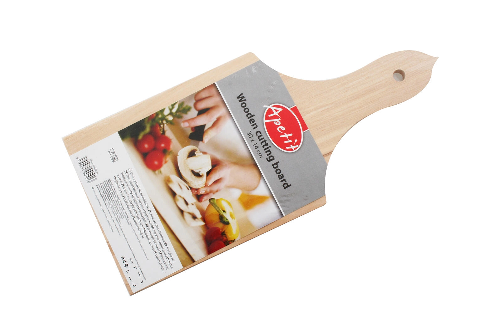 Praktična lesena deska za rezanje APETIT z merami 30 × 14 cm v naravni izvedbi brez površinske obdelave. Ponuja stabilno površino za rezanje in serviranje, ima izvrtan ročaj za enostavno obešanje in naraven videz lesa, ki se poda vsaki kuhinji.