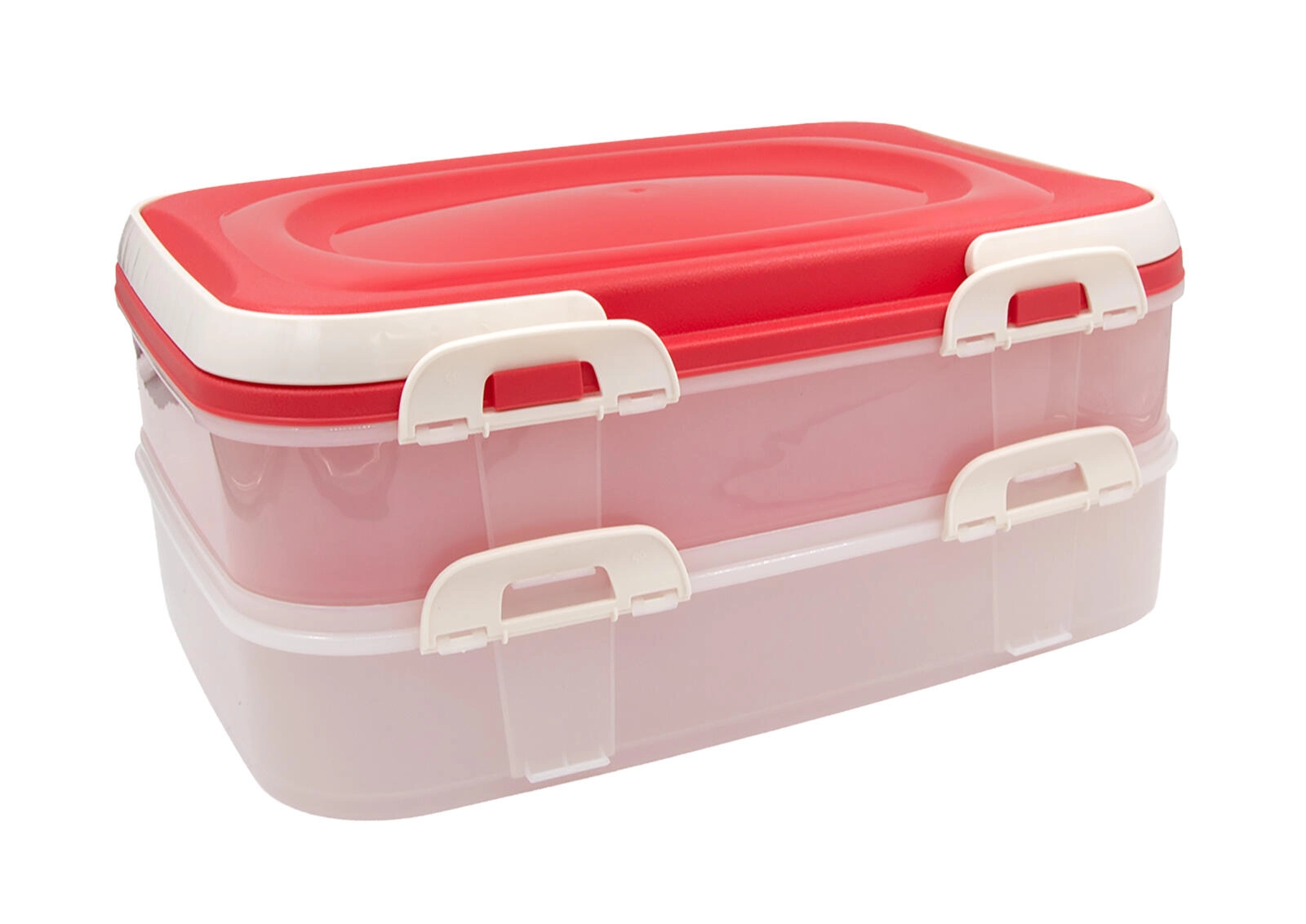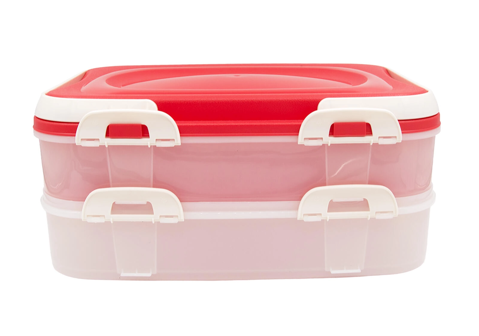 Iščete praktično škatlo za obložene kruhke, sladice, sadje ali pecivo? Ta 2-nadstropna prenosna posoda z močnimi zapirali in ročaji poskrbi, da vaša živila prispejo na cilj sveža in varno zaprta. Prosojne stene omogočajo hiter pregled vsebine, rožnat pokrov pa doda eleganten videz vsaki pogostitvi.