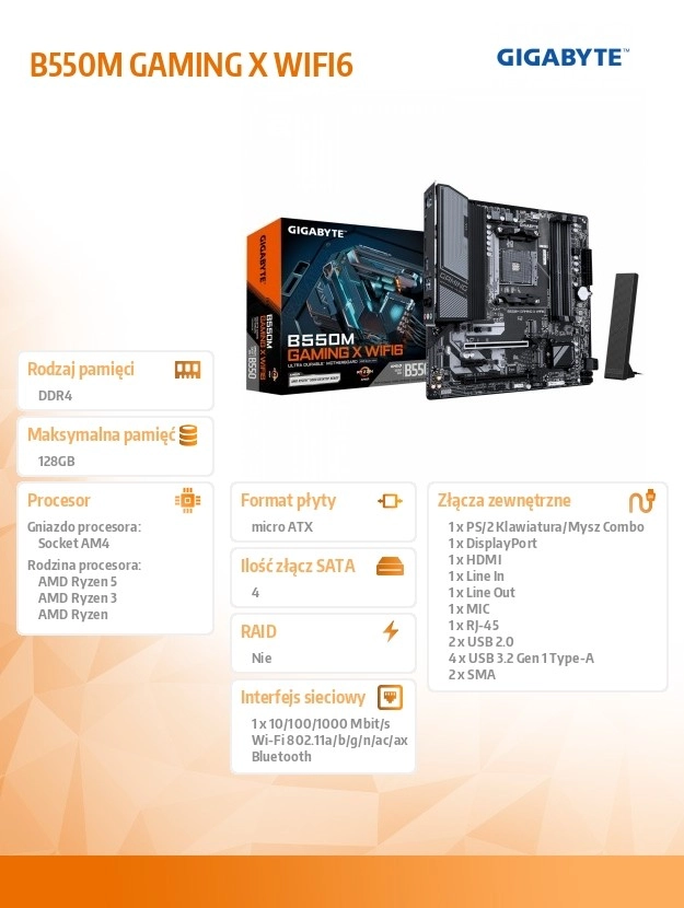 Osnovna plošča B550M Gaming X Wi‑Fi 6 mATX je zasnovana za igralce in ustvarjalce vsebin, ki želijo zanesljivo zmogljivost in sodobno opremo v kompaktni izvedbi. Podpora procesorjem AMD Ryzen serij 5000/4000/3000, digitalna napajalna zasnova 5+3 faze in napredno hlajenje VRM Thermal Armor Advanced zagotavljajo stabilnost tudi pri daljši obremenitvi.