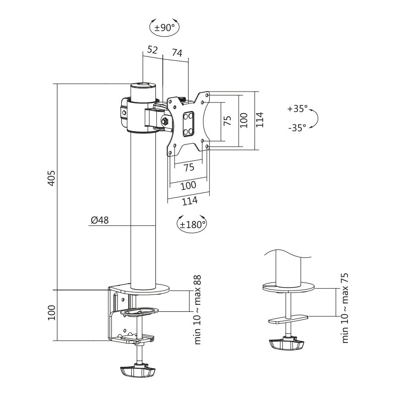 Namizni nosilec za monitorje z diagonalo 17–32" prinaša stabilno oporo in fleksibilne nastavitve. Trden jekleni steber in združljivost z VESA zagotavljata varno pritrditev, medtem ko vrtljiv nosilec omogoča nagib, obračanje in navpični pivot za delo v pokončnem načinu. Montaža je preprosta s C-sponko ali skozi izvrtino v mizi.