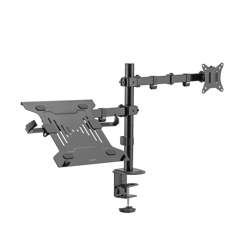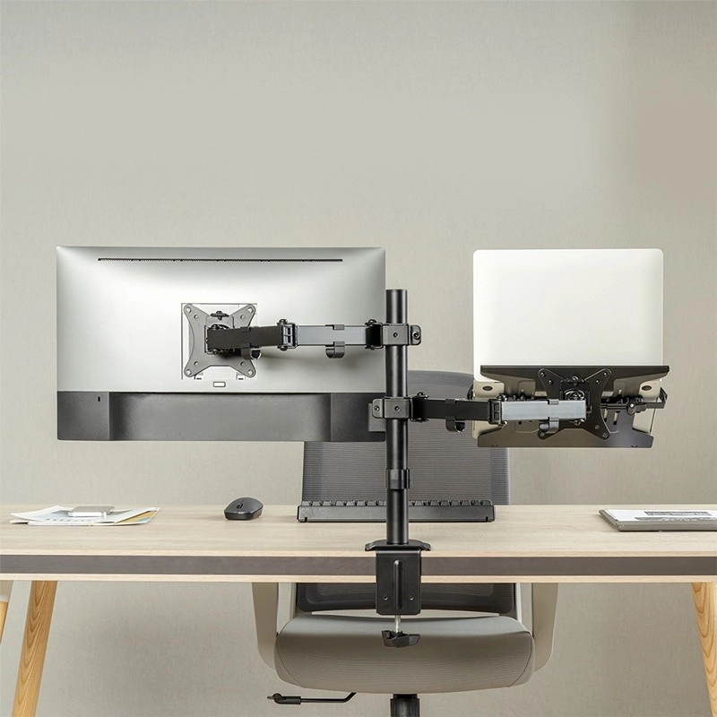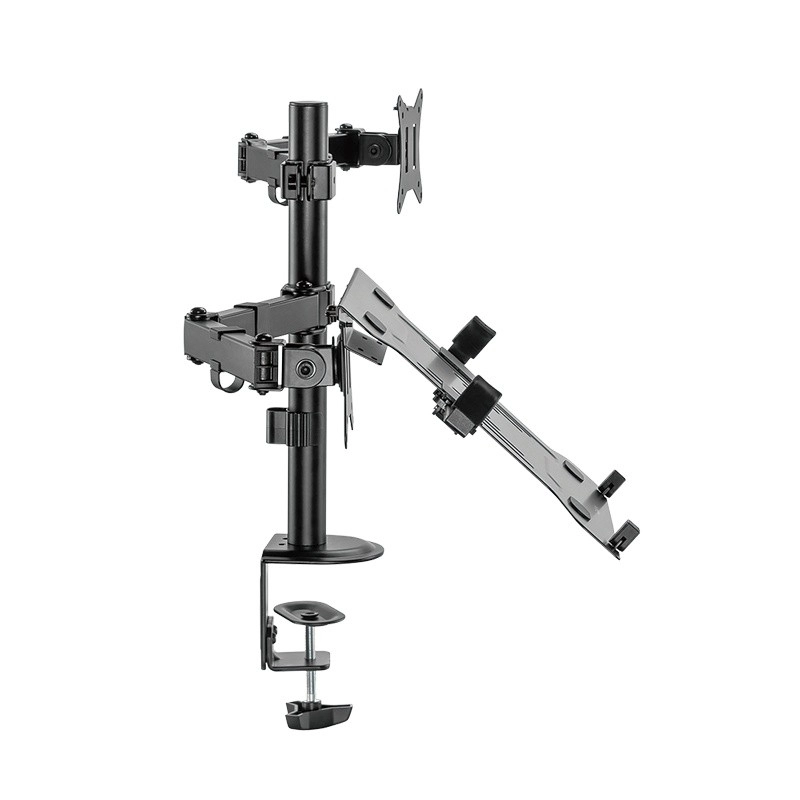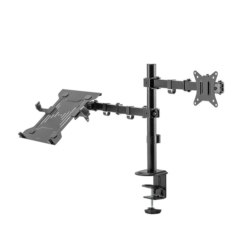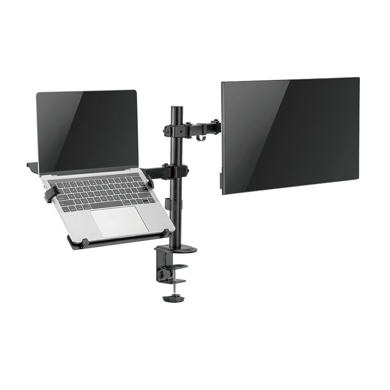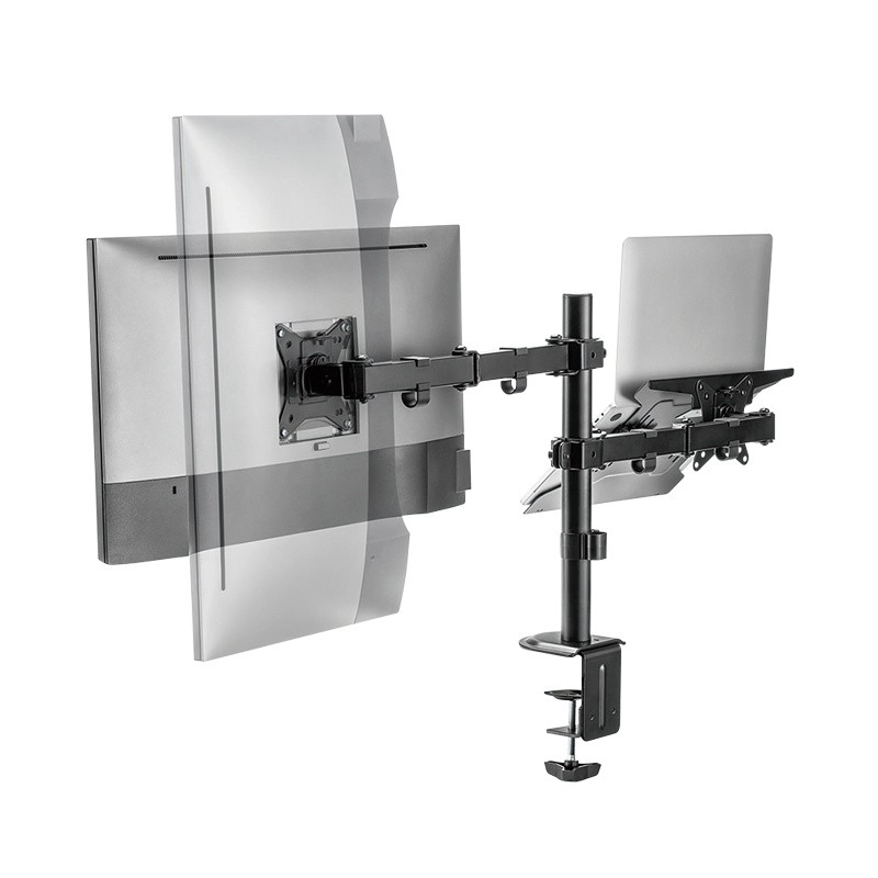 Povečajte svojo produktivnost z univerzalnim nosilcem, ki hkrati drži monitor 13–32" in prenosnik ali tablico. Z popolnoma nastavljivimi ročaji, stabilno zasnovo in pritrditev na mizo zlahka ustvarite ergonomsko delovno mesto, sprostite prostor na površini in natančno prilagodite položaj zaslona svojim potrebam.
