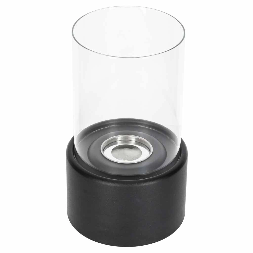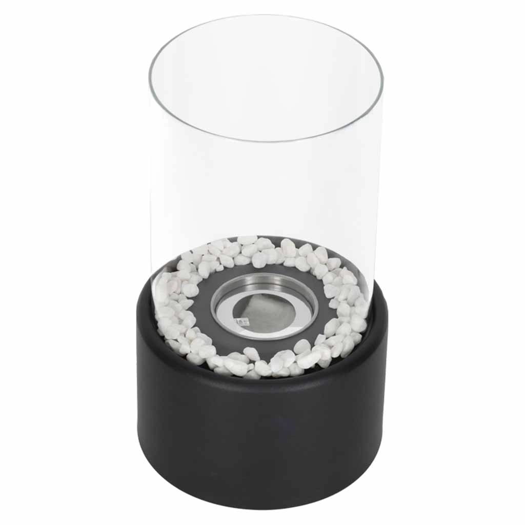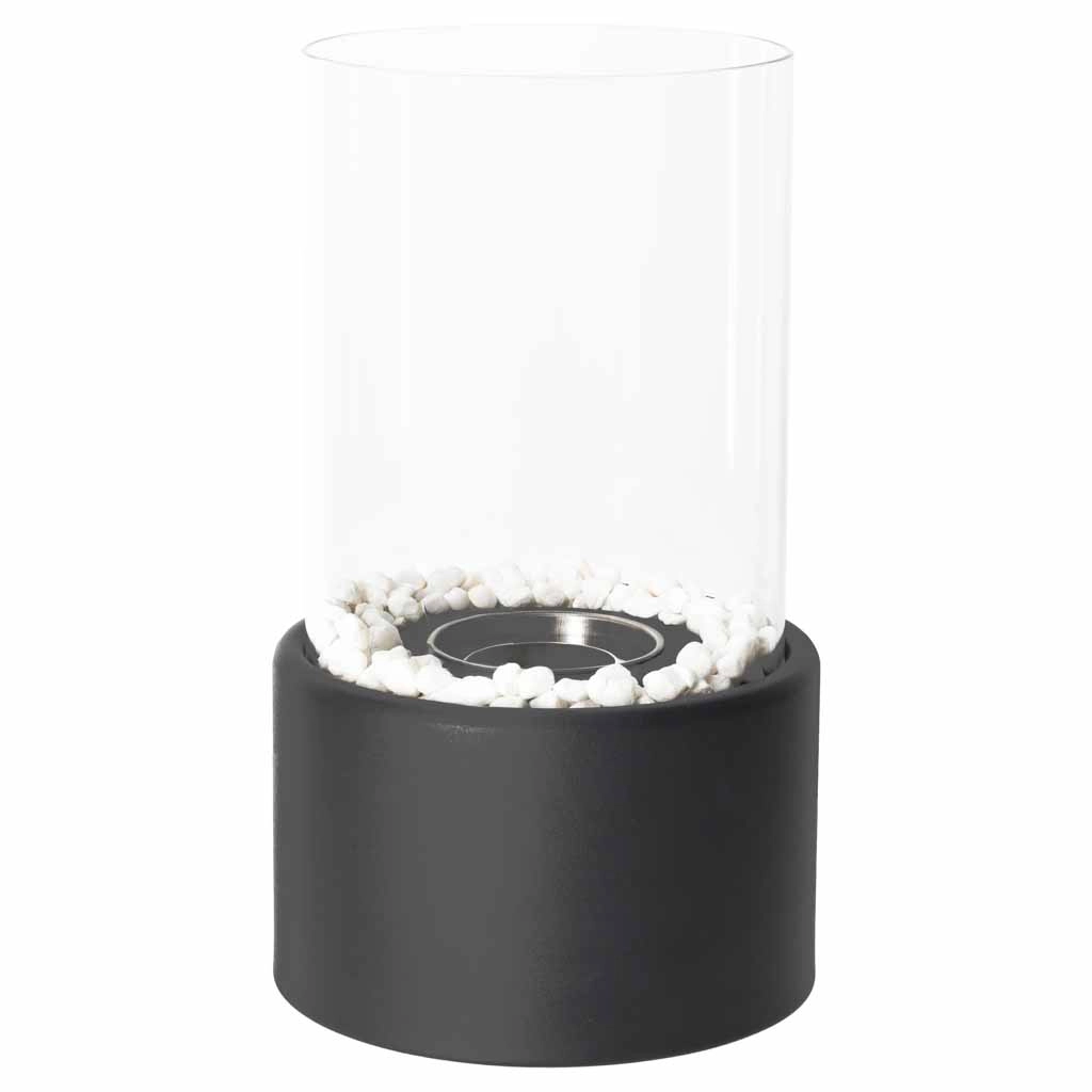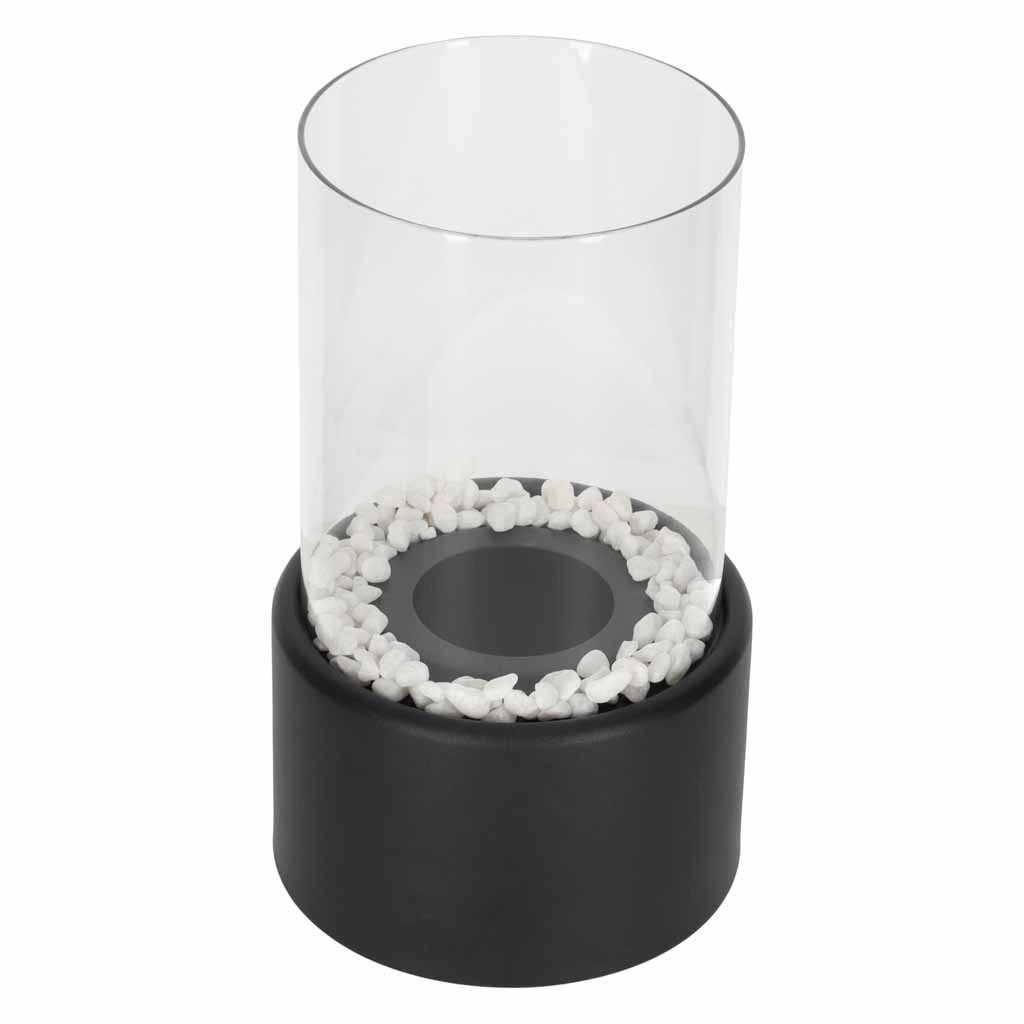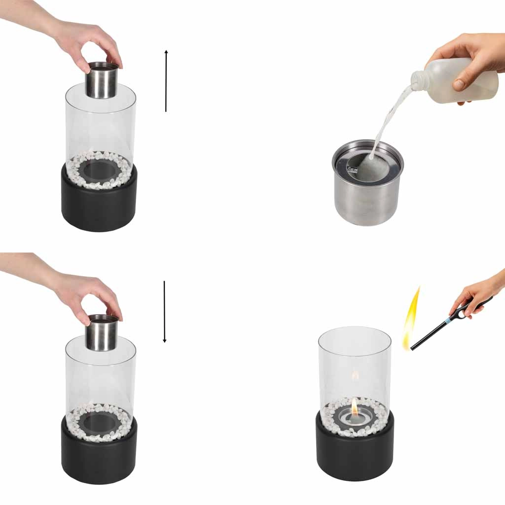 Zaščitni cilindrični stekleni tulec iz kaljenega stekla povečuje varnost in poudarja učinek plamena. Kovinsko gorilno telo iz nerjavnega jekla z bombažnim vlaknom zagotavlja enakomerno gorenje in preprosto dolivanje goriva. Del pakiranja sta praktično orodje za gašenje in dekorativni kamenčki za dodelan videz.