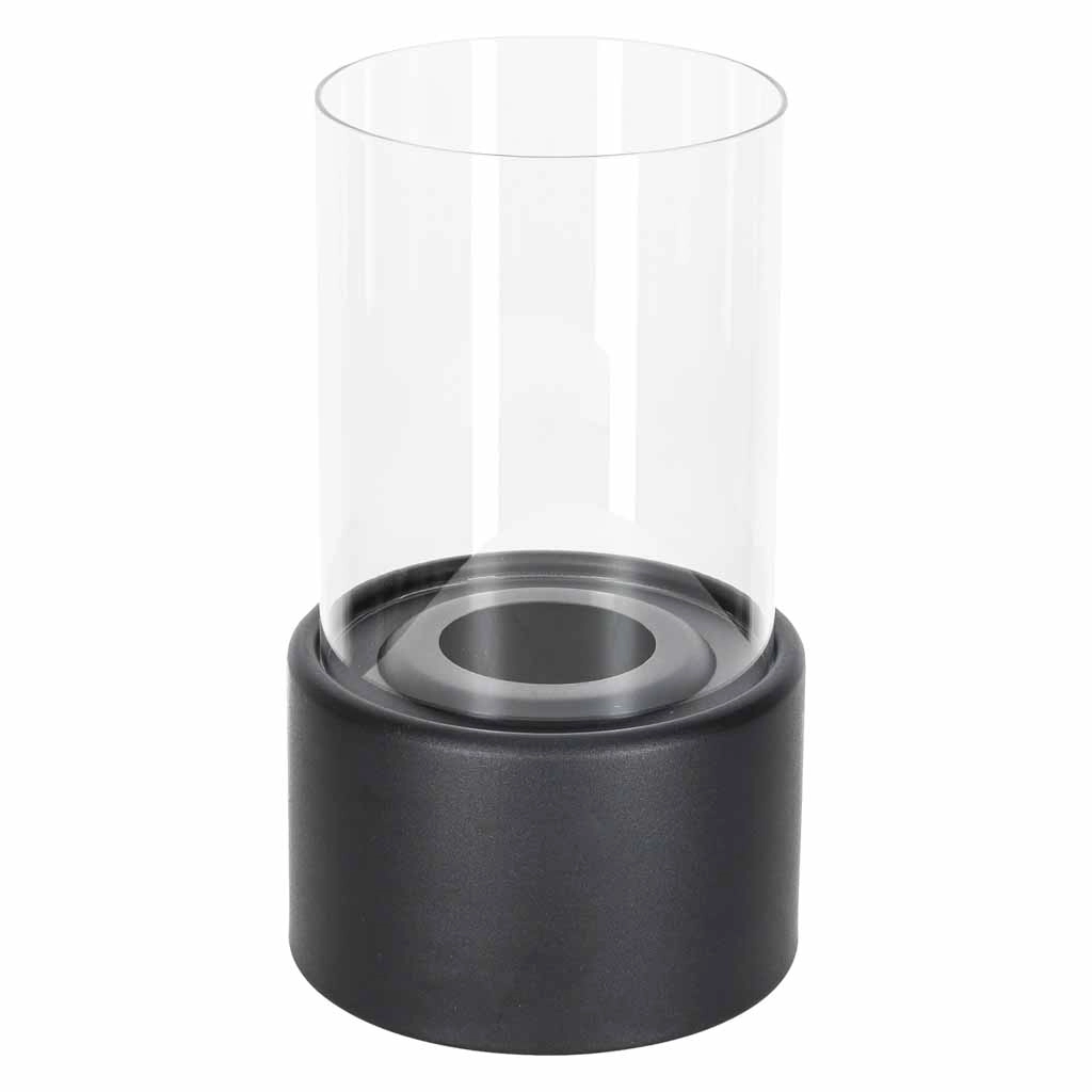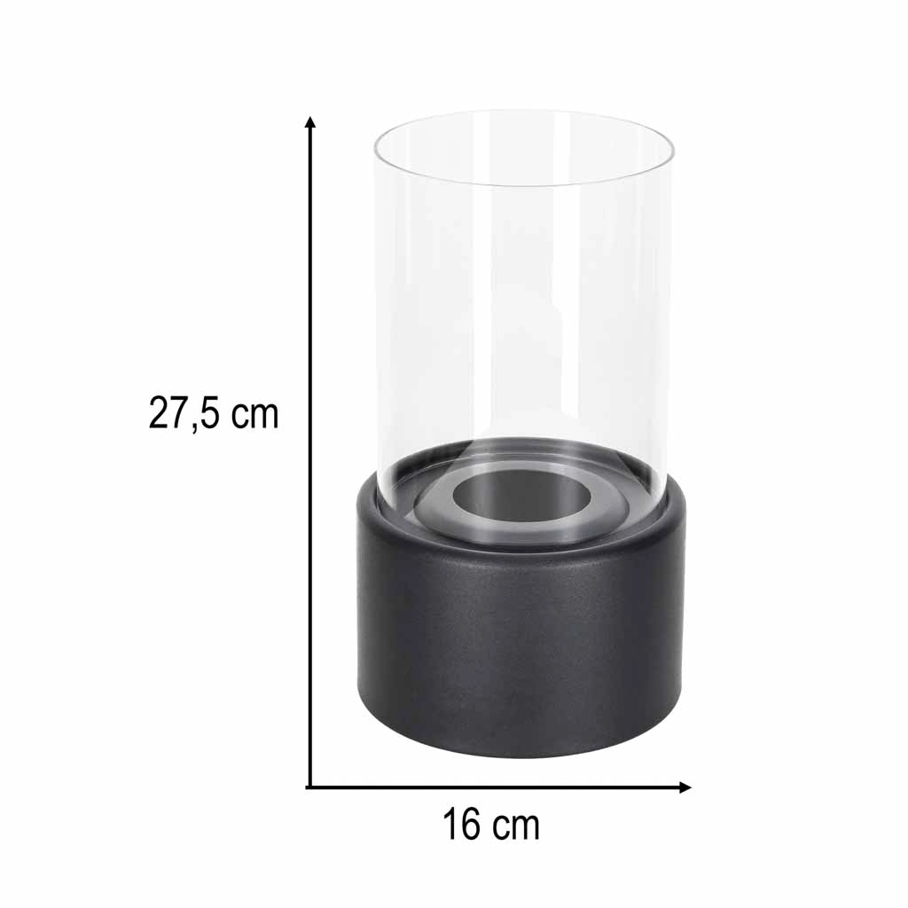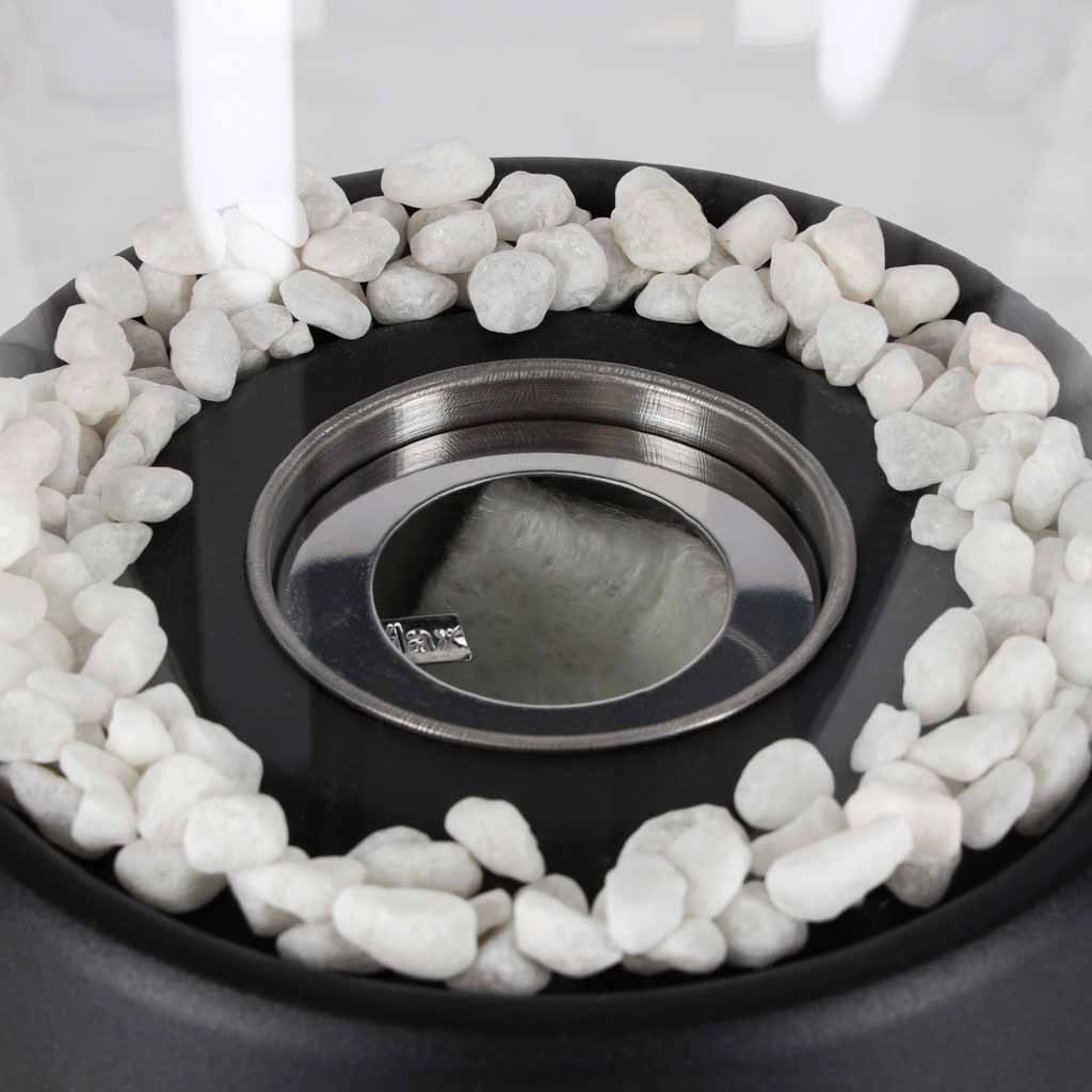 Črna minimalistična podlaga, cilindrično kaljeno steklo in dekorativni kamenčki ustvarjajo sodoben dodatek, ki se poda v vsak interier.