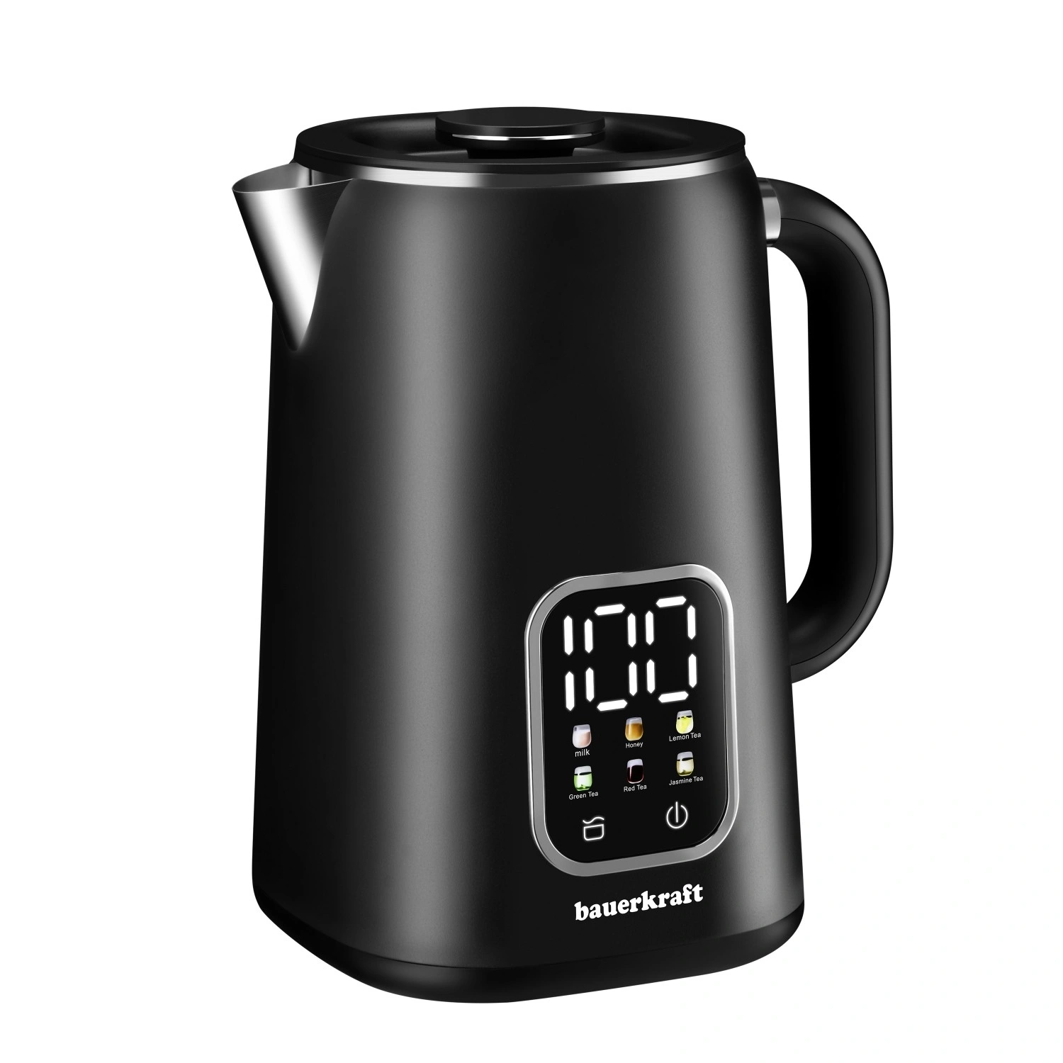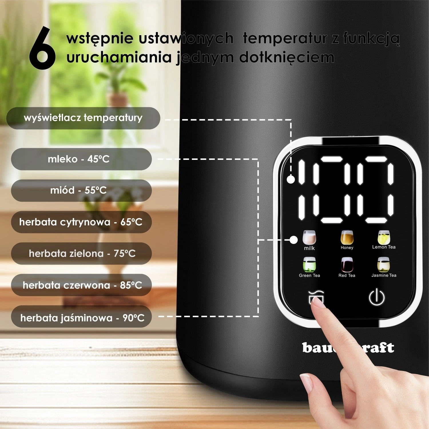 Uživajte v hitri in natančni pripravi napitkov s pametnim grelnikom in upravljanjem na dotik. Vnaprej nastavljene temperature omogočajo izbiro idealnega segrevanja za različne vrste čajev, kavo, mleko ali med. Dvojna stena povečuje varnost, površina je na otip hladnejša, voda pa dlje ostane vroča. Zahvaljujoč prostornini 1,7 l zlahka postrežete vso družino.
