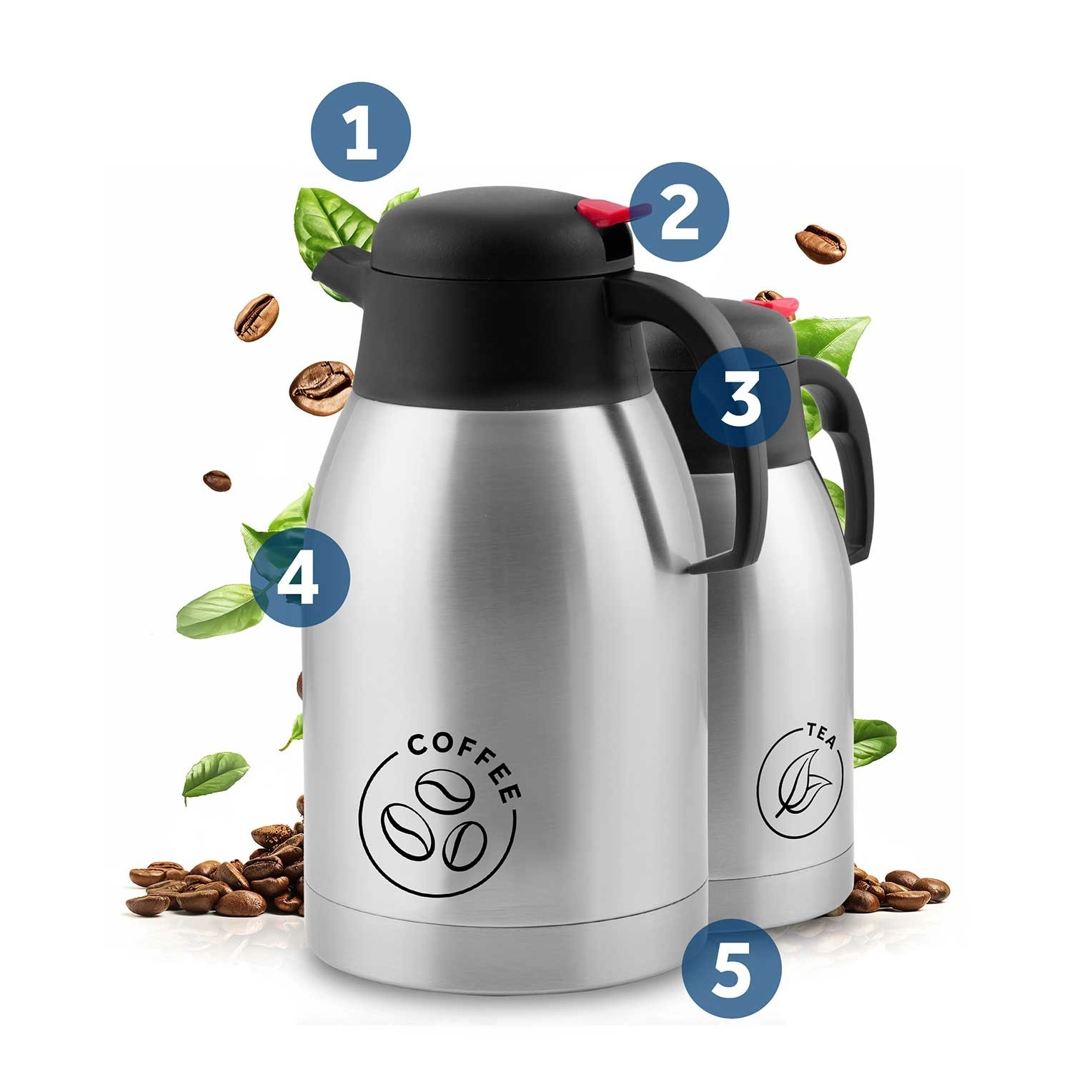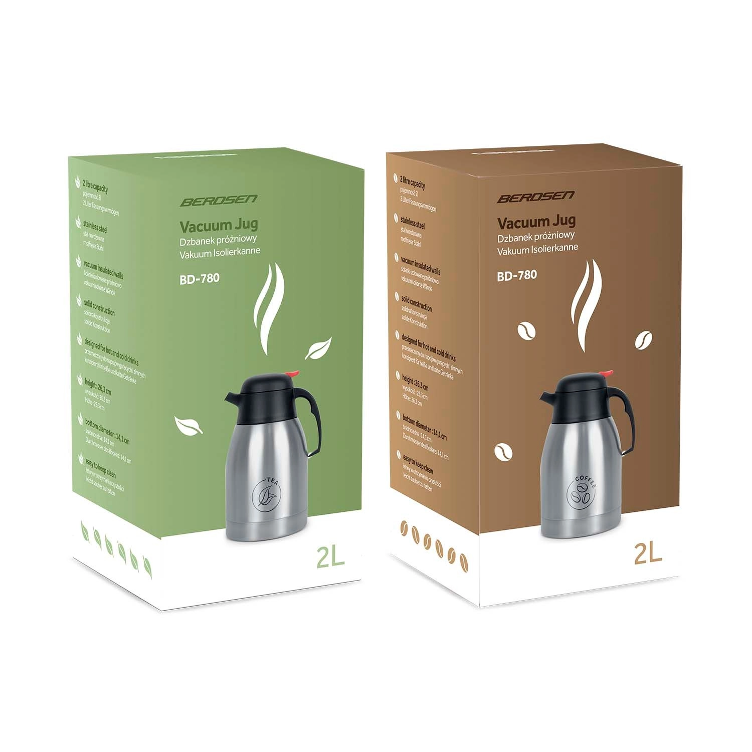 Komplet vsebuje dve termovki s prostornino 2 l: eno z napisom COFFEE in drugo TEA. Idealno za dom, pisarno in catering – napitke boste zlahka razlikovali in stregli brez zamenjav.