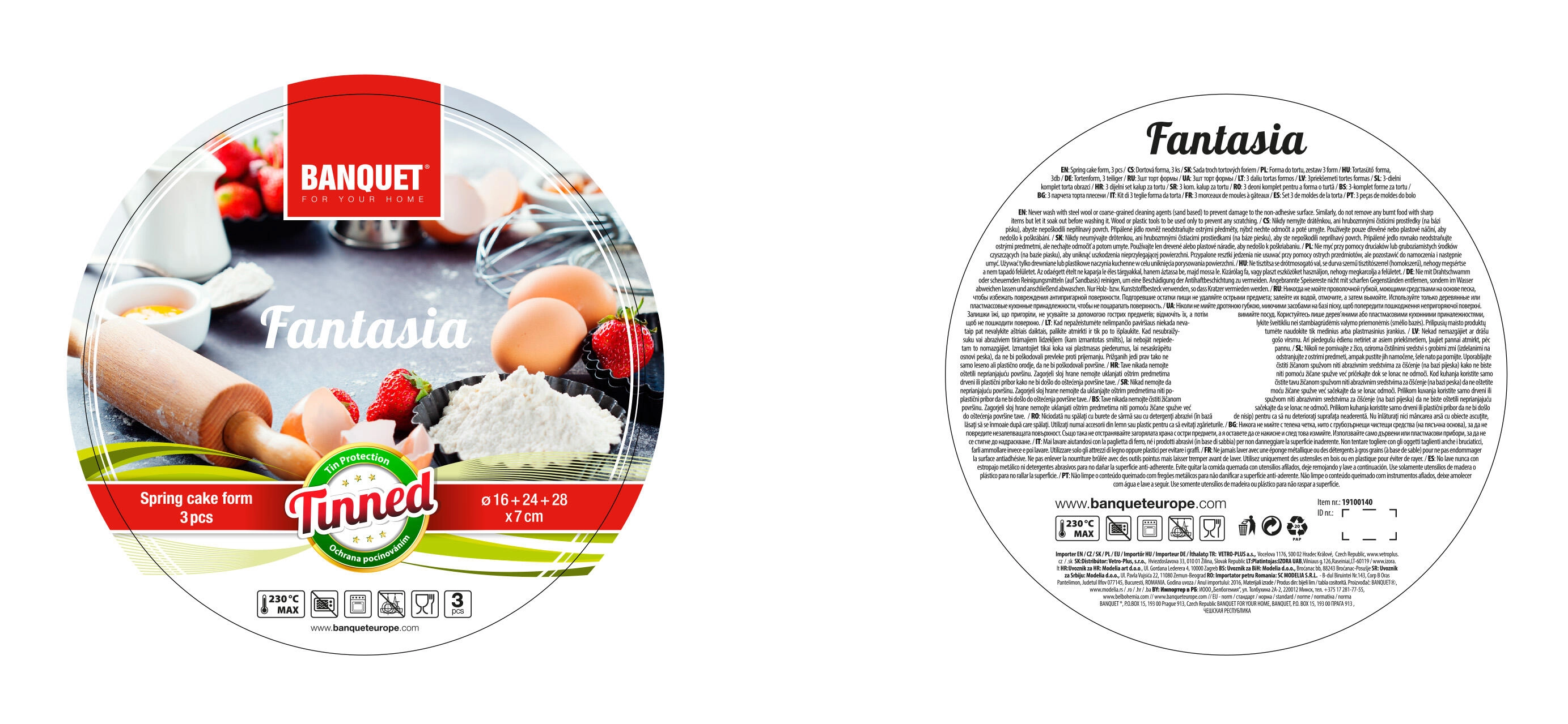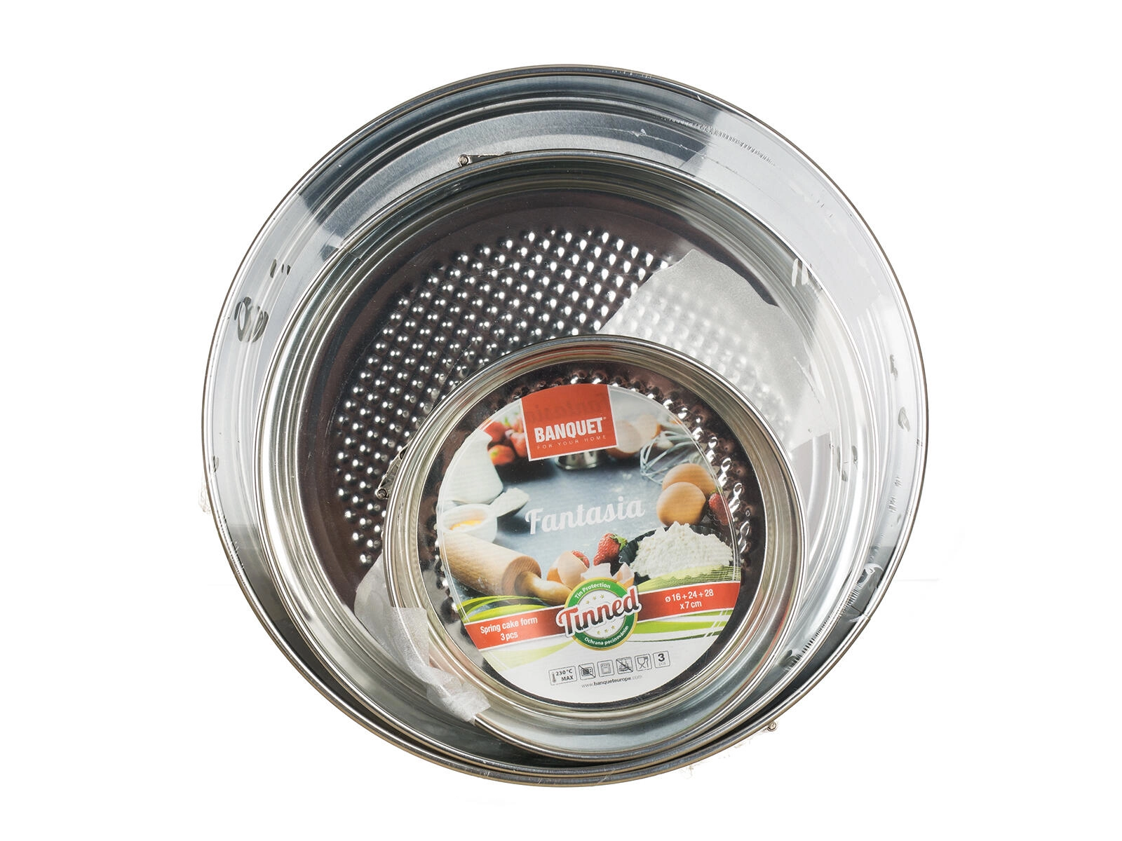 Praktičen komplet treh razstavljivih tortnih modelov FANTASIA s premeri 16, 24 in 28 cm iz pocinkanega kovinskega materiala, višine 7 cm. Idealno za peko tort in cheesecakeov v električni, plinski in ventilacijski pečici. Trpežen material omogoča uporabo tudi kovinskega pripomočkov in olajša odstranitev biskvita zahvaljujoč stranski sponki.