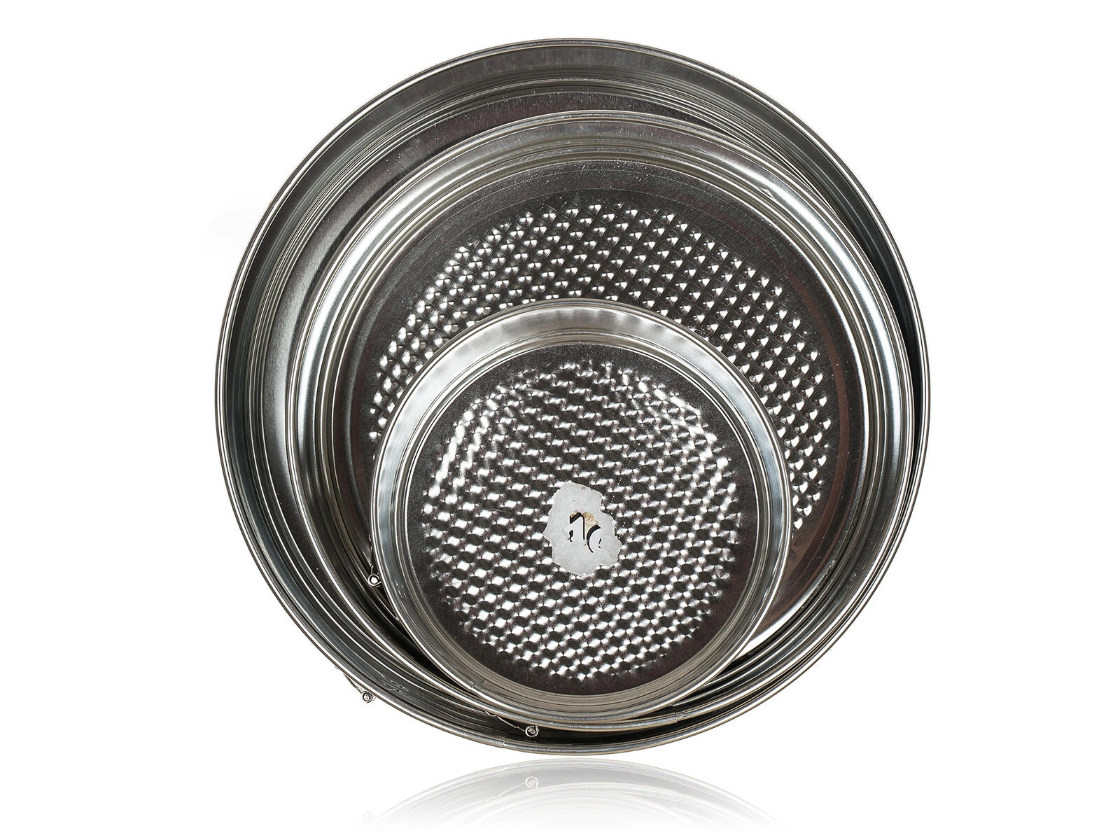 Set vključuje premere 16 cm, 24 cm in 28 cm, vse z višino 7 cm, zato boste vedno izbrali idealno velikost. Modeli so primerni za električne, plinske in ventilacijske pečice, niso primerni za pomivalni stroj ali mikrovalovno pečico.
