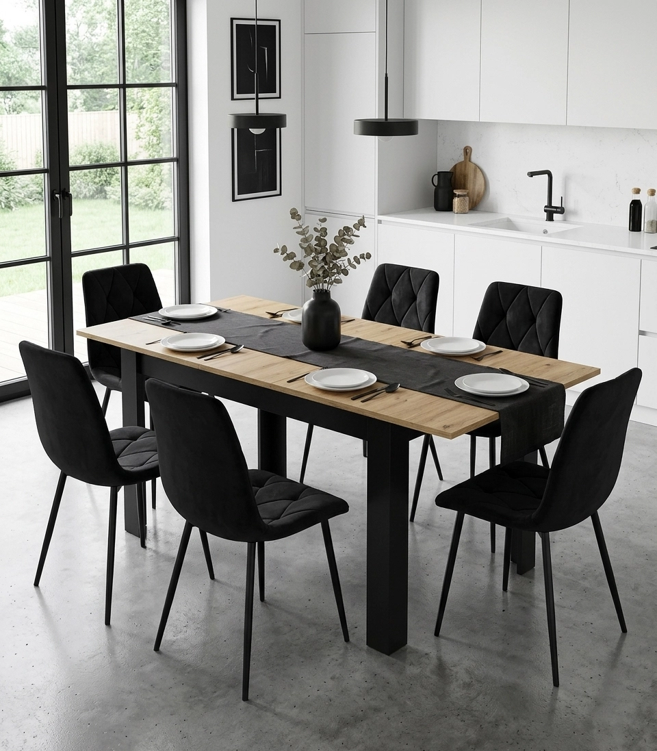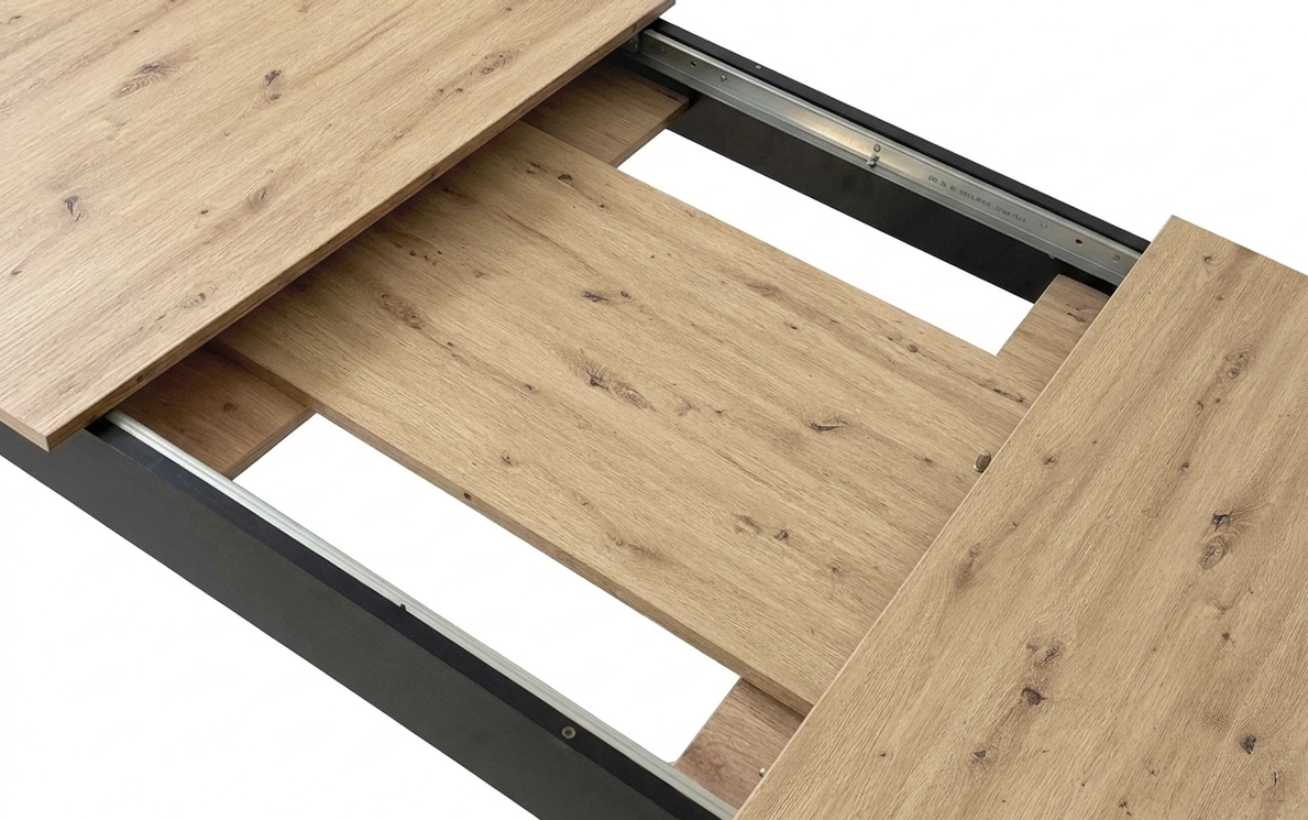 Stilska jedilna miza z raztegljivo ploščo z 120 na 160 cm nudi udoben prostor za 4–6 oseb. Kombinacija dekorja hrast artisan in črnih nog se poda tako modernim kot loftovskim interierjem. Odporna MDF plošča s PVC furnirjem je enostavna za vzdrževanje in odporna proti praskam, medtem ko stabilna konstrukcija zagotavlja zanesljivost pri vsakodnevni uporabi. Praktičen vložek, shranjen pod ploščo, omogoča bliskovito razširitev ob obiskih.