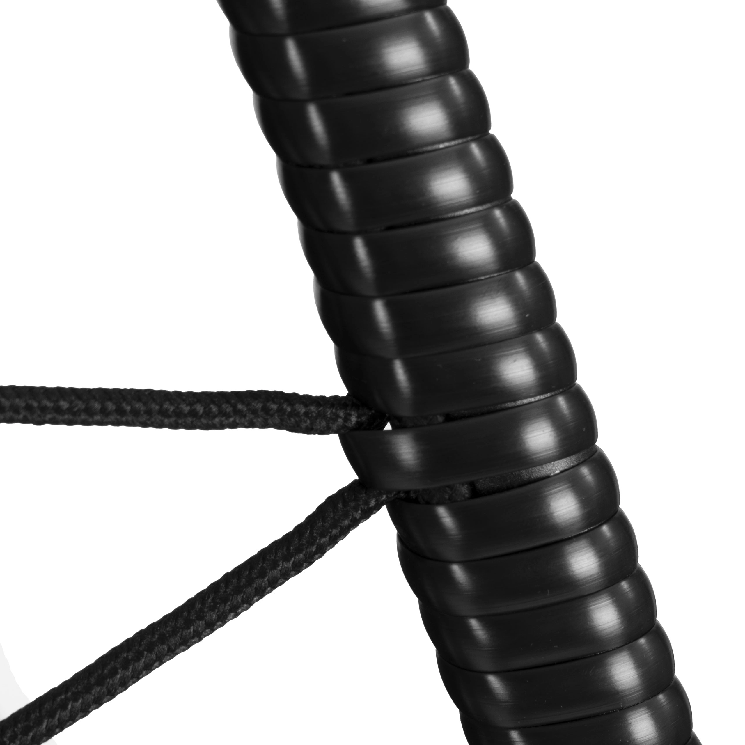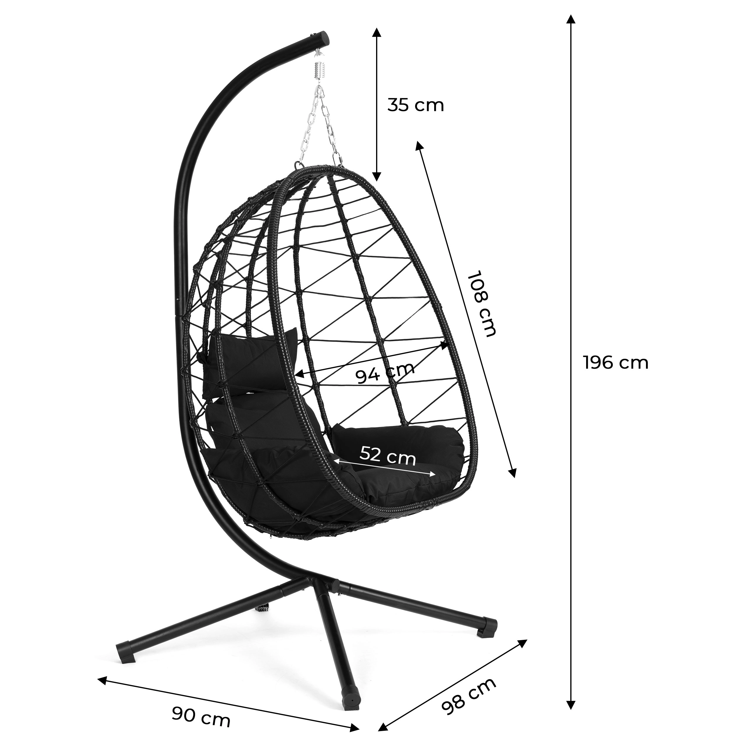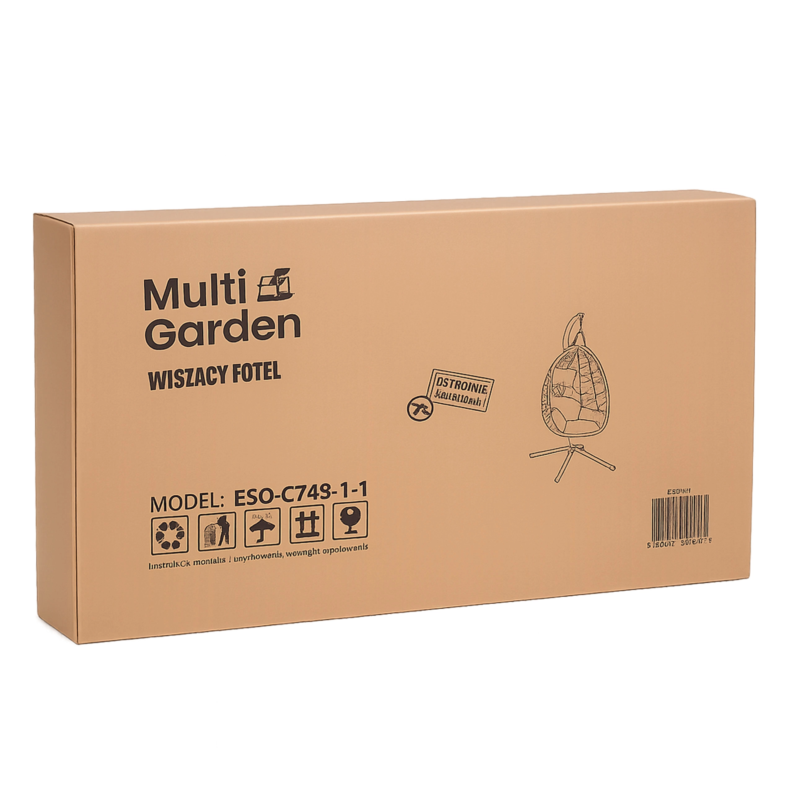 Robusten jeklen okvir obdan s tehno-ratanom je odporen na UV-sevanje, vlago in spremenljive vremenske pogoje. Veriga z vzmetjo zagotavlja gladko in tiho zibanje ter zmanjšuje obremenitev konstrukcije. Štirinožna osnova s protizdrsnimi nastavki stabilno stoji tudi na manj ravni podlagi in ščiti tla pred praskami.